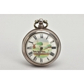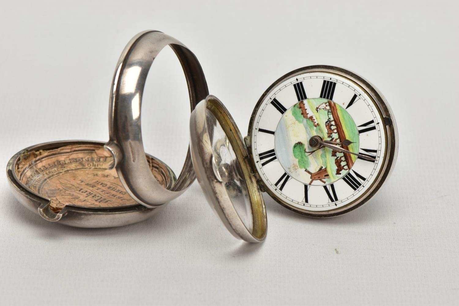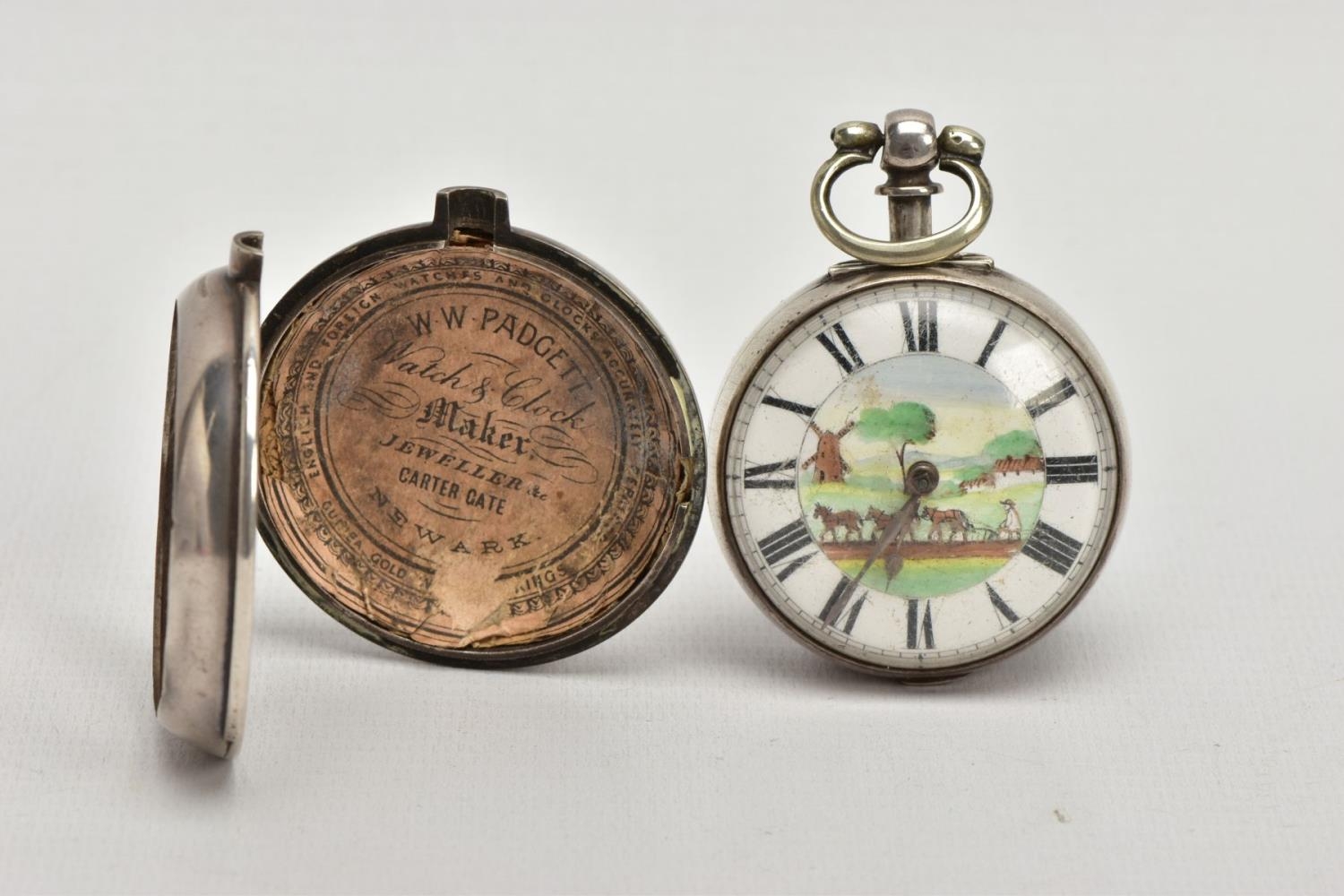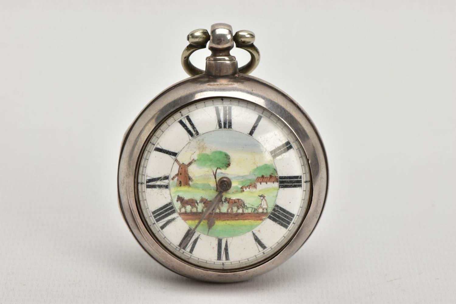 A PAIR CASED 'FARMERS VERGE' OPEN FACE POCKET WATCH, round white ceramic dial hand painted with a farming scene, Roman numerals, white metal hands, within a plain polished silver case, case back hallmarked London 1869, movement signed 'Brown Newark N55873, approximate case width 48.1mm, outer plain polished case has some damage to the reverse, also hallmarked London 1869, approximate total gross weight 141.0 grams (condition report: some slight surface scratches to the glass, dial in good condition, the outer case has a large split and dents to the back, some slight tarnishing in places, not tested)