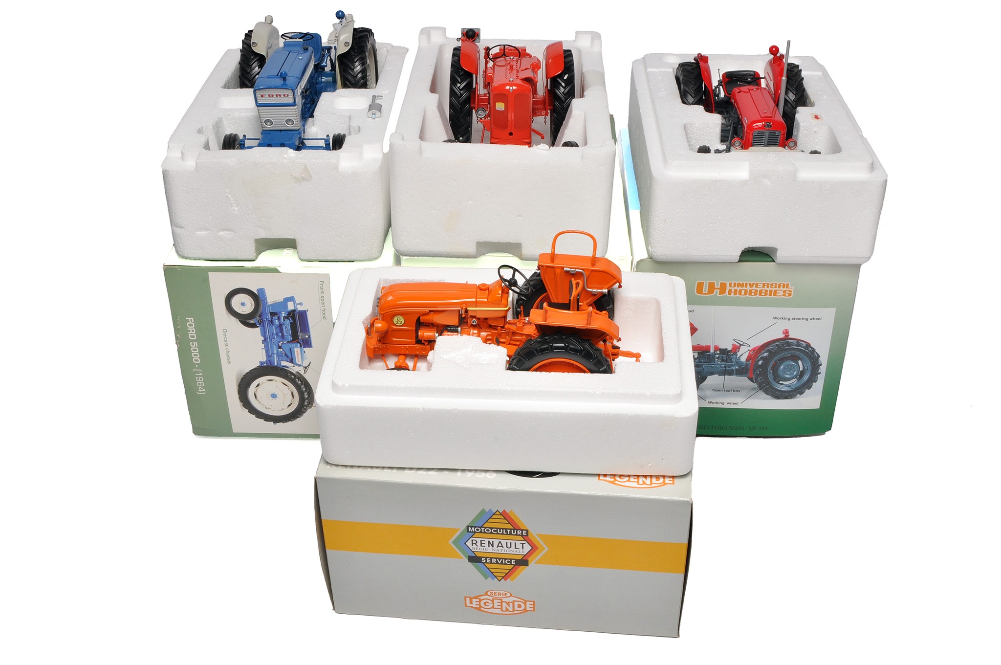 A group of 4 x Universal Hobbies 1/16 farm model issues comprising Ford 5000 (exhaust broken off), Nuffield Universal (Missing box inner plus some faults), Massey Ferguson 35x Tractor (no obvious sign of fault) and Renault D22 (No faults).