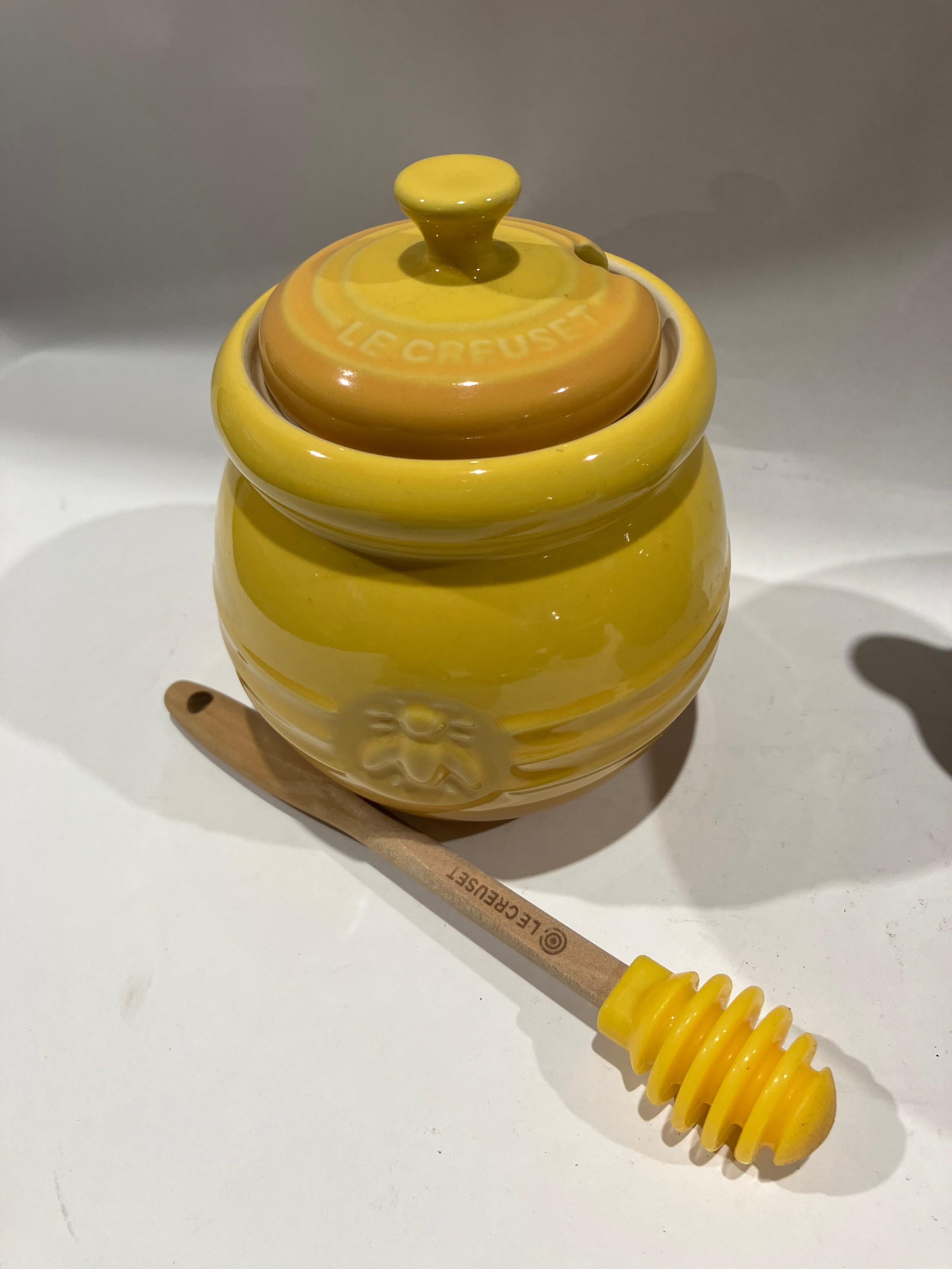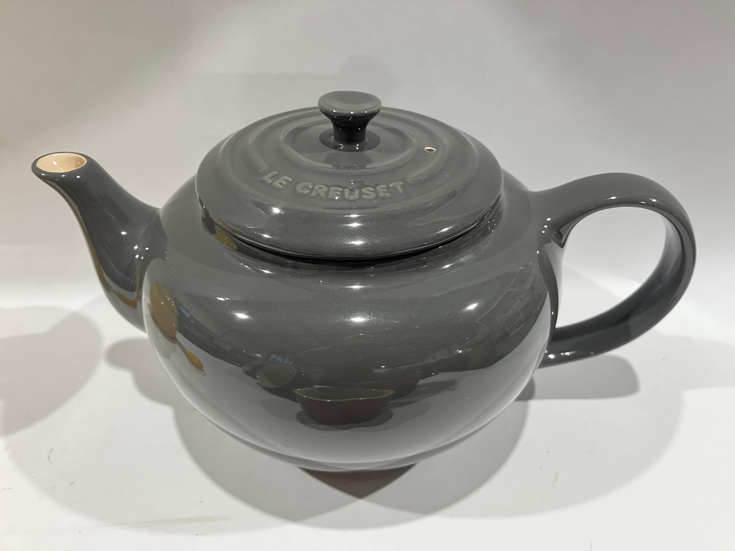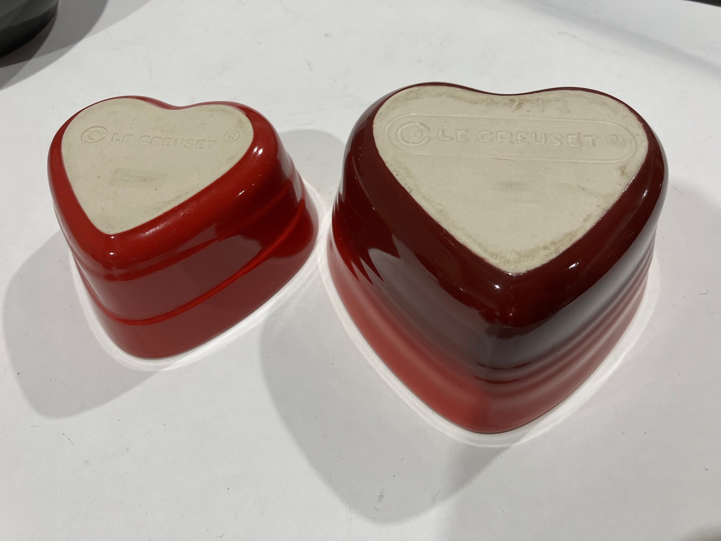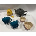 A selection of Le Creuset ceramics including teapot, cups, honeypot and heart form dishes