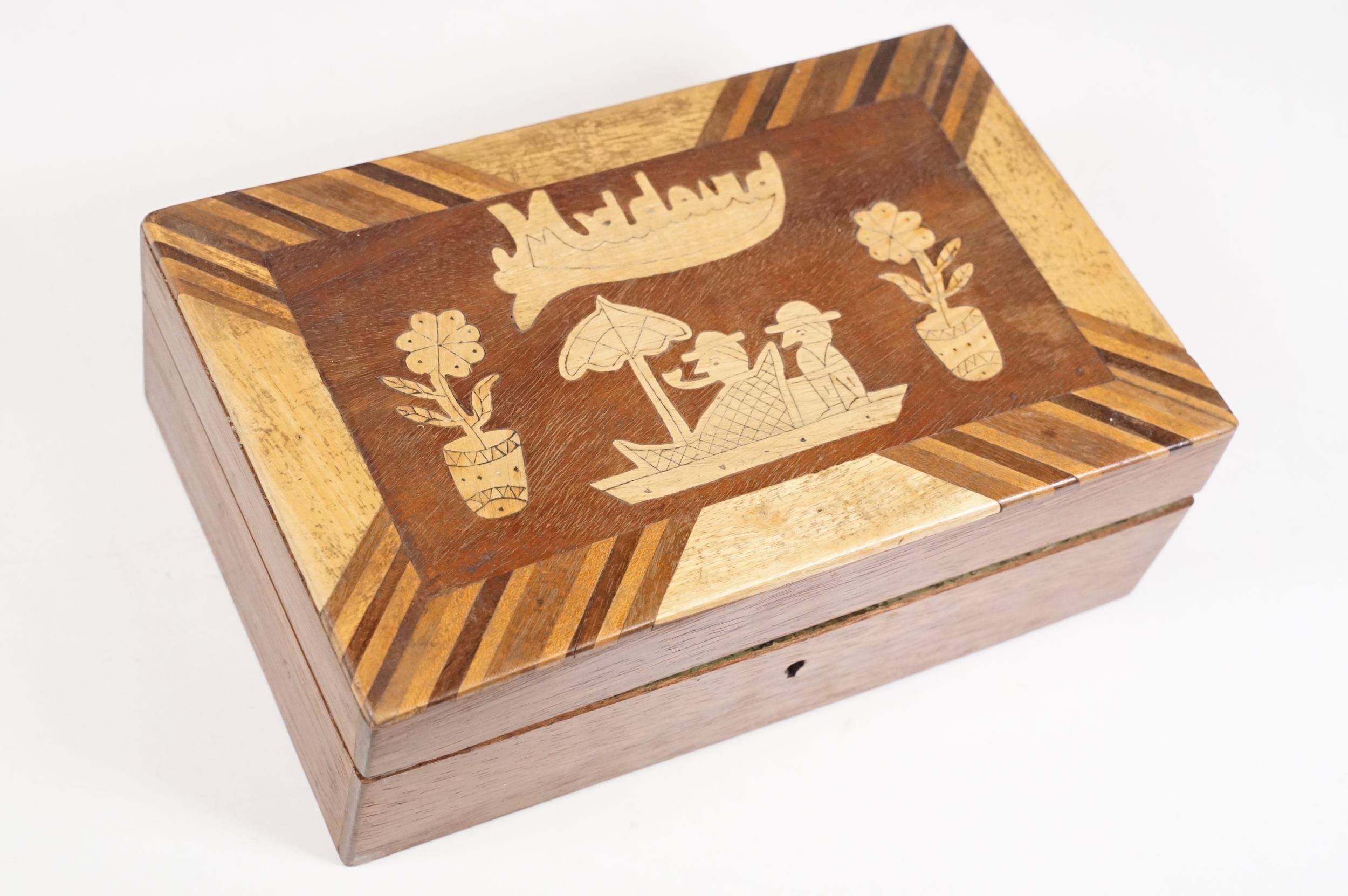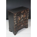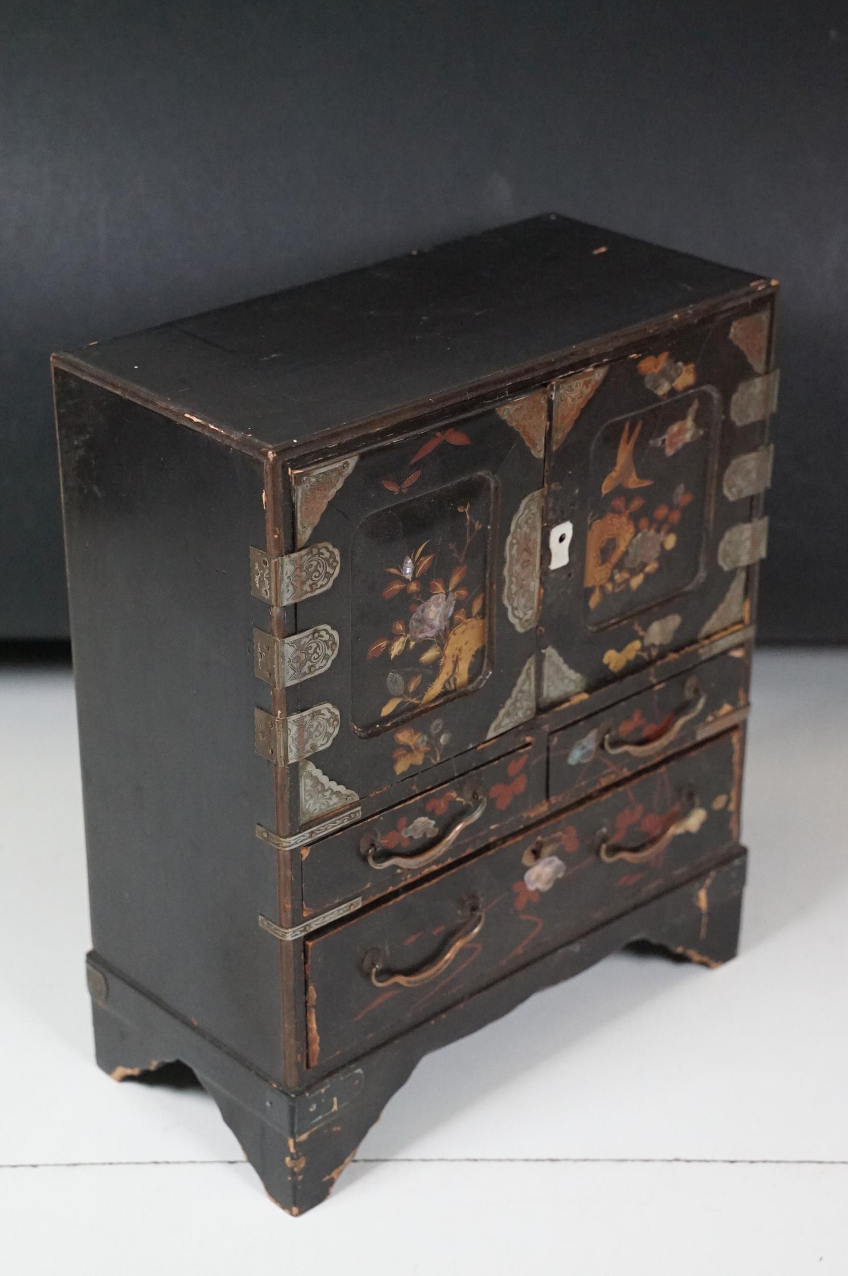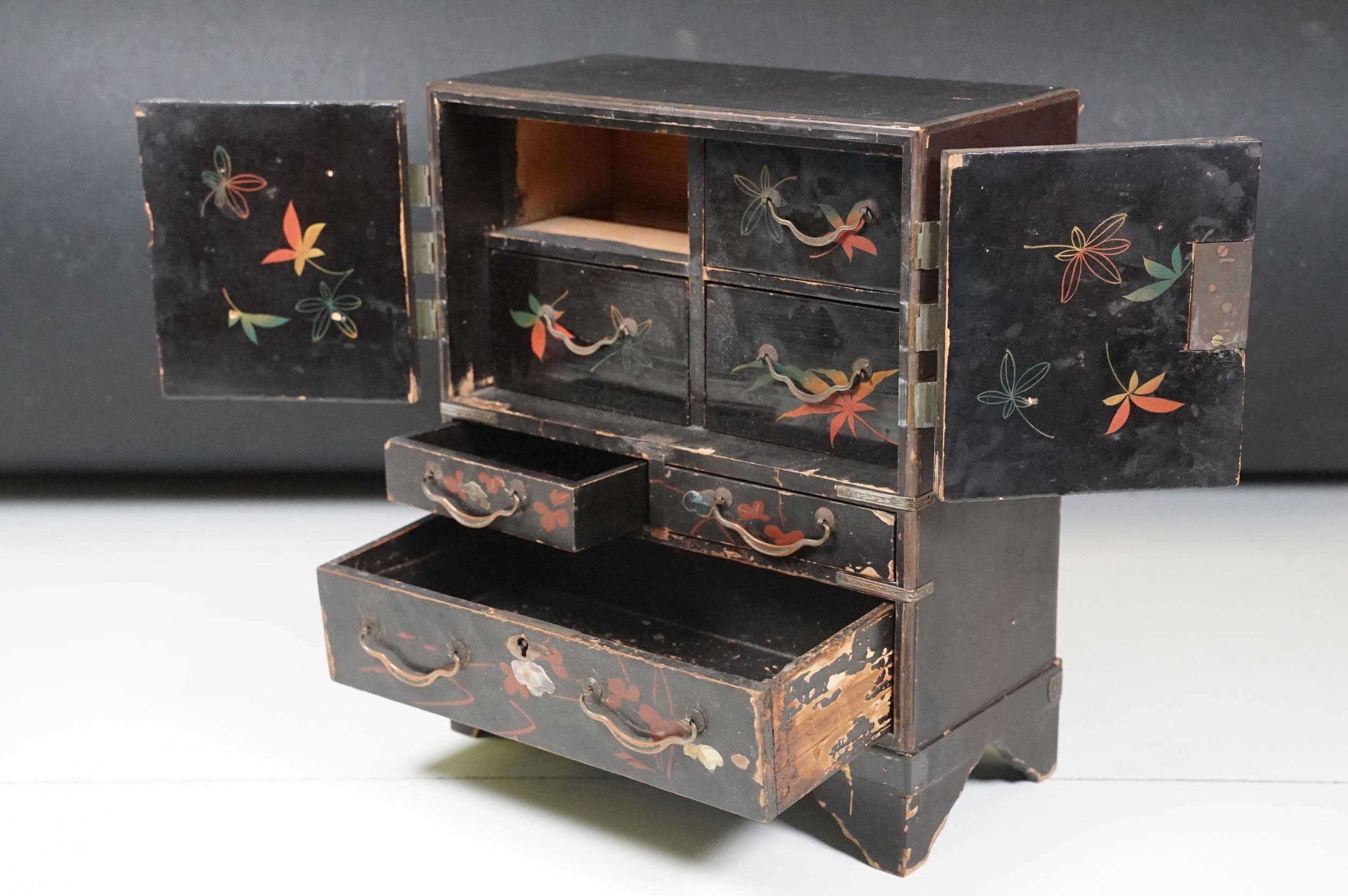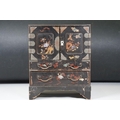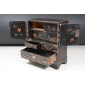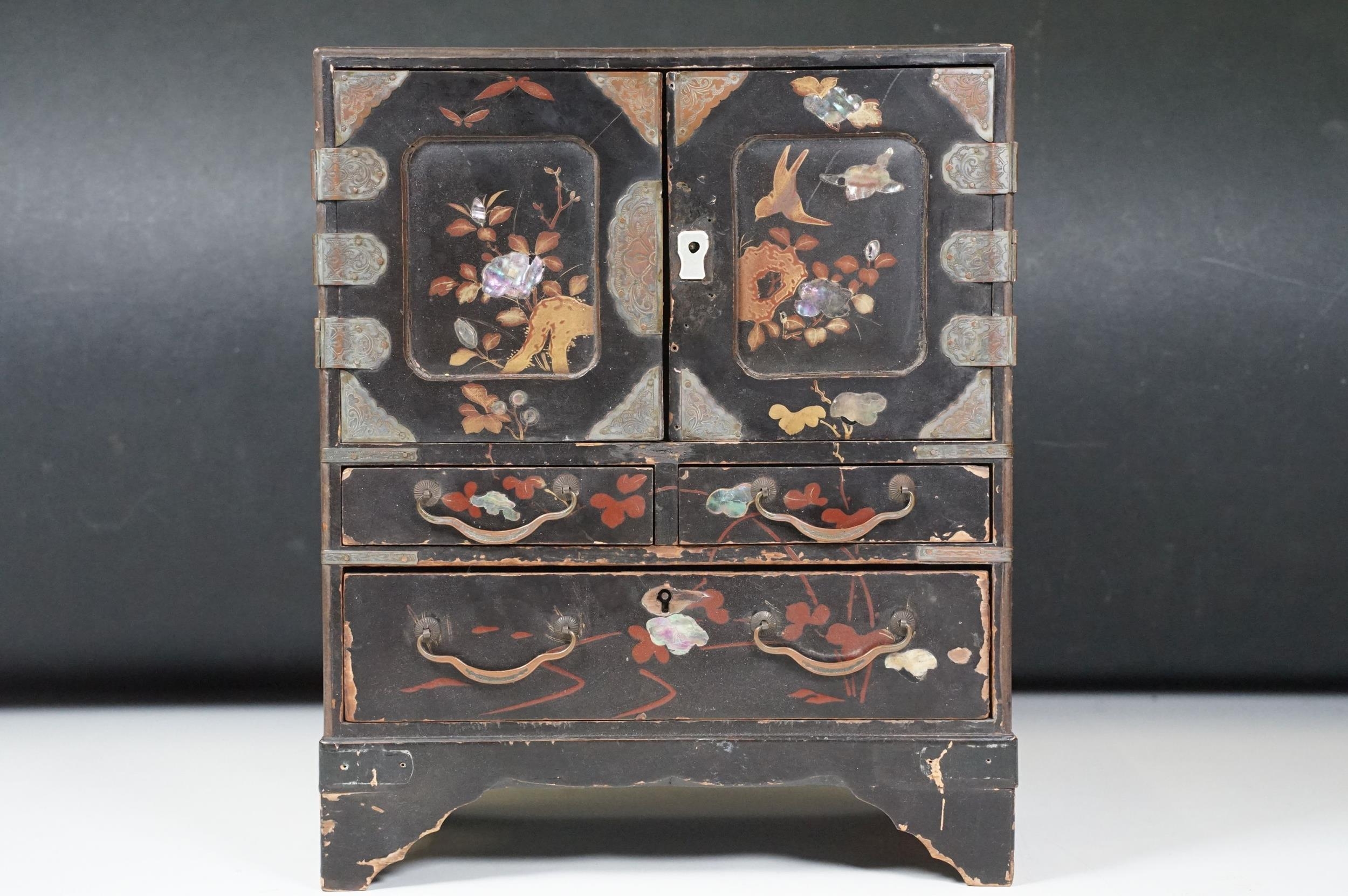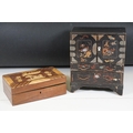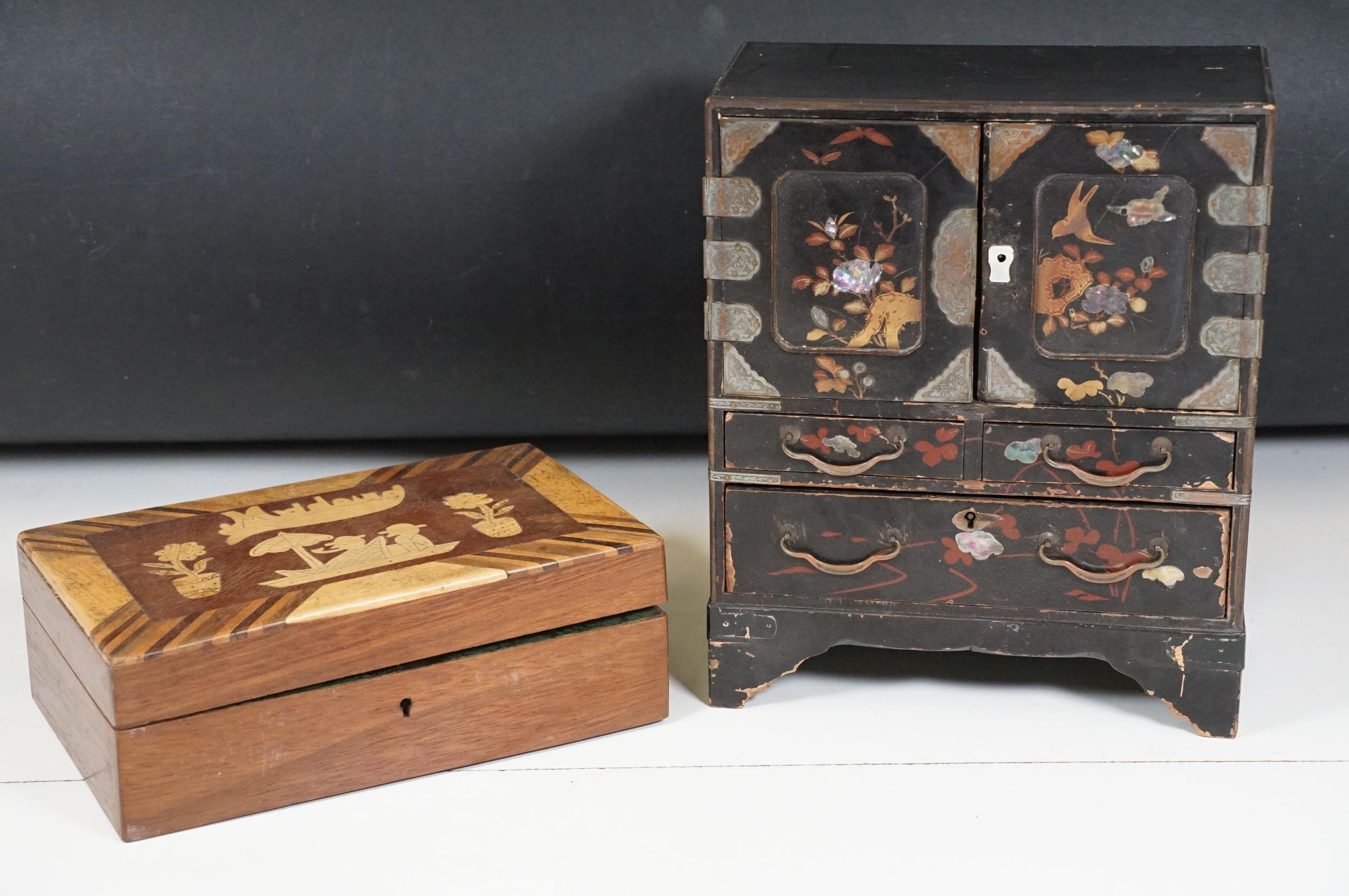 Two wooden cabinets to include Chinese black lacquered jewellery cabinet with mother of pearl inlay and inlaid Madeira wooden jewellery and sewing box