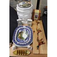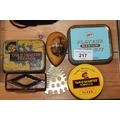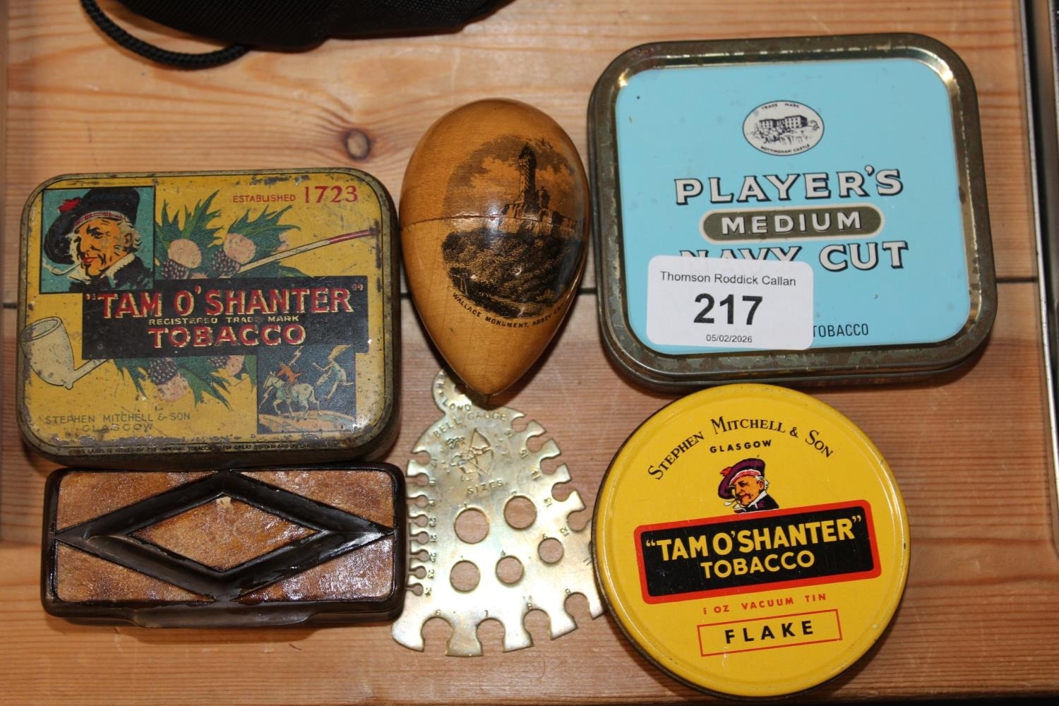 Antique horn snuff box, a Mauchline ware egg box with Wallace Monument vignette, an H Walker of London bell gauge, and three vintage tobacco tins.