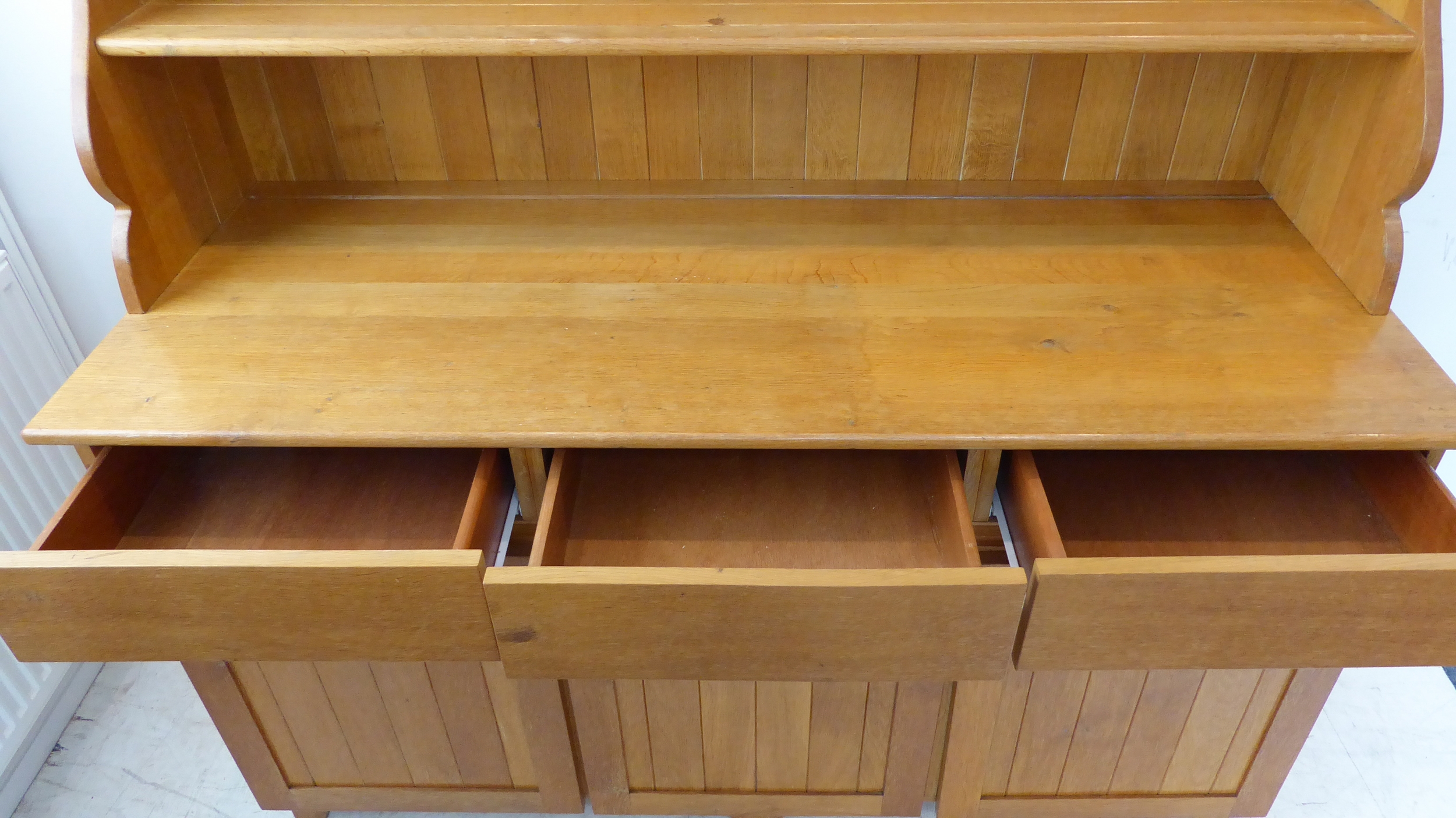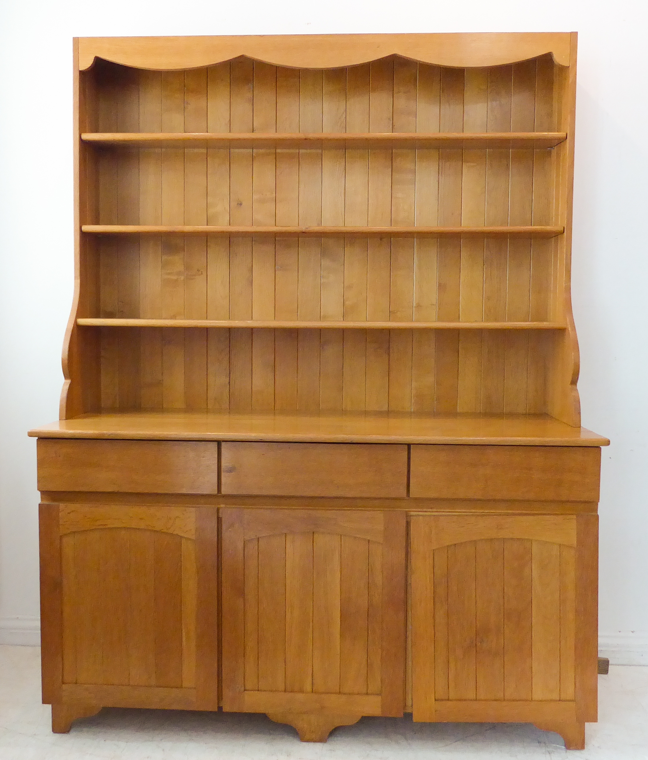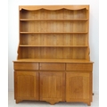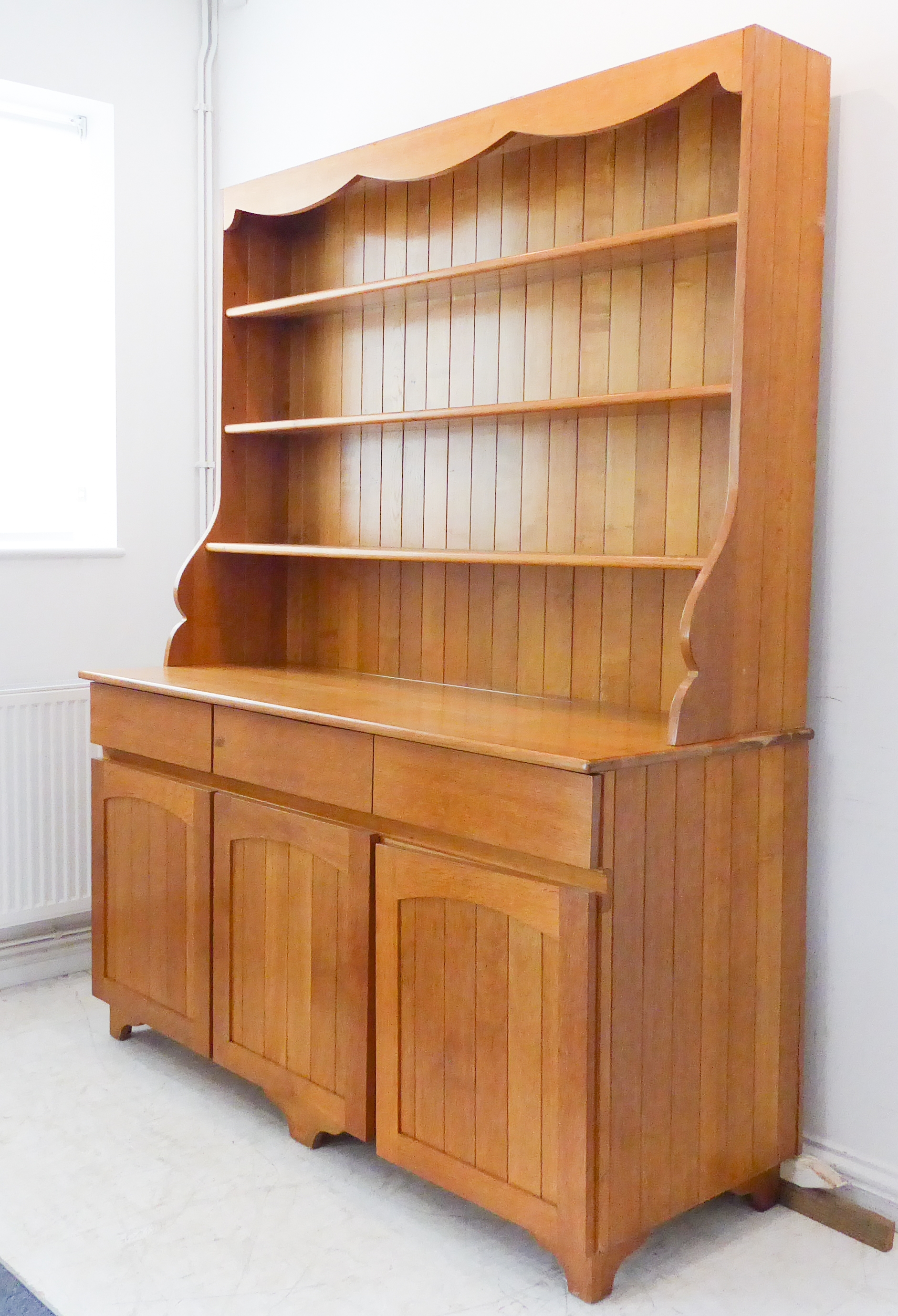 A large and modern light oak dresser; the shelved superstructure above the base with three flush drawers and three arched slatted panelled doors below enclosing shelves, raised on recessed shaped bracket style feet (153cm wide x 60cm deep x 201.5cm high)