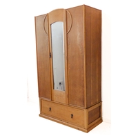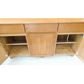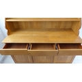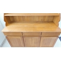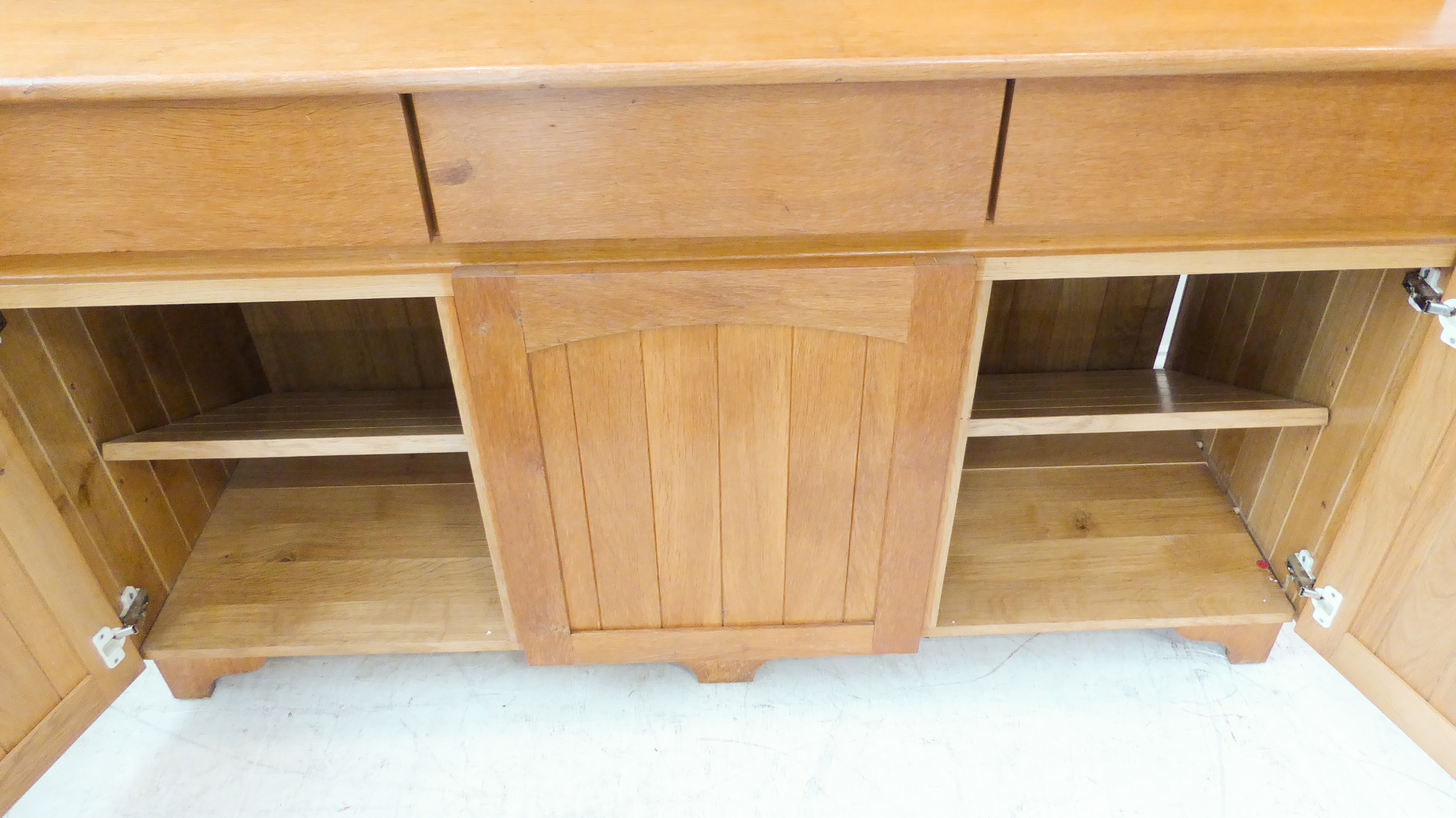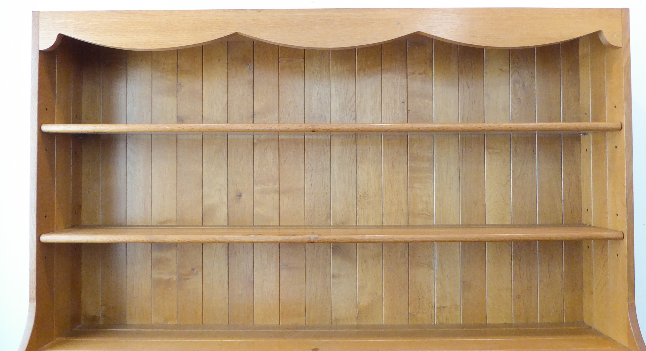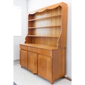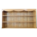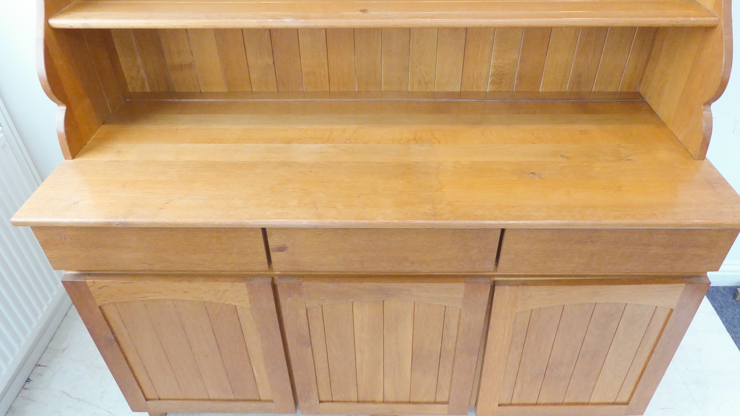 A large and modern light oak dresser; the shelved superstructure above the base with three flush drawers and three arched slatted panelled doors below enclosing shelves, raised on recessed shaped bracket style feet (153cm wide x 60cm deep x 201.5cm high)