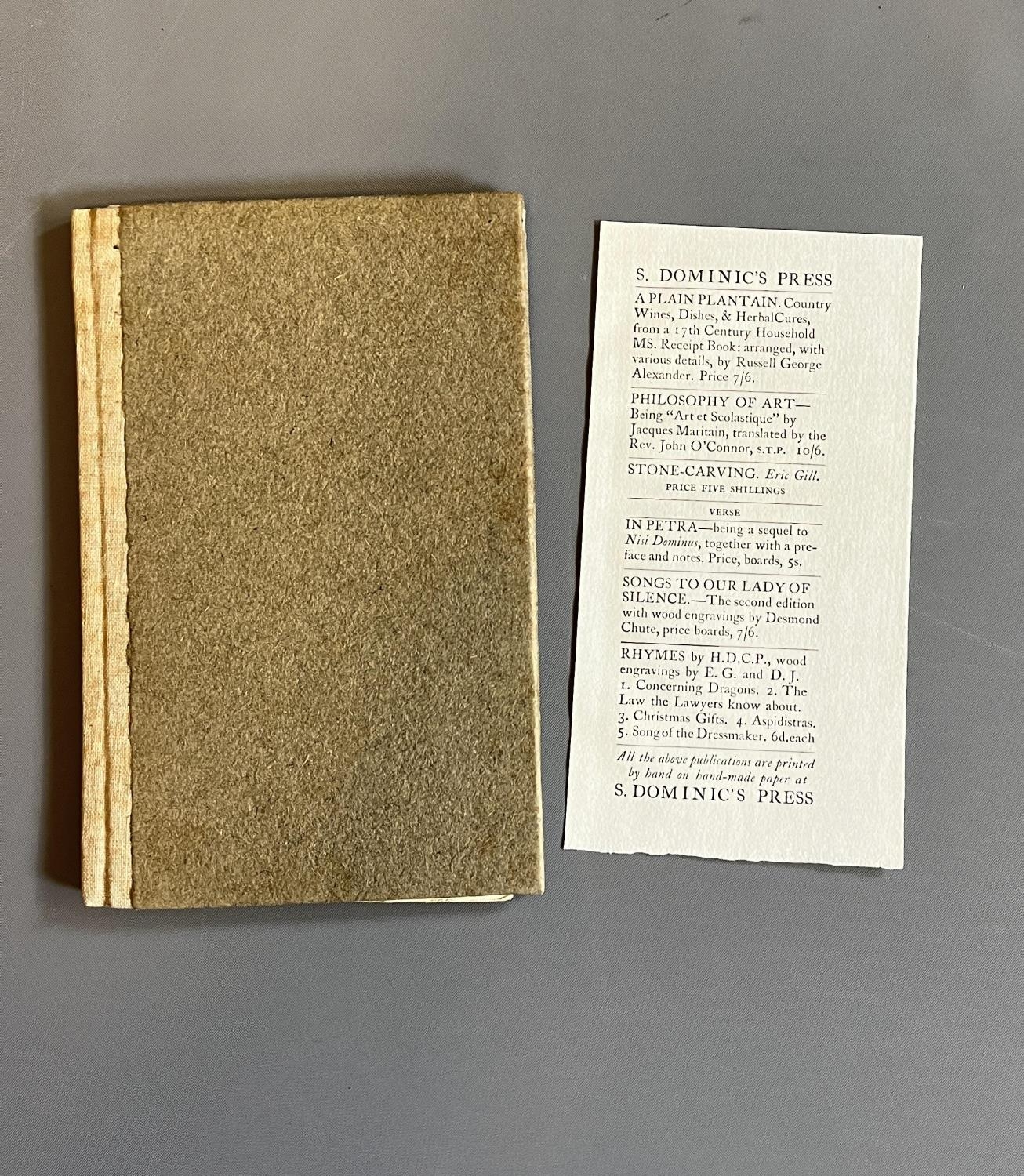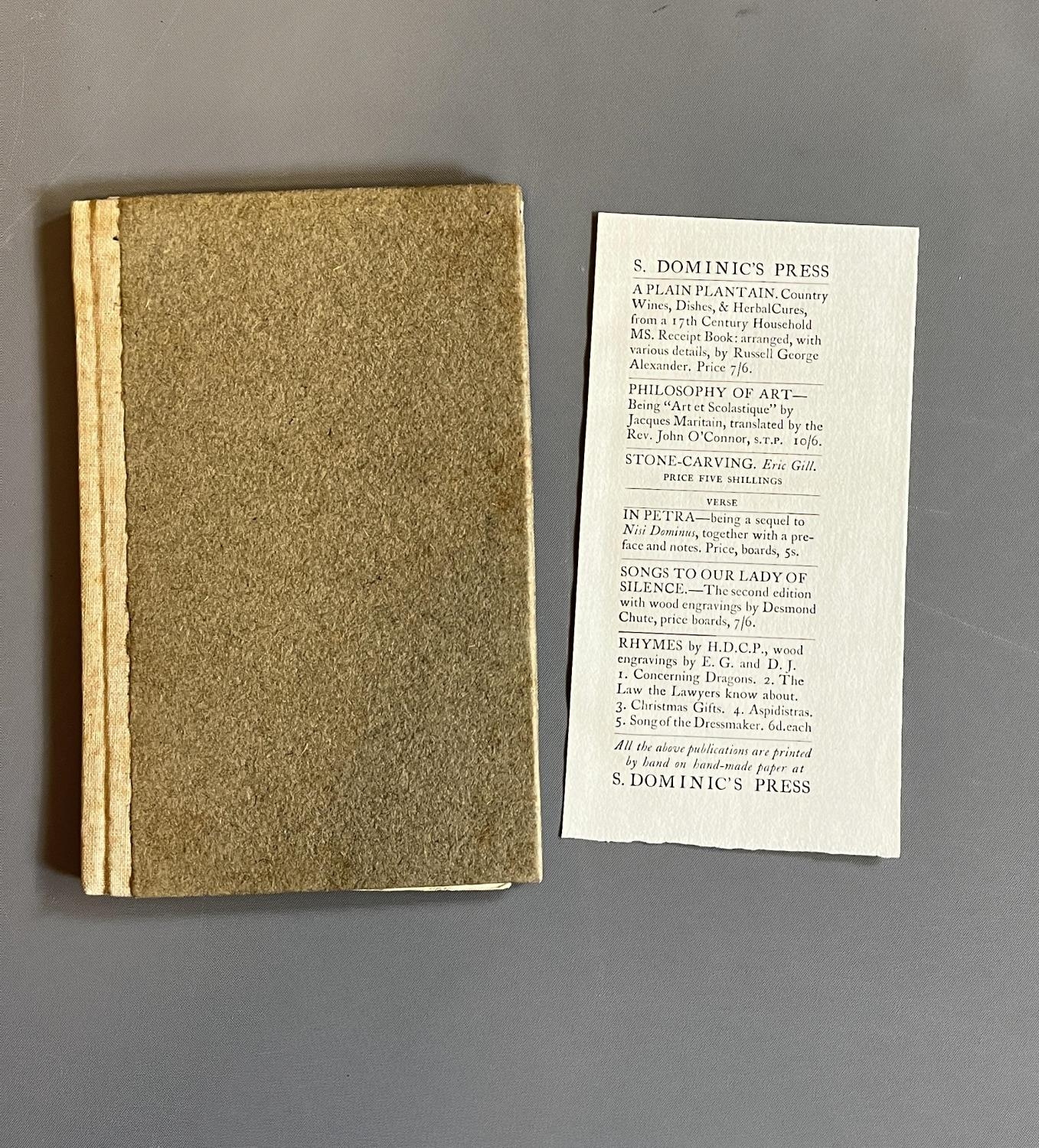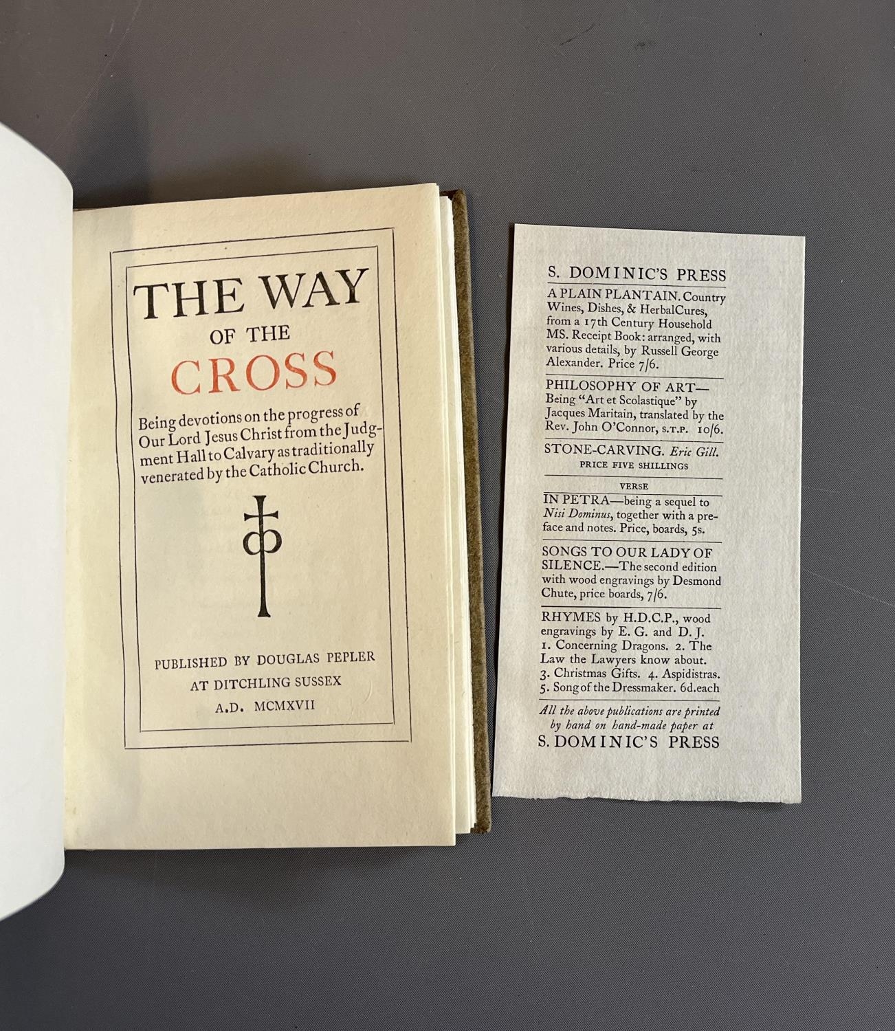 THE WAY OF THE CROSS, published by Douglas Pepler at Ditchling, 1917, quarter tan buckram over paper-covered boards, illustrated by Eric Gill with a flyer for St Dominics Press laid in. Ernest F Hill copy (Est. plus 20% premium)