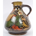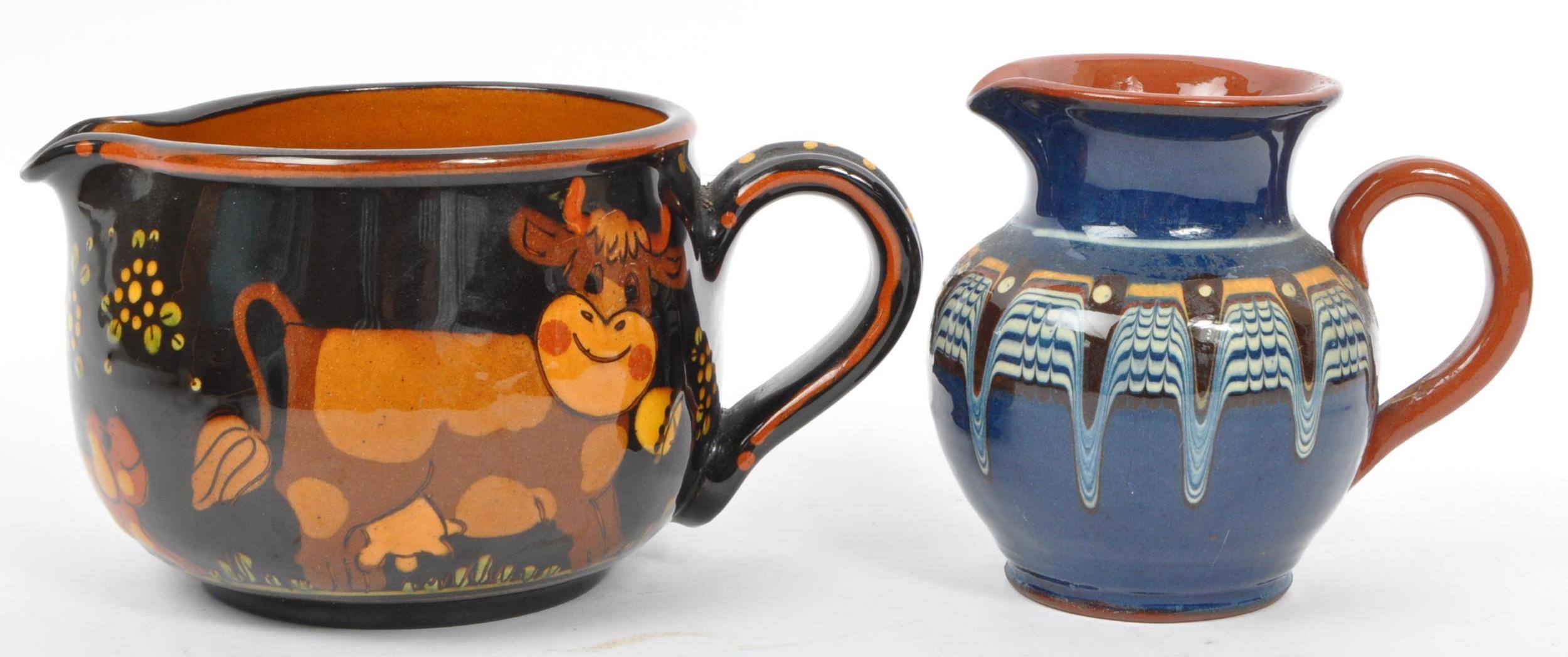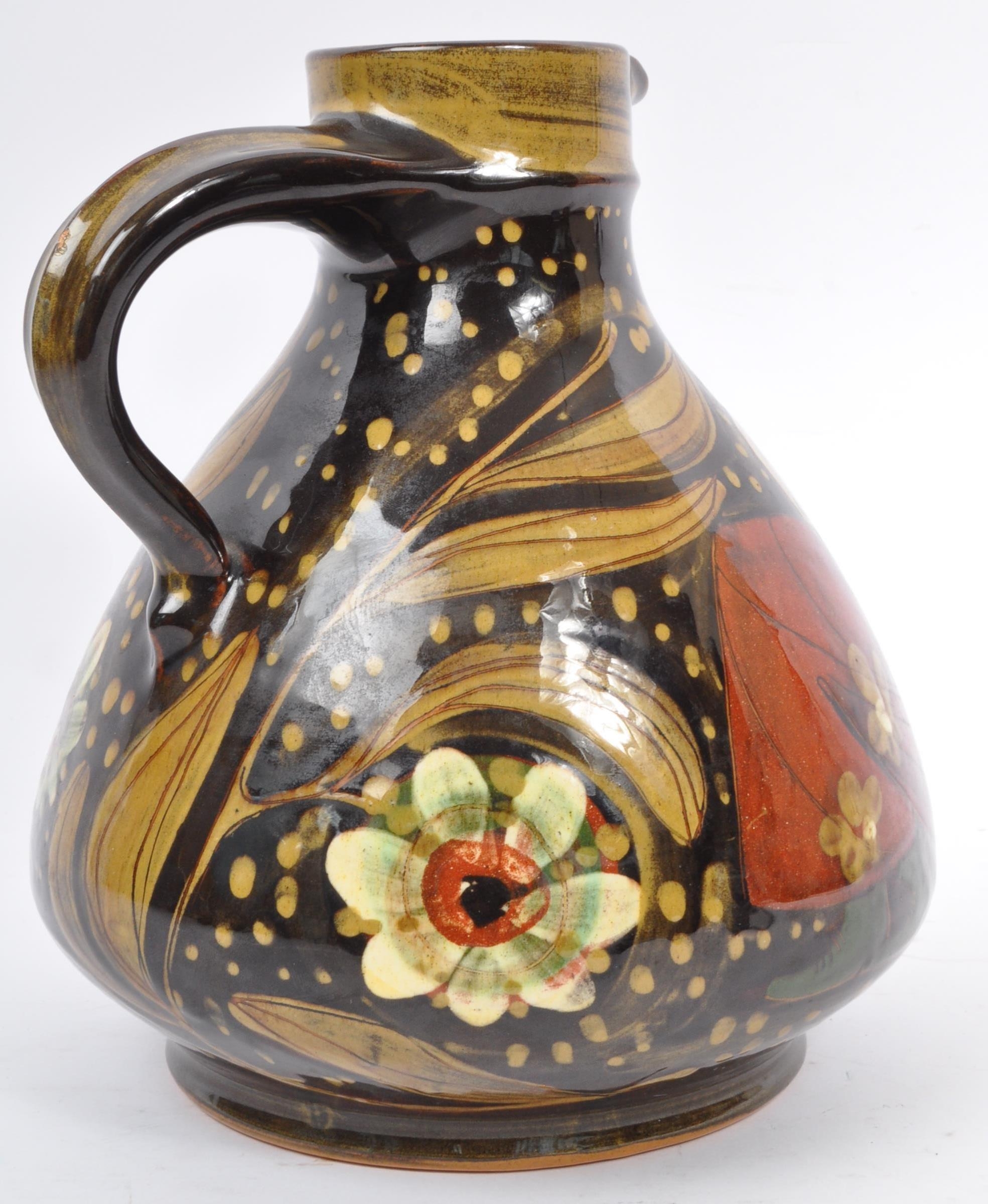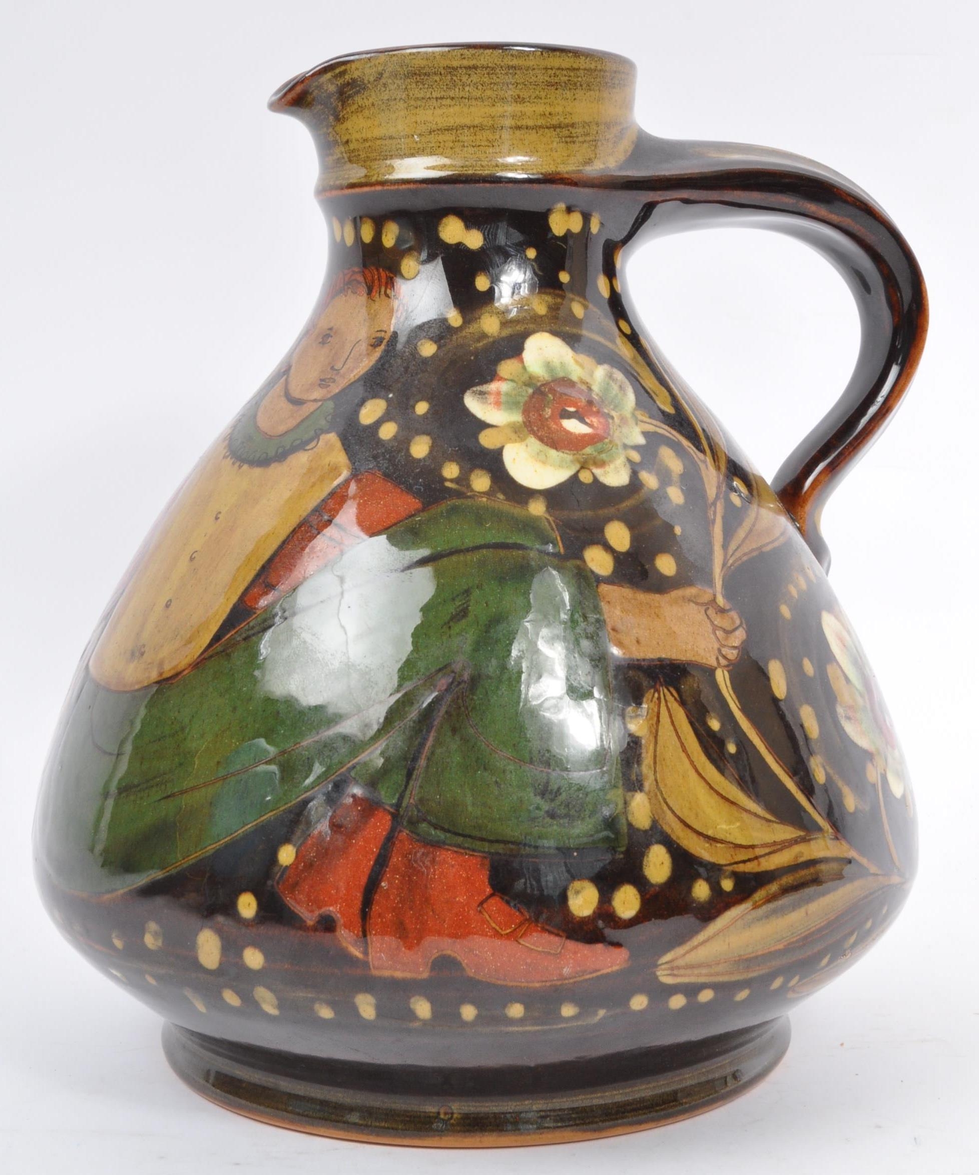 A large Continental ceramic glazed Hans Schneider Folk Art pottery jug of bulbous form together with a Torquay ware creamer and another large decorative creamer jug decorated with sheep and marked Pisi to base