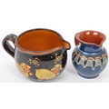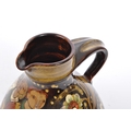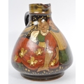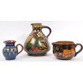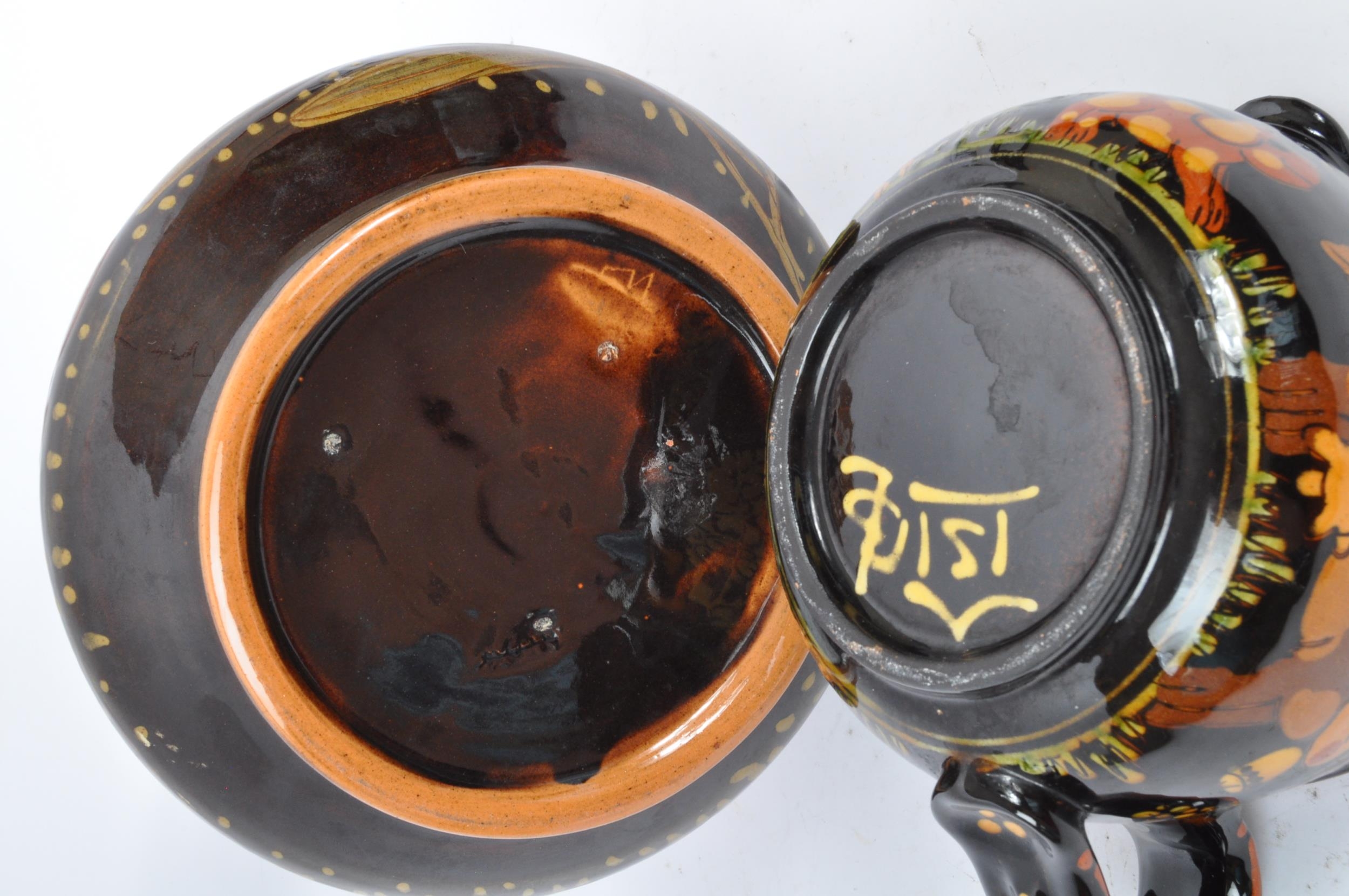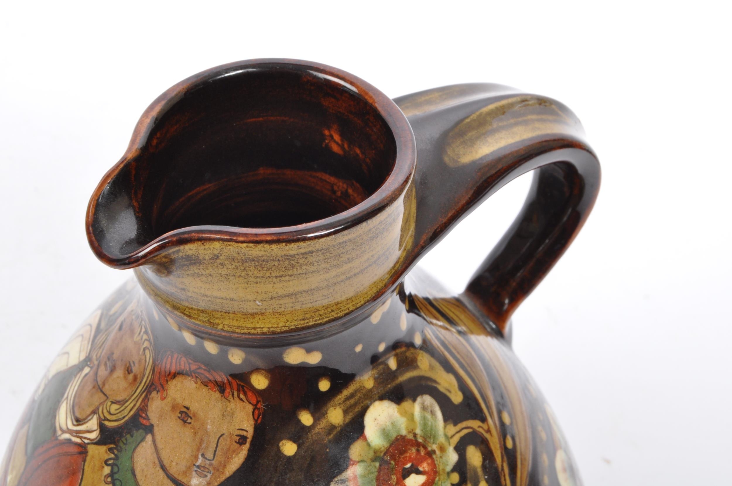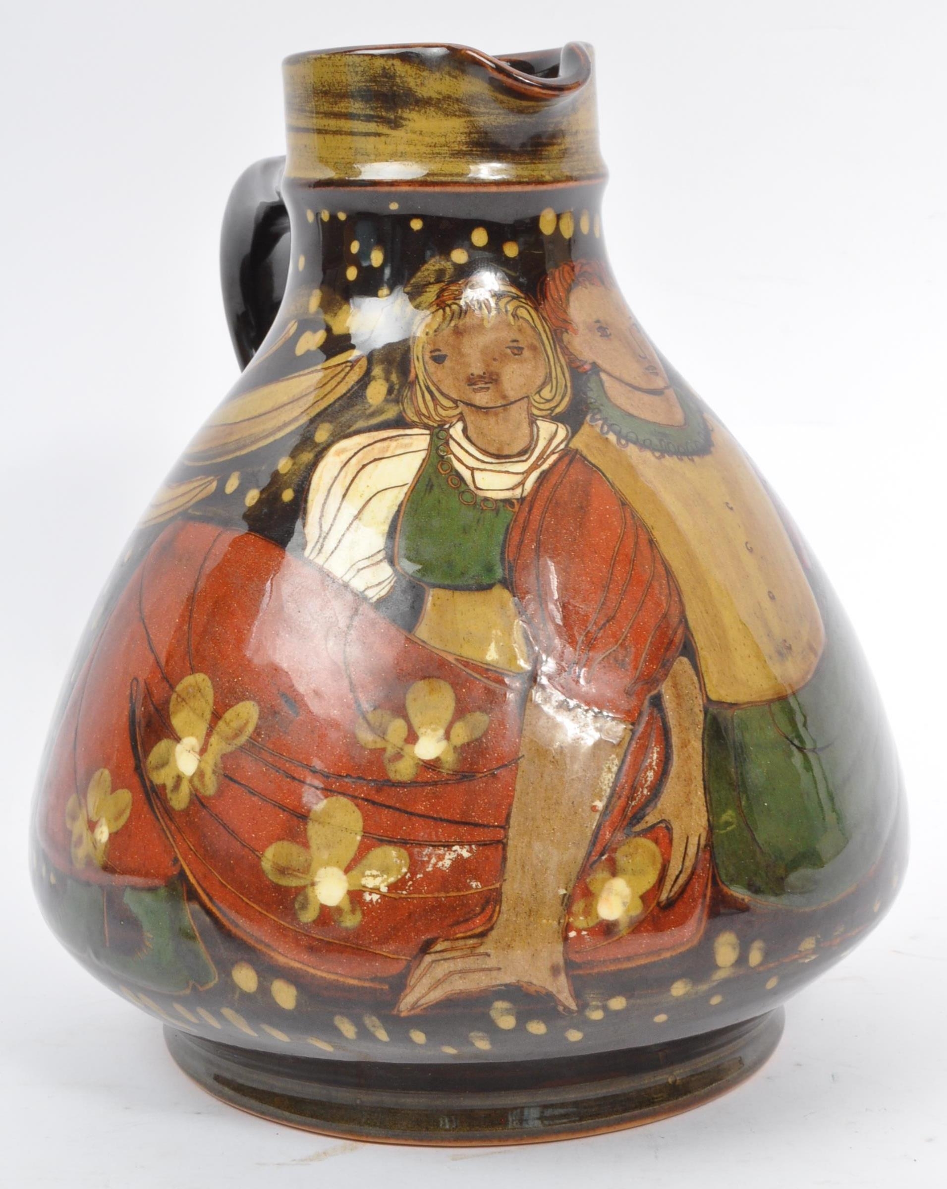 A large Continental ceramic glazed Hans Schneider Folk Art pottery jug of bulbous form together with a Torquay ware creamer and another large decorative creamer jug decorated with sheep and marked Pisi to base