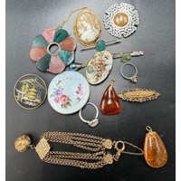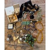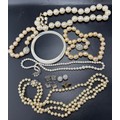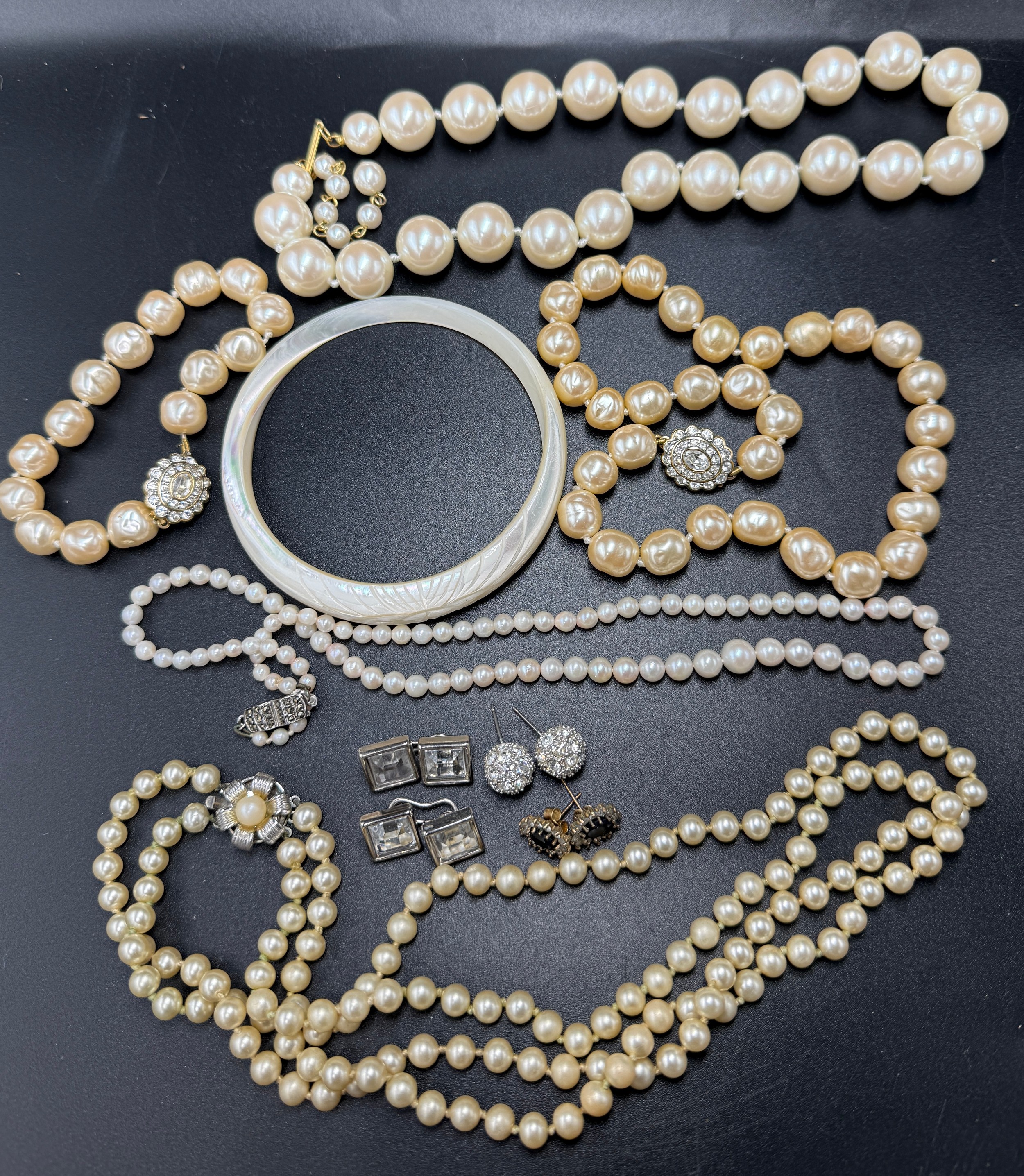 Costume jewellery to include simulated pearl necklaces and bracelet, mother of pearl bangle, earrings and cufflinks.