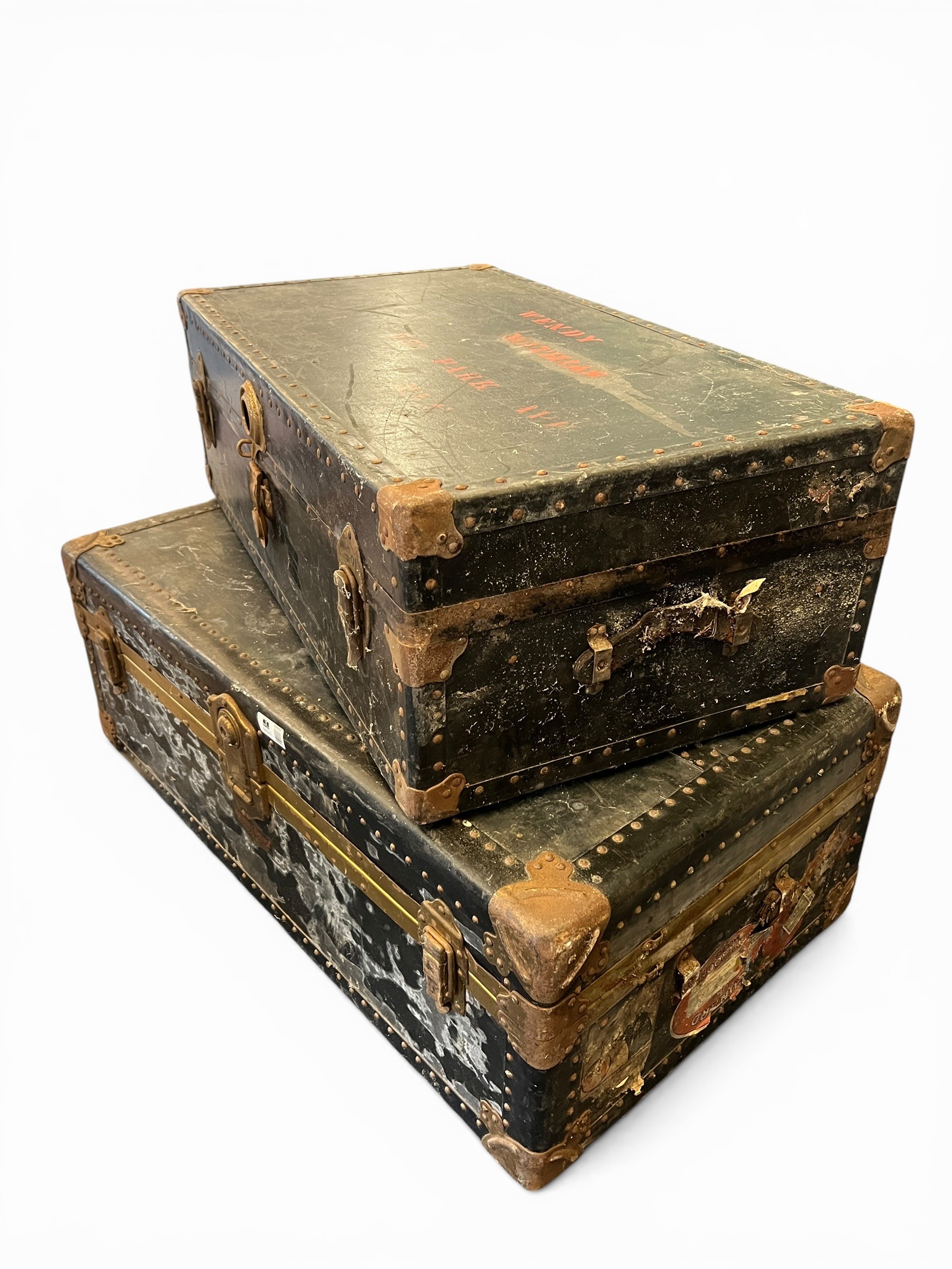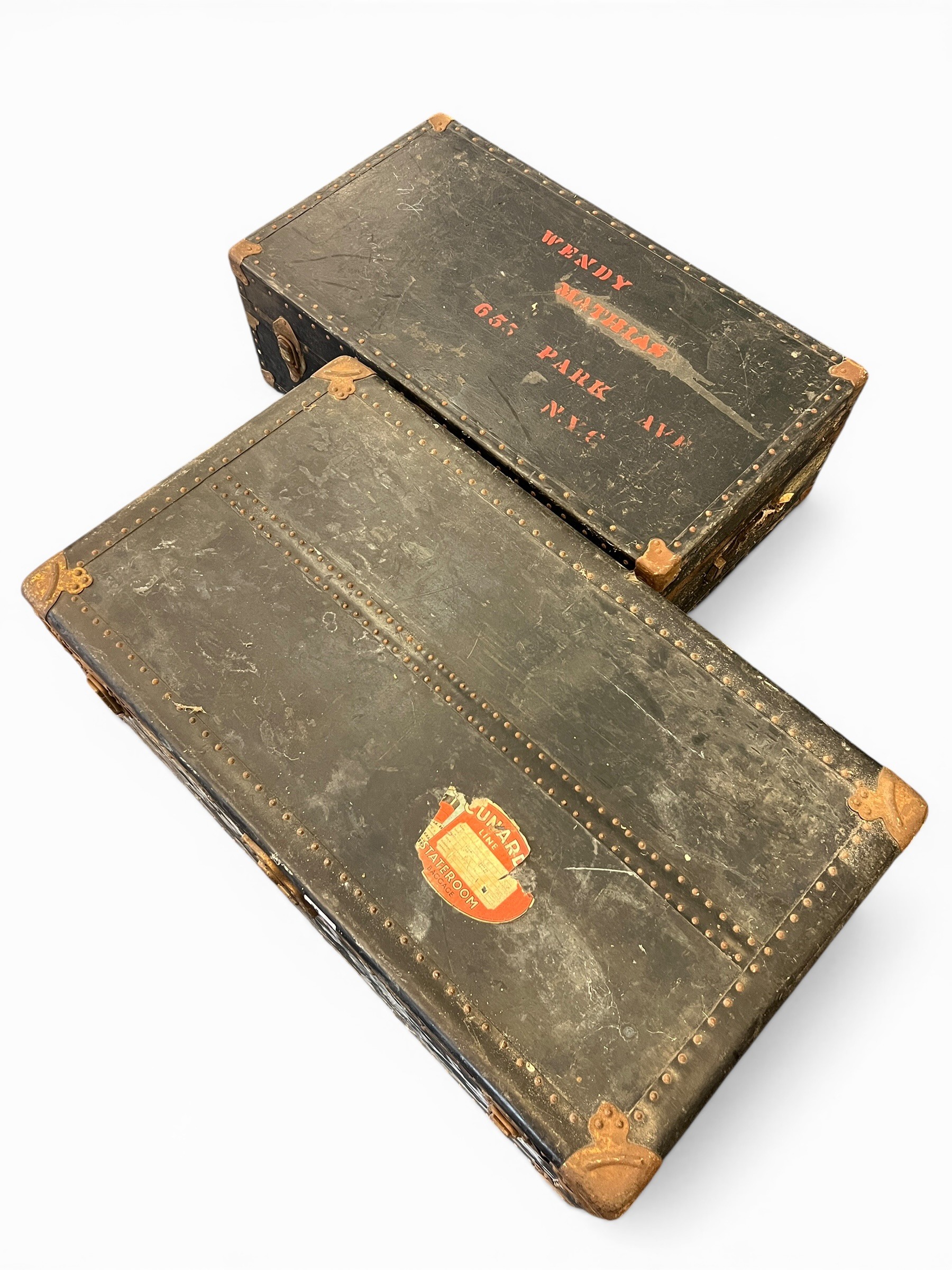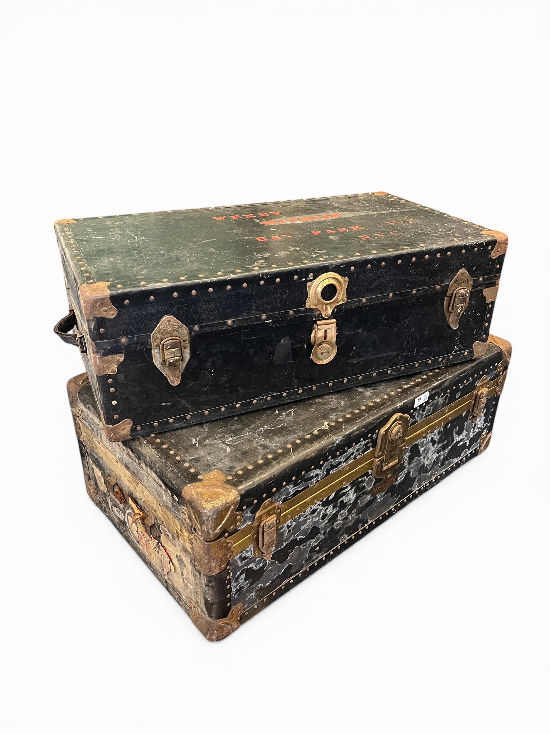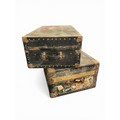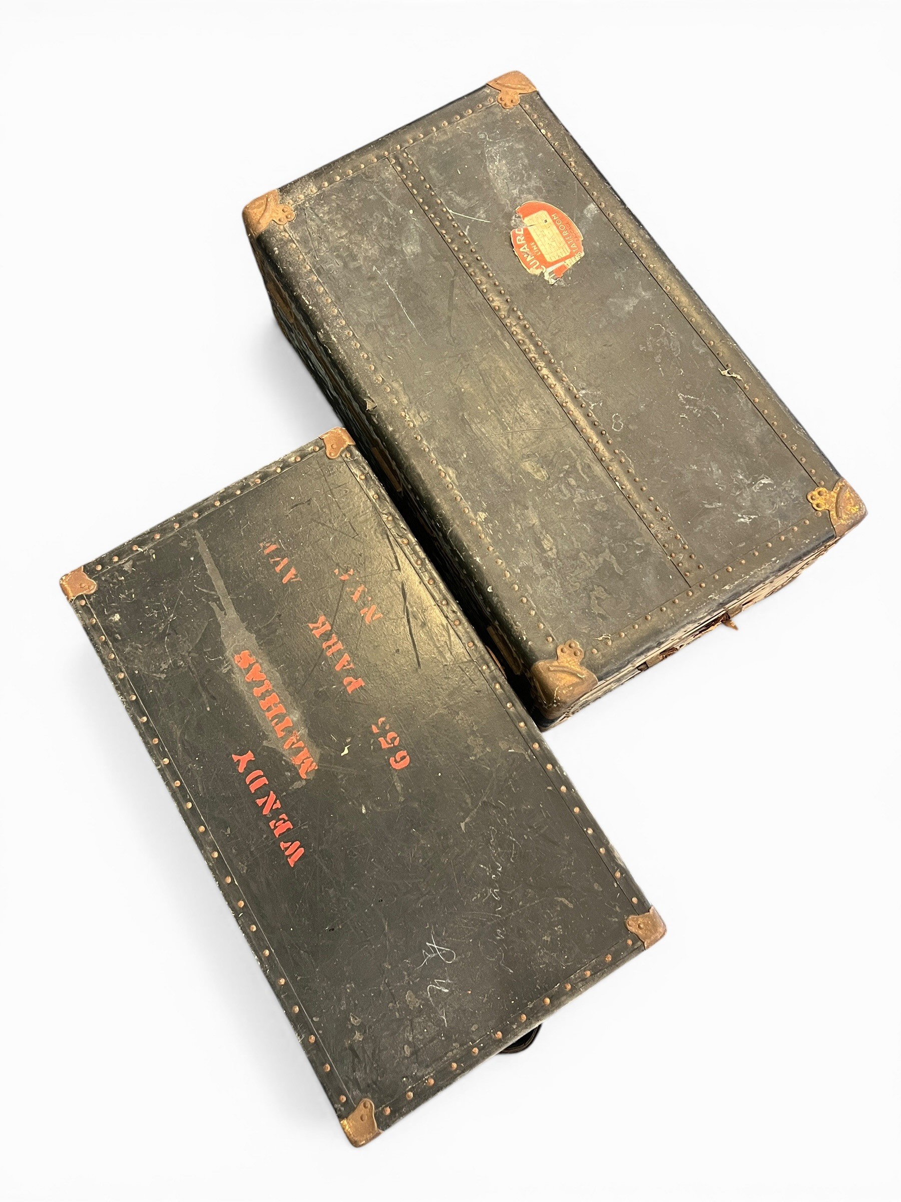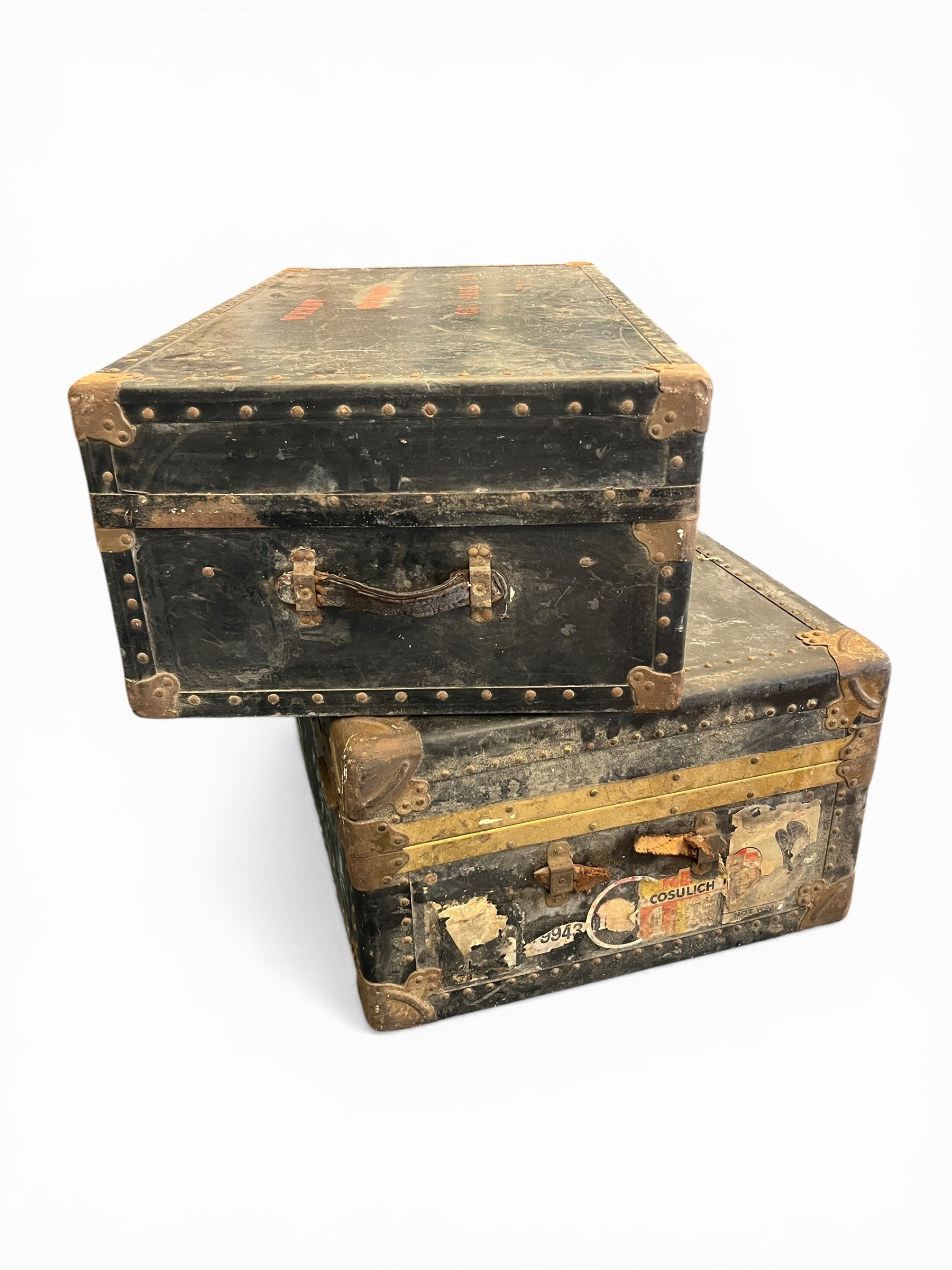 Pair of Vintage Travelling Trunks with Original Travel Stickers - (100 cm x 57 cm x 36 cm) and (92 cm x 50 cm x 30 cm)