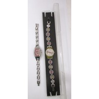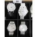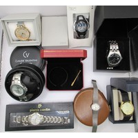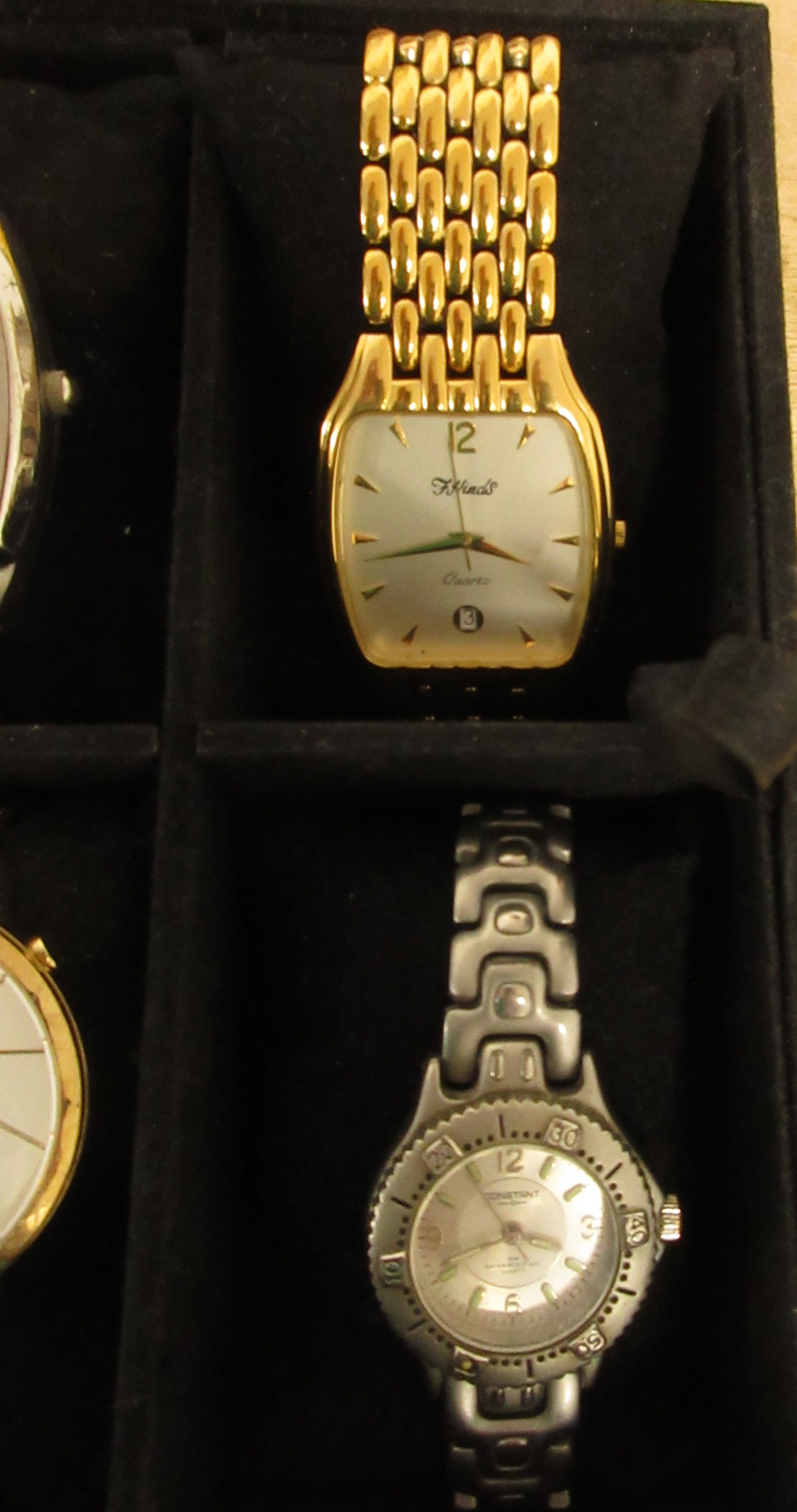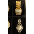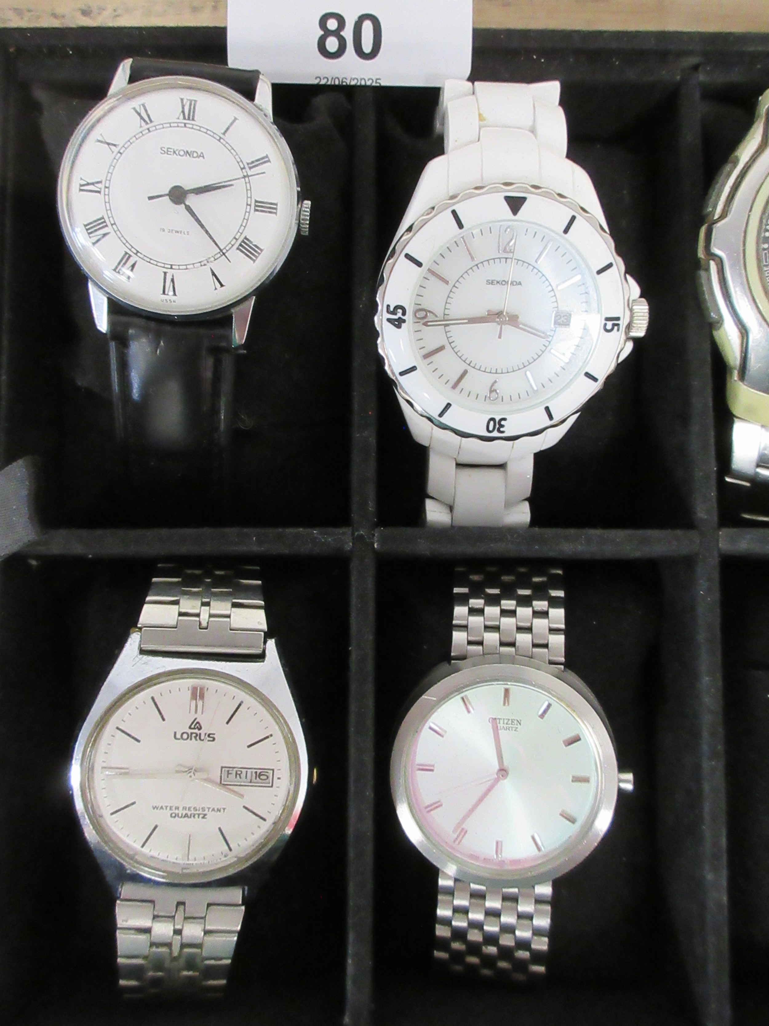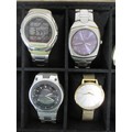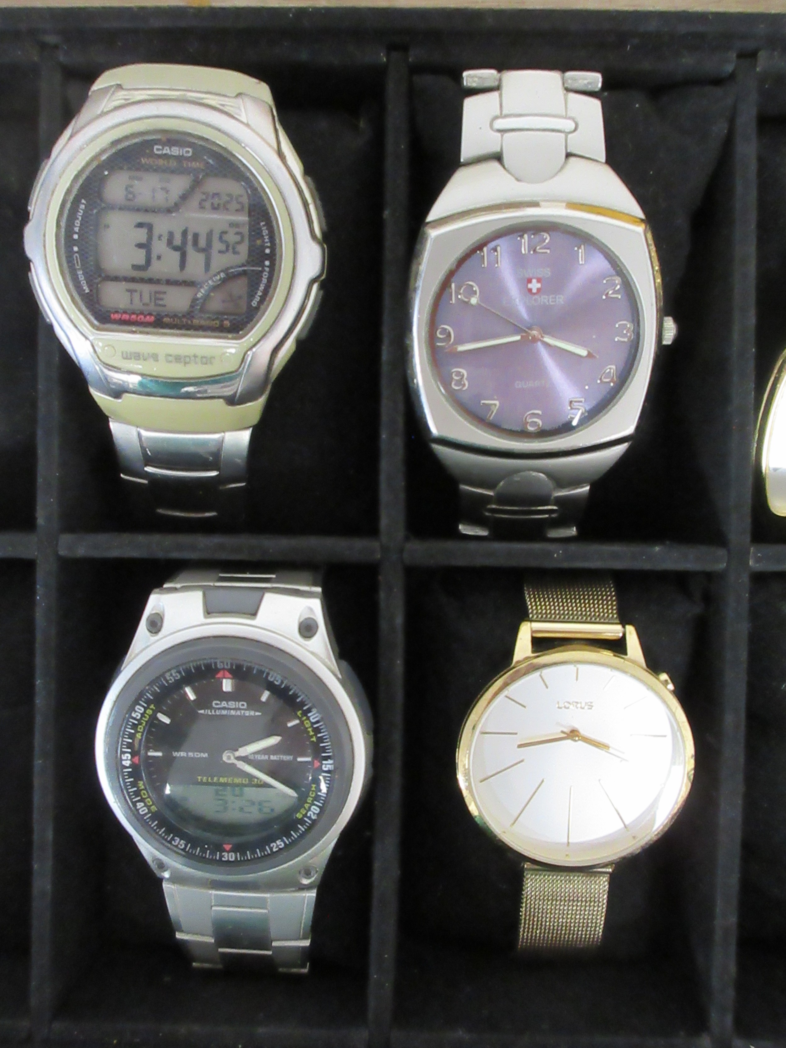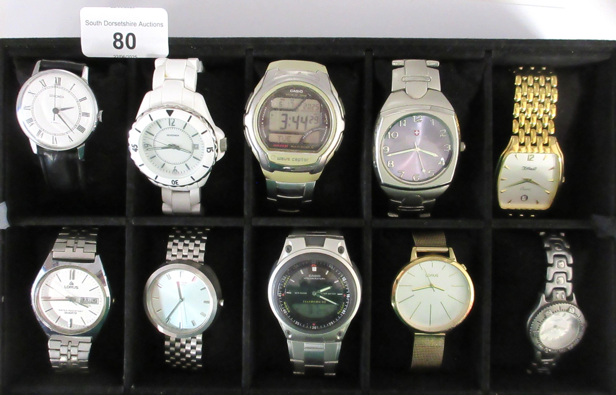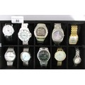 A ten-section watch display box with ten ladies and gents quartz wristwatches including Sekonda, Casio, Citizen, Lorus, F. Hinds. All seen running
