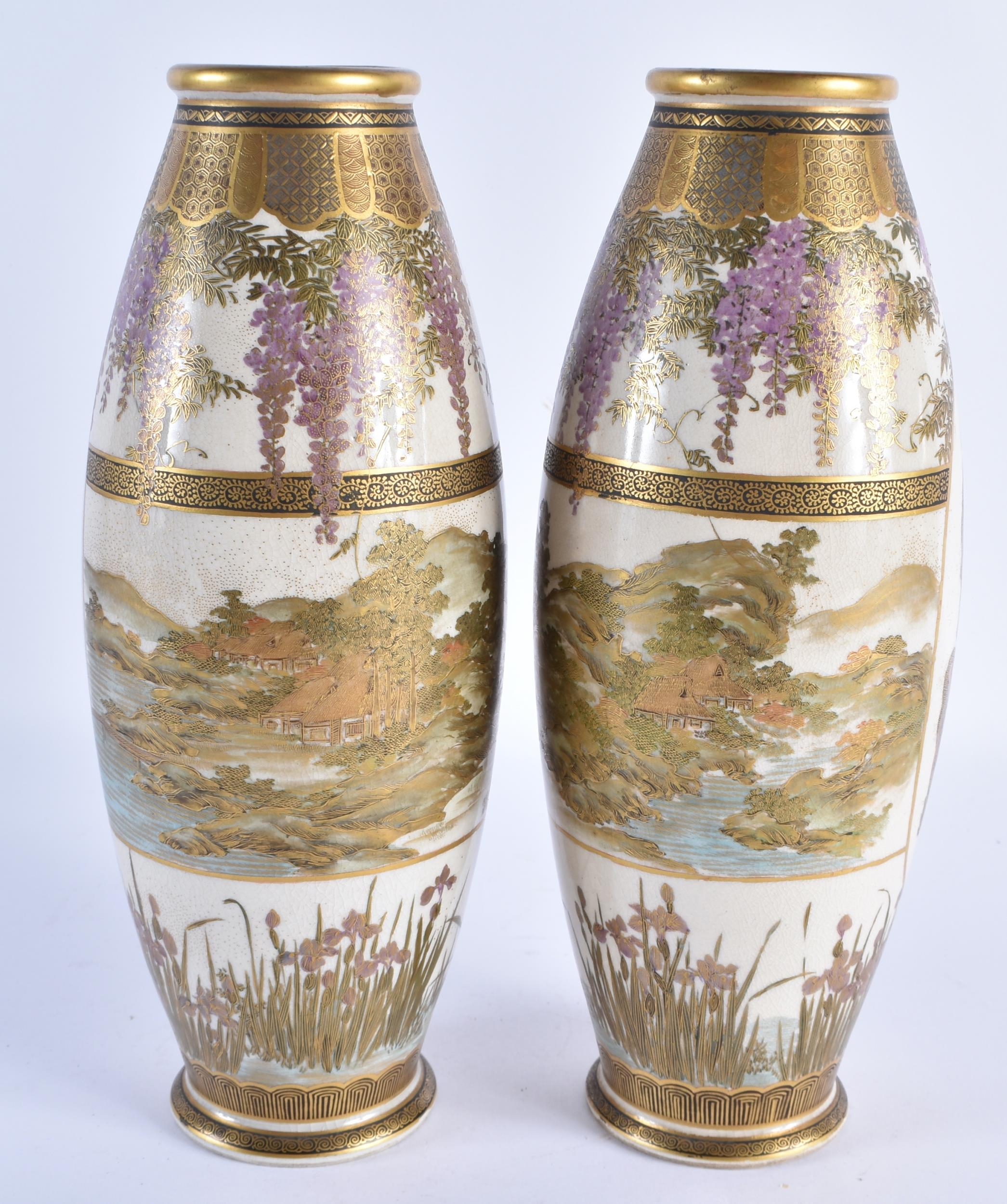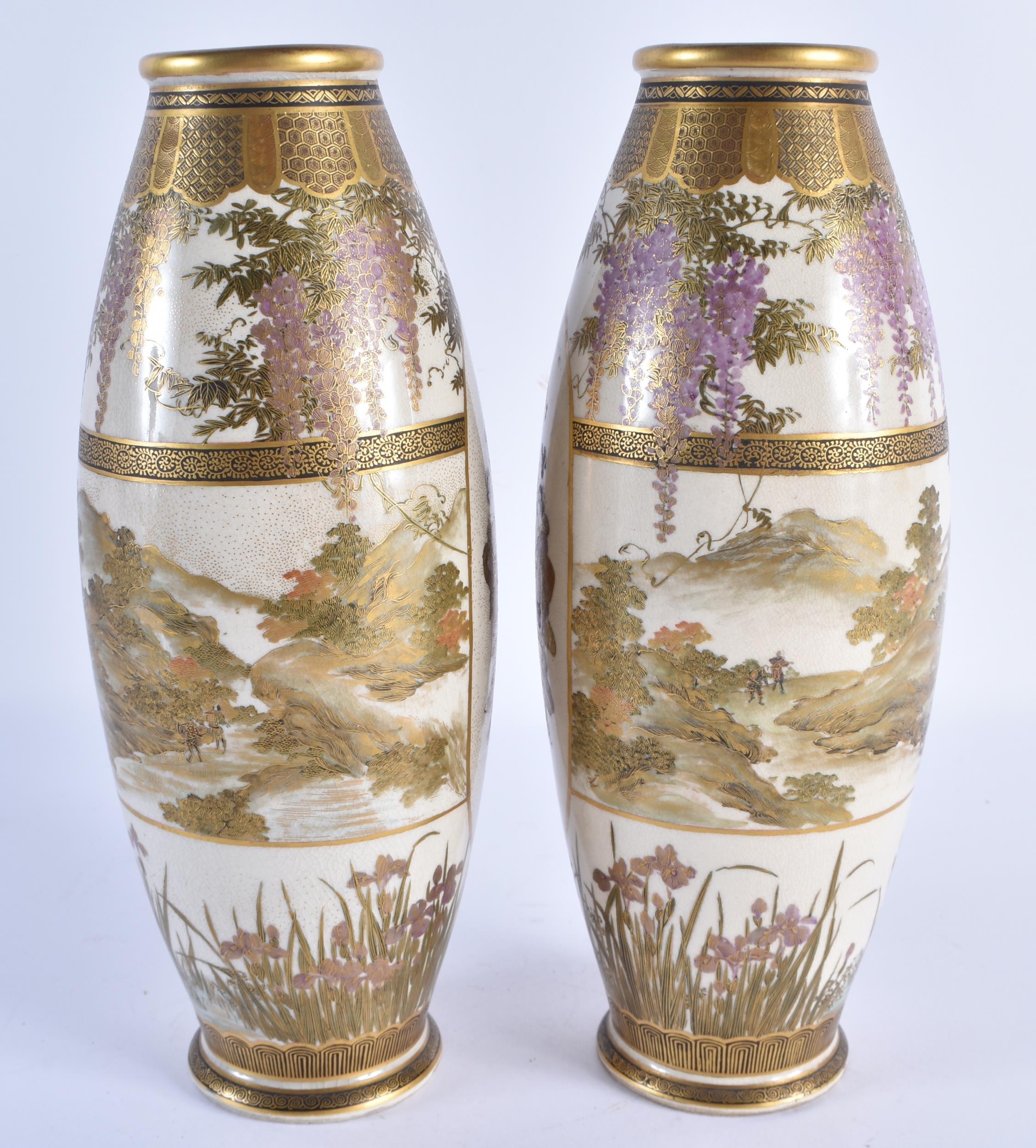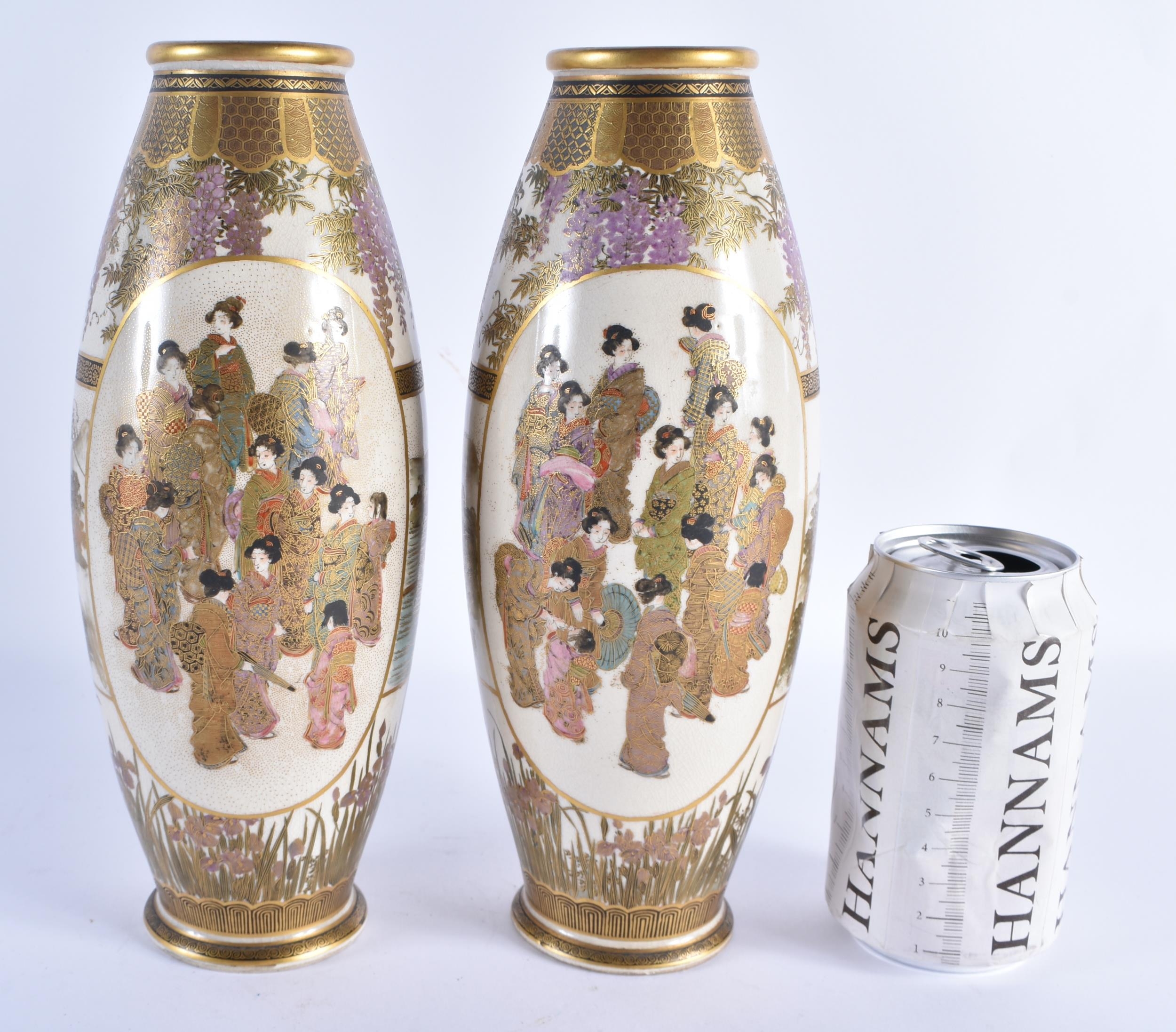 A PAIR OF LATE 19TH CENTURY JAPANESE MEIJI PERIOD SATSUMA POTTERY VASES painted with a group of geisha standing within panels, encased within flowering wisteria and landscapes. 25 cm high.