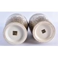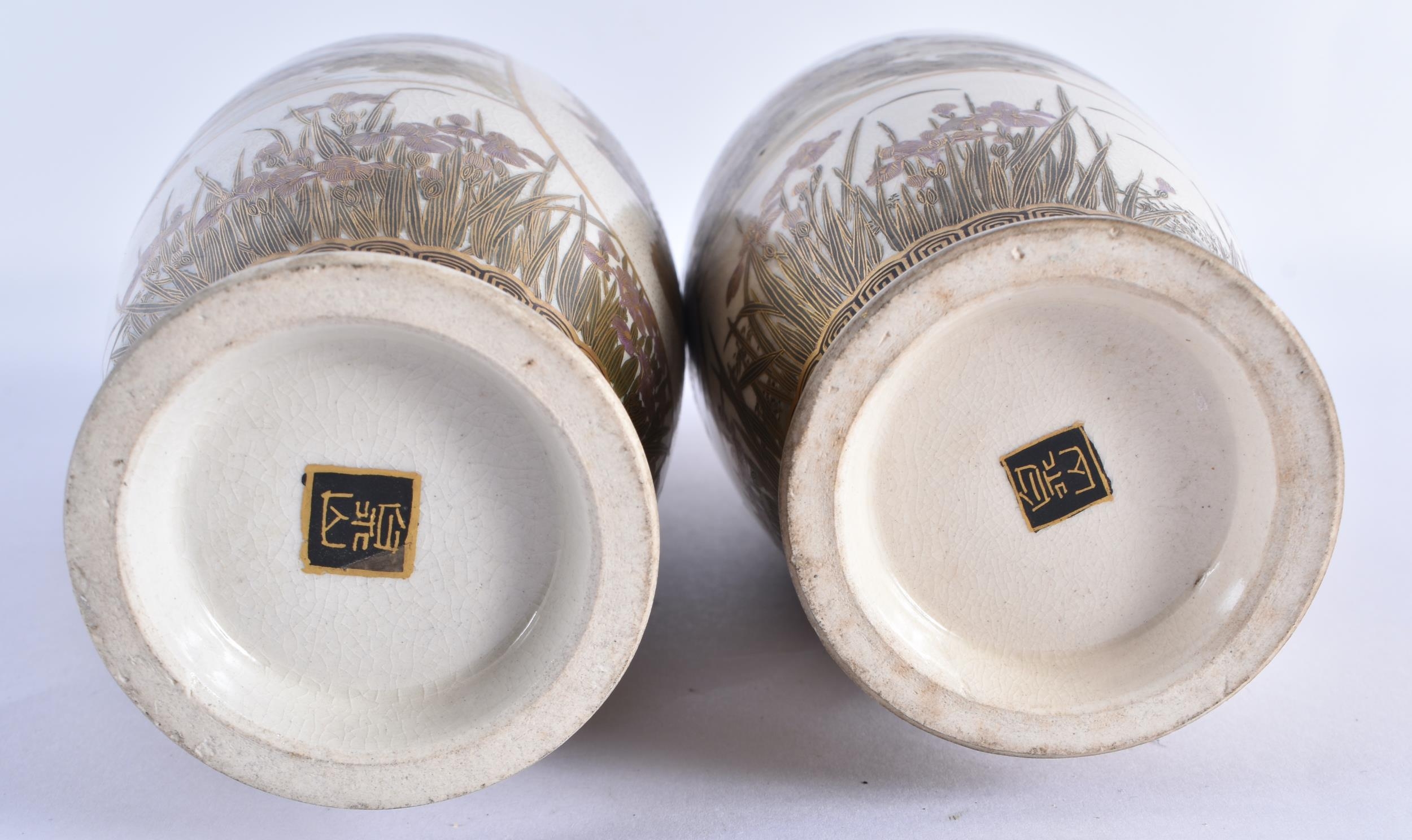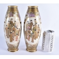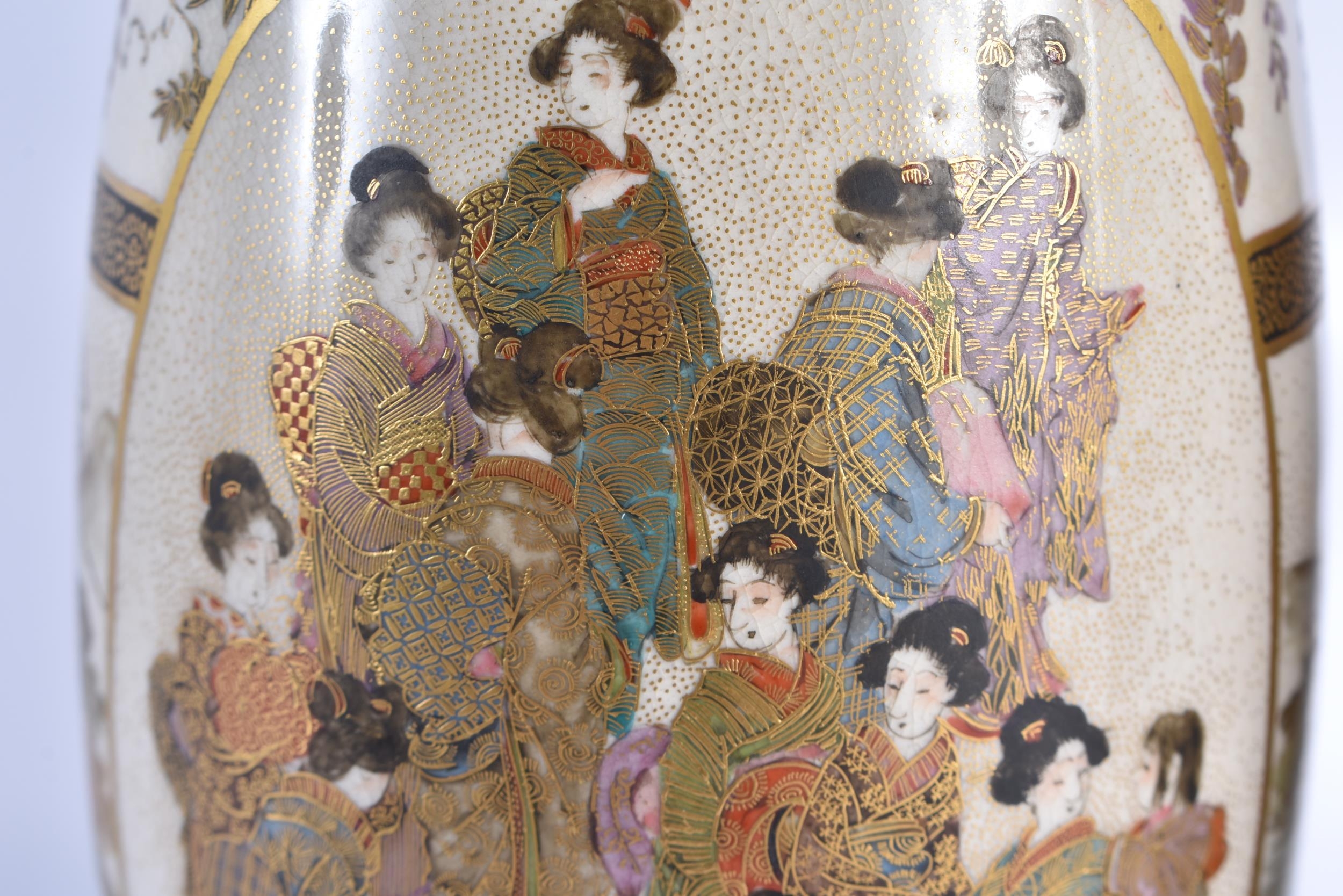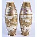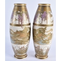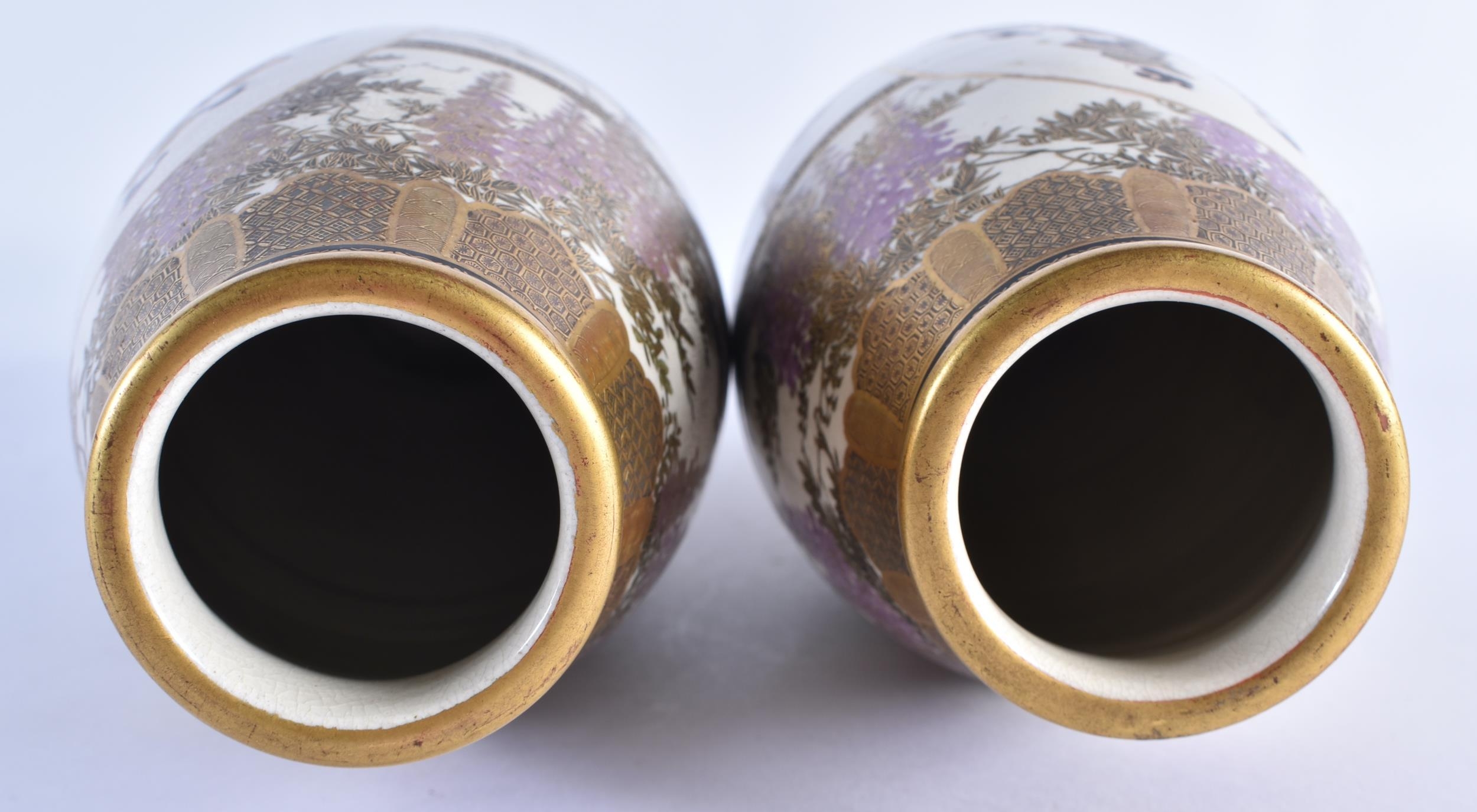 A PAIR OF LATE 19TH CENTURY JAPANESE MEIJI PERIOD SATSUMA POTTERY VASES painted with a group of geisha standing within panels, encased within flowering wisteria and landscapes. 25 cm high.