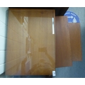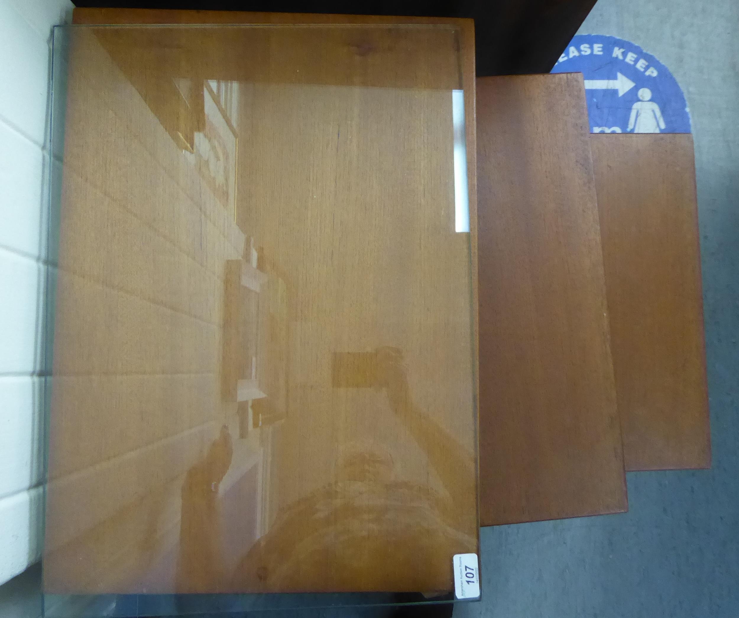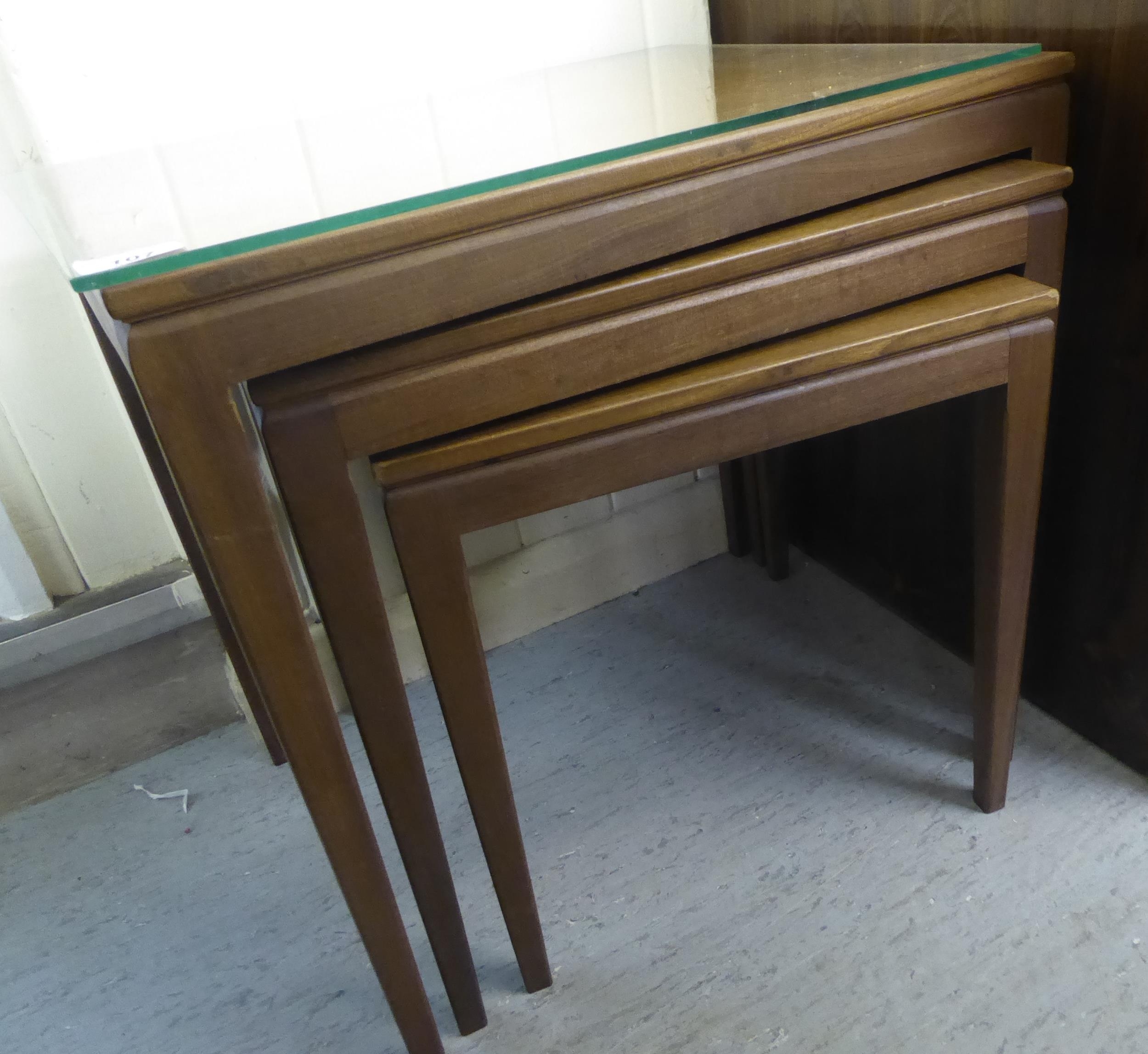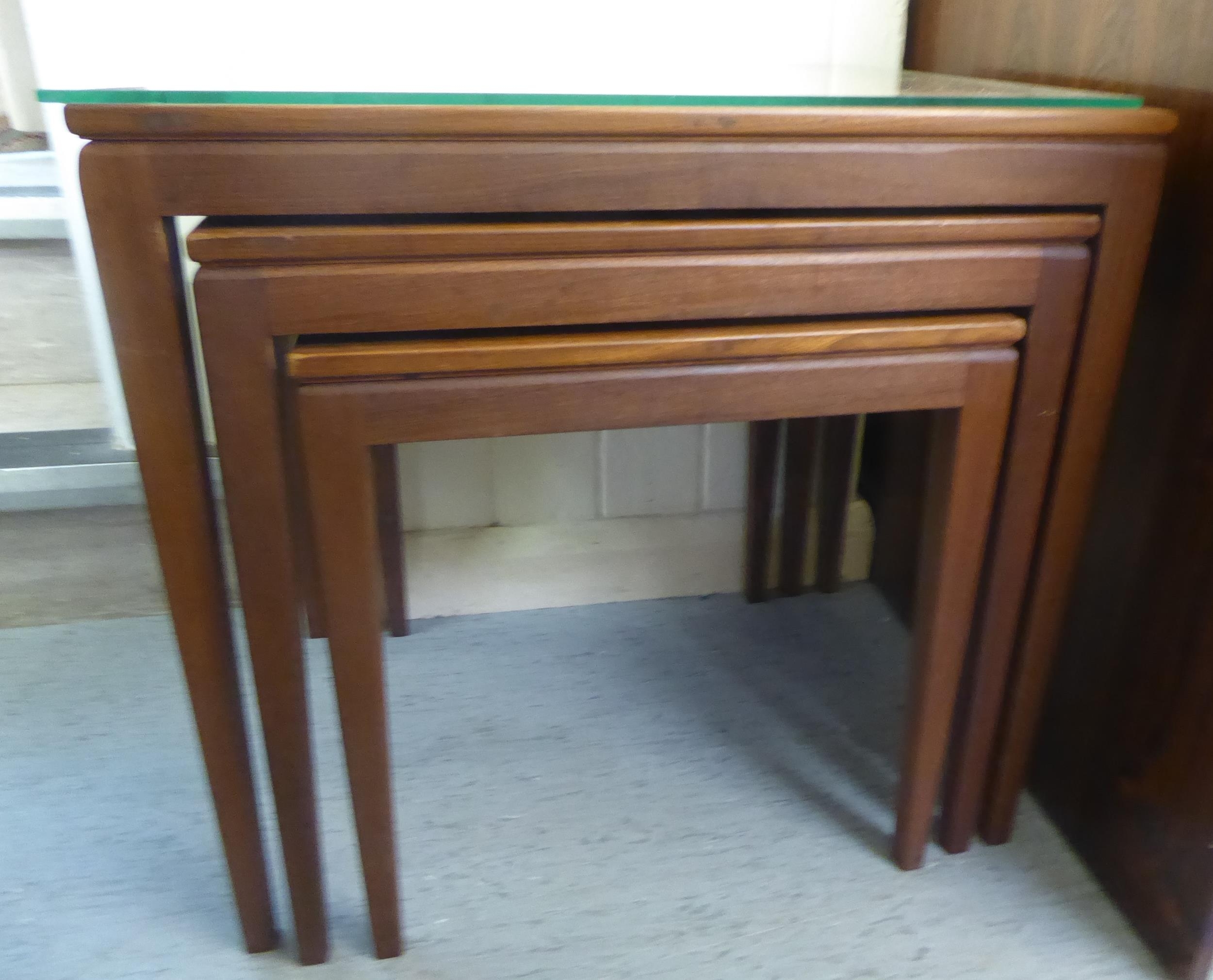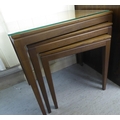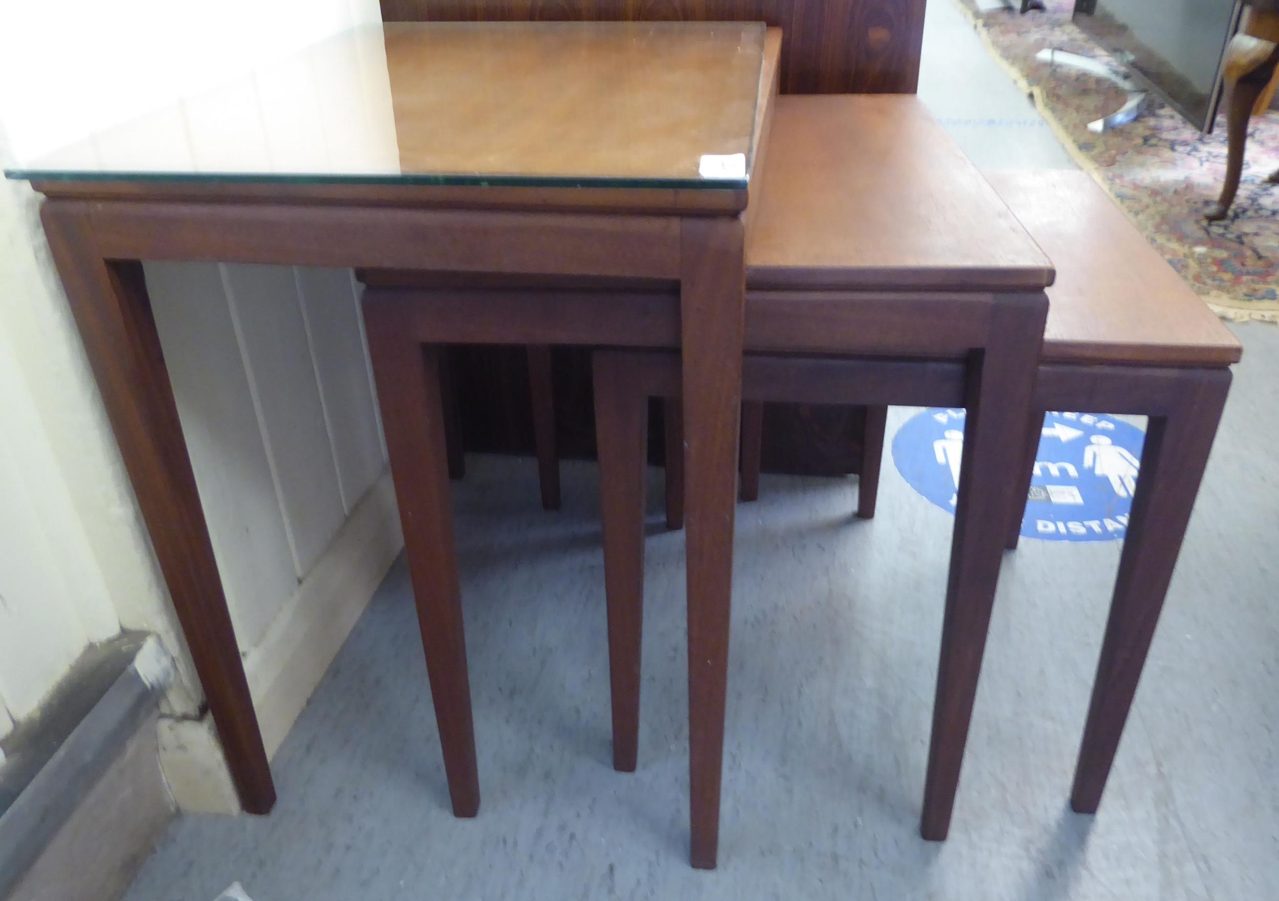A nesting set of three modern teak occasional table, raised on square, tapered legs largest 20"h 21"w