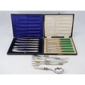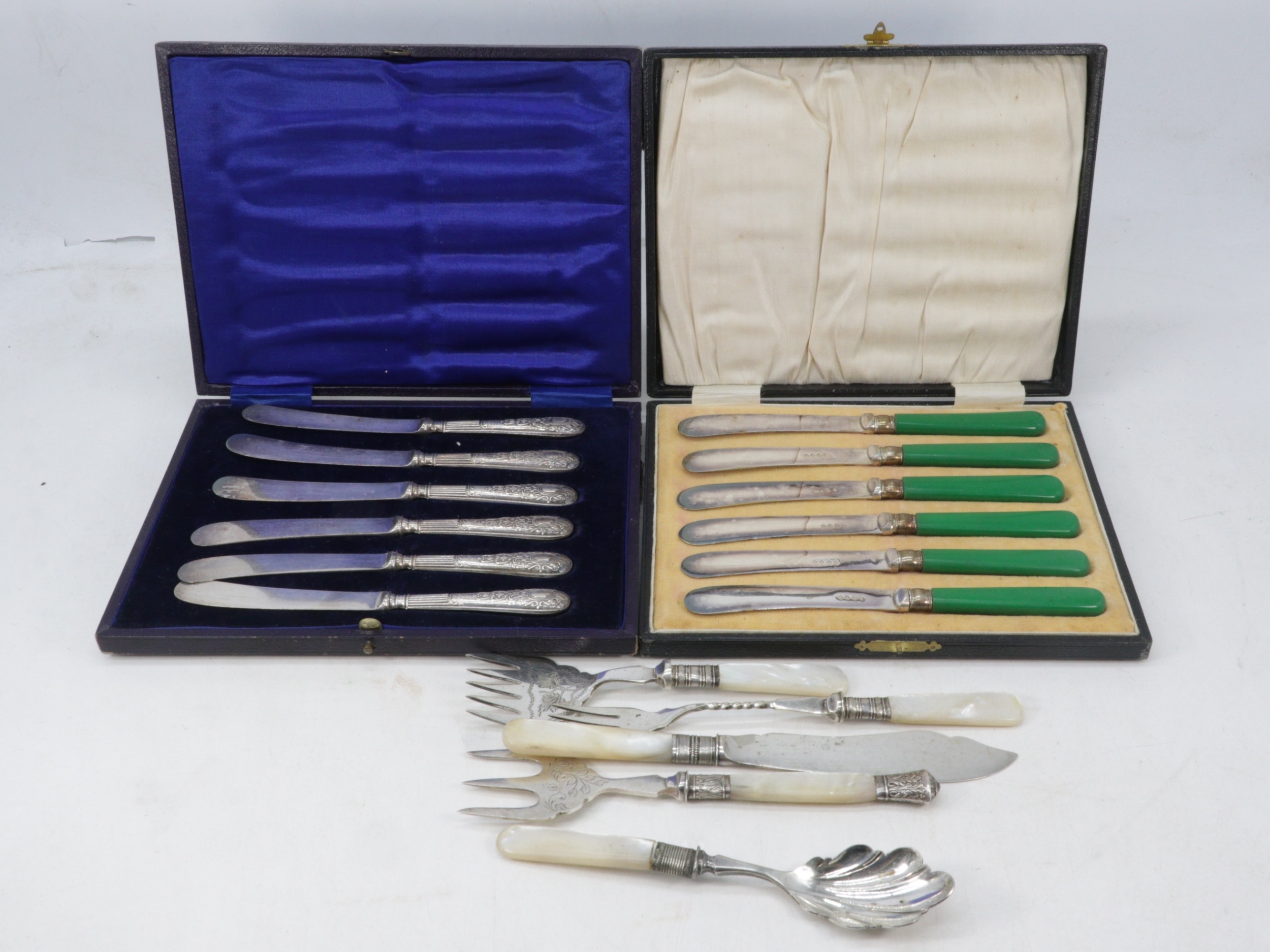 Silver handled pastry knives, cased butter knives and loose mother of pearl handled cutlery.