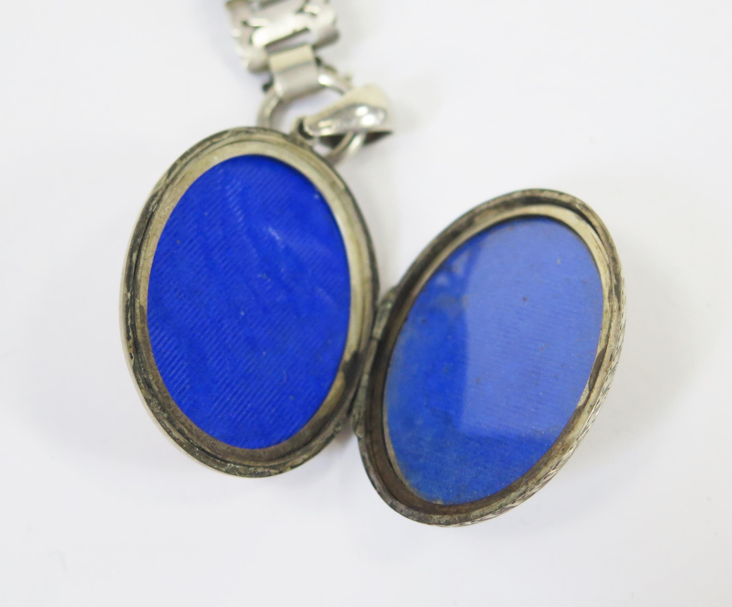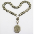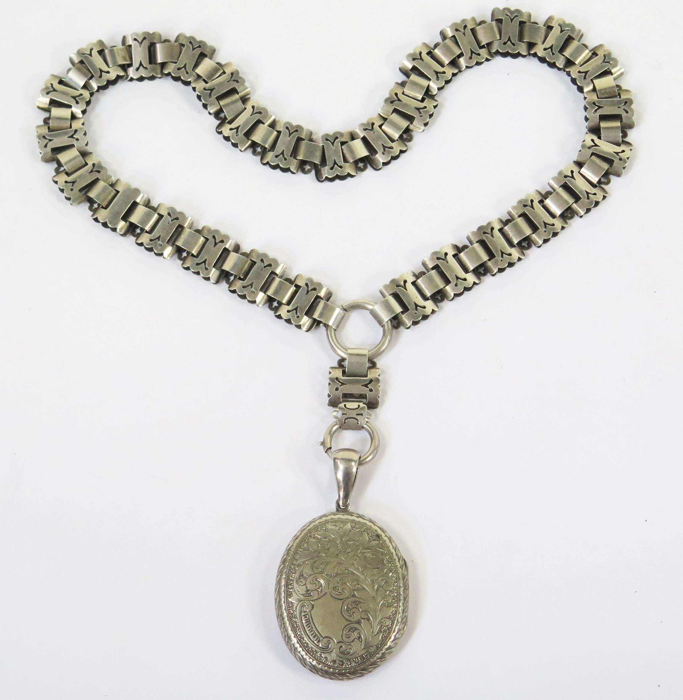 A Victorian Precious White Metal Collar with pierced decoration (44cm) and a locket with chased foliate decoration (c. 59mm drop), 48g