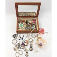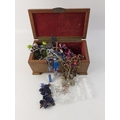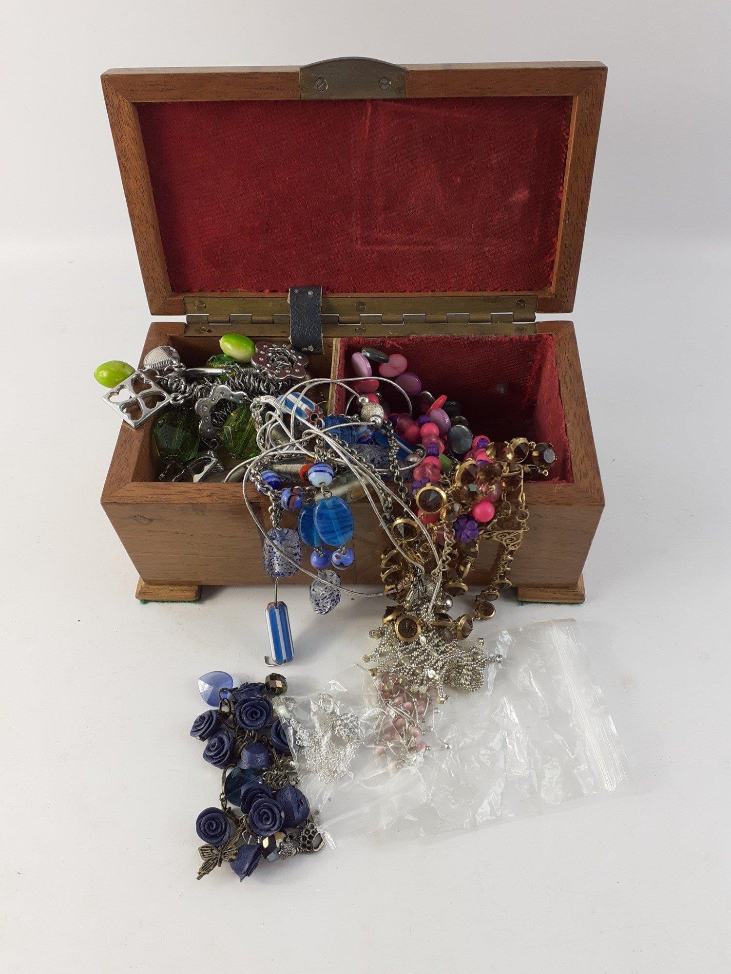 A wooden musical jewellery box with a quantity of costume jewellery 18x10x8cm