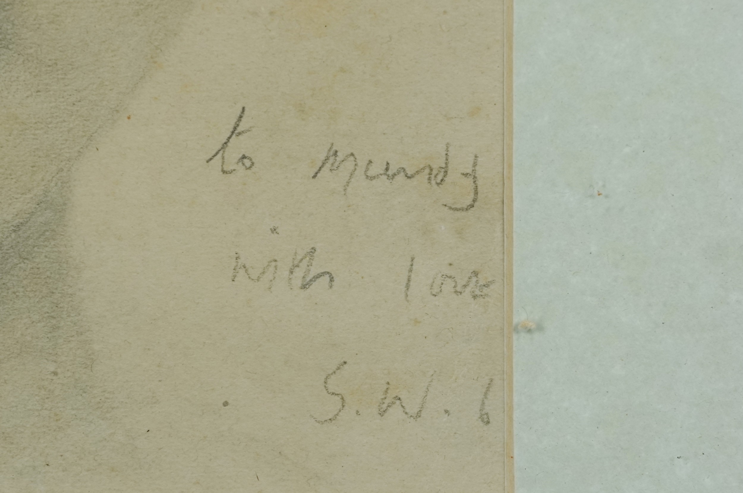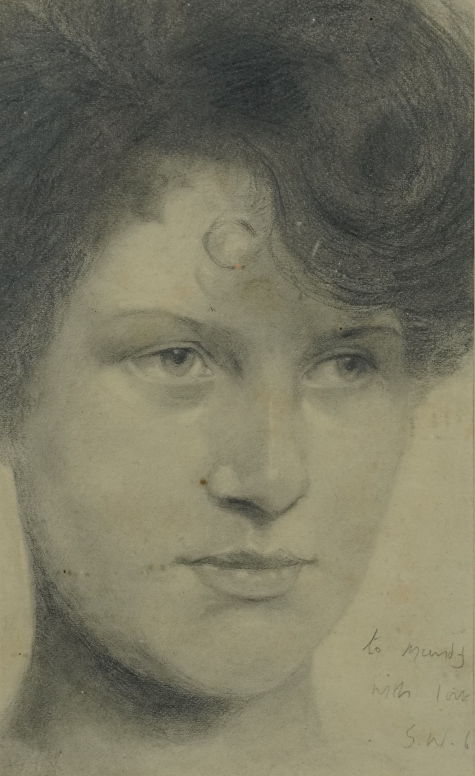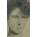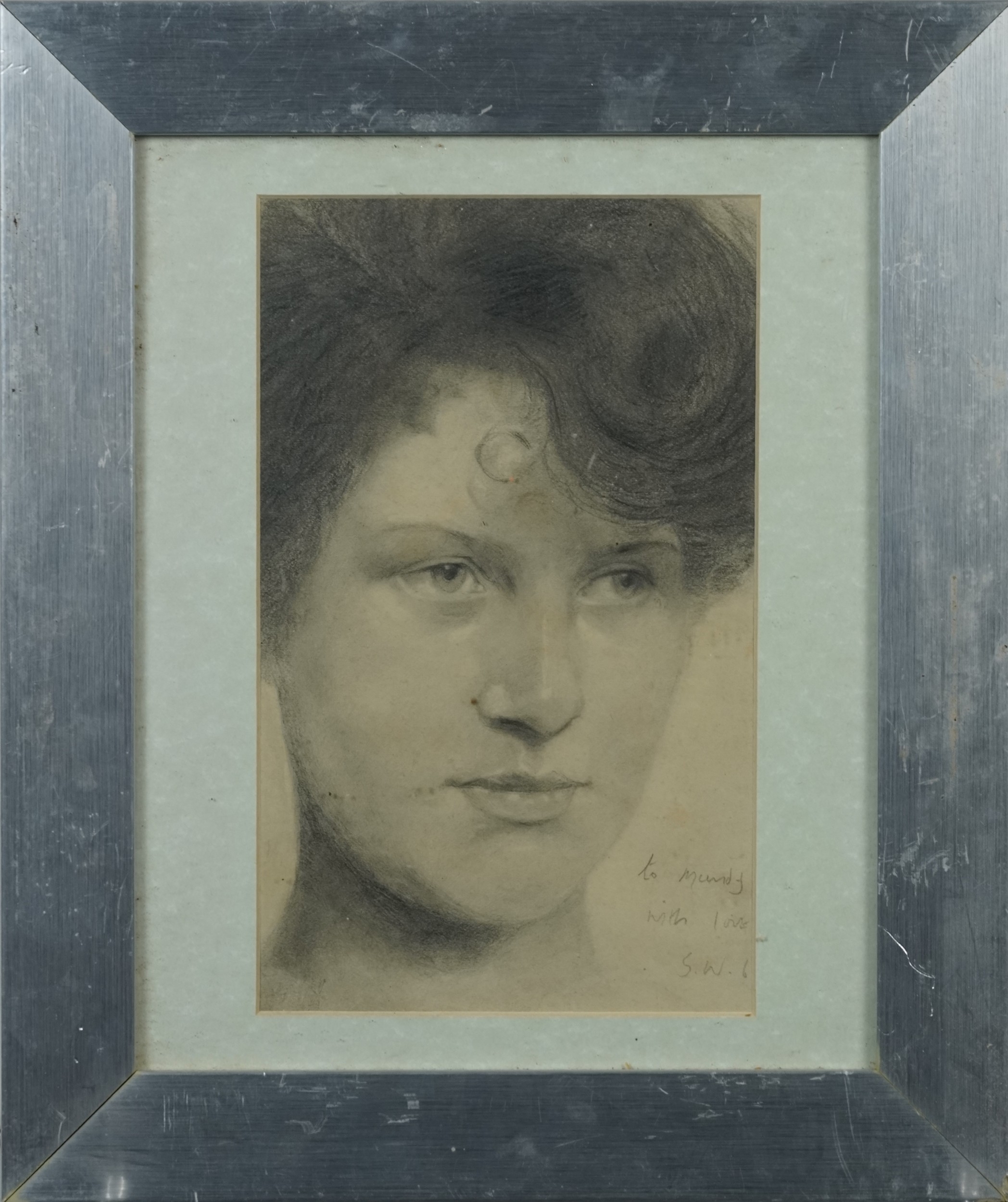 A portrait of a young lady, 20th century British school pencil on paper, inscribed and initialled, within a silvered frame, 25cm x 16cm.