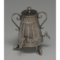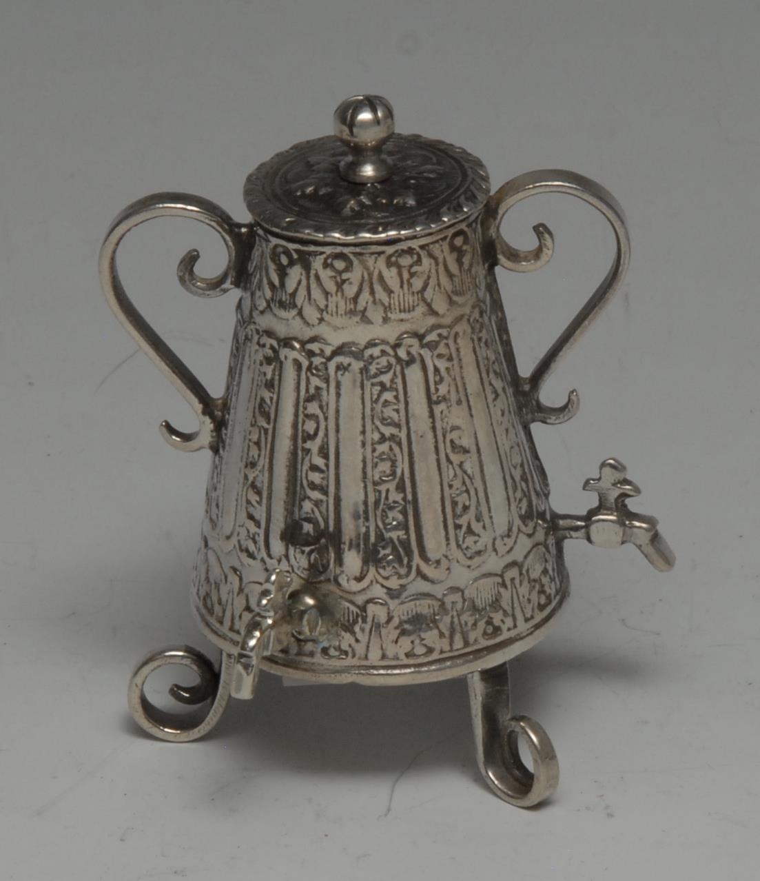 An 18th century Dutch silver toy miniature coffee urn, scroll feet, 6.5cm high, Amsterdam c.1770