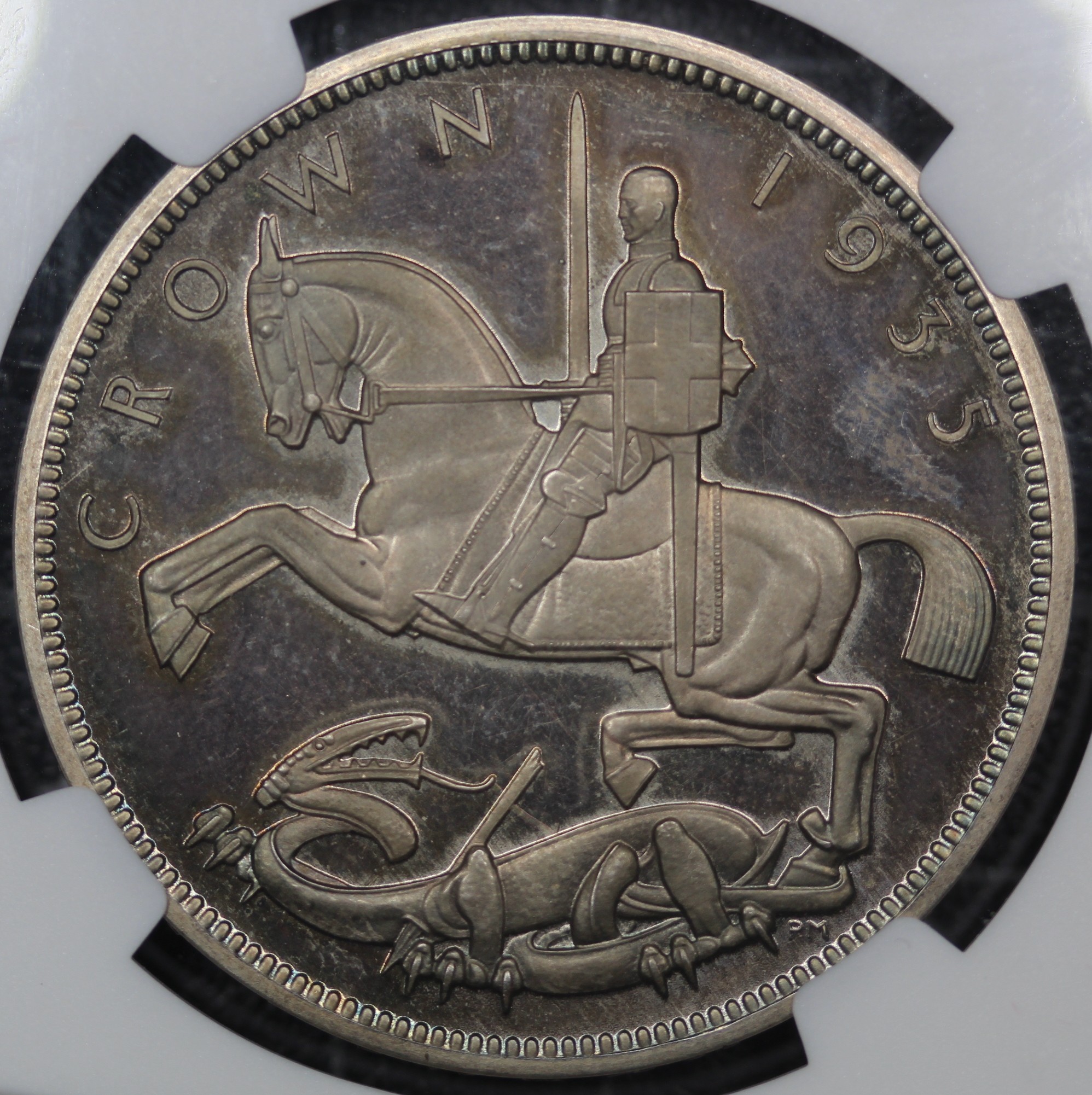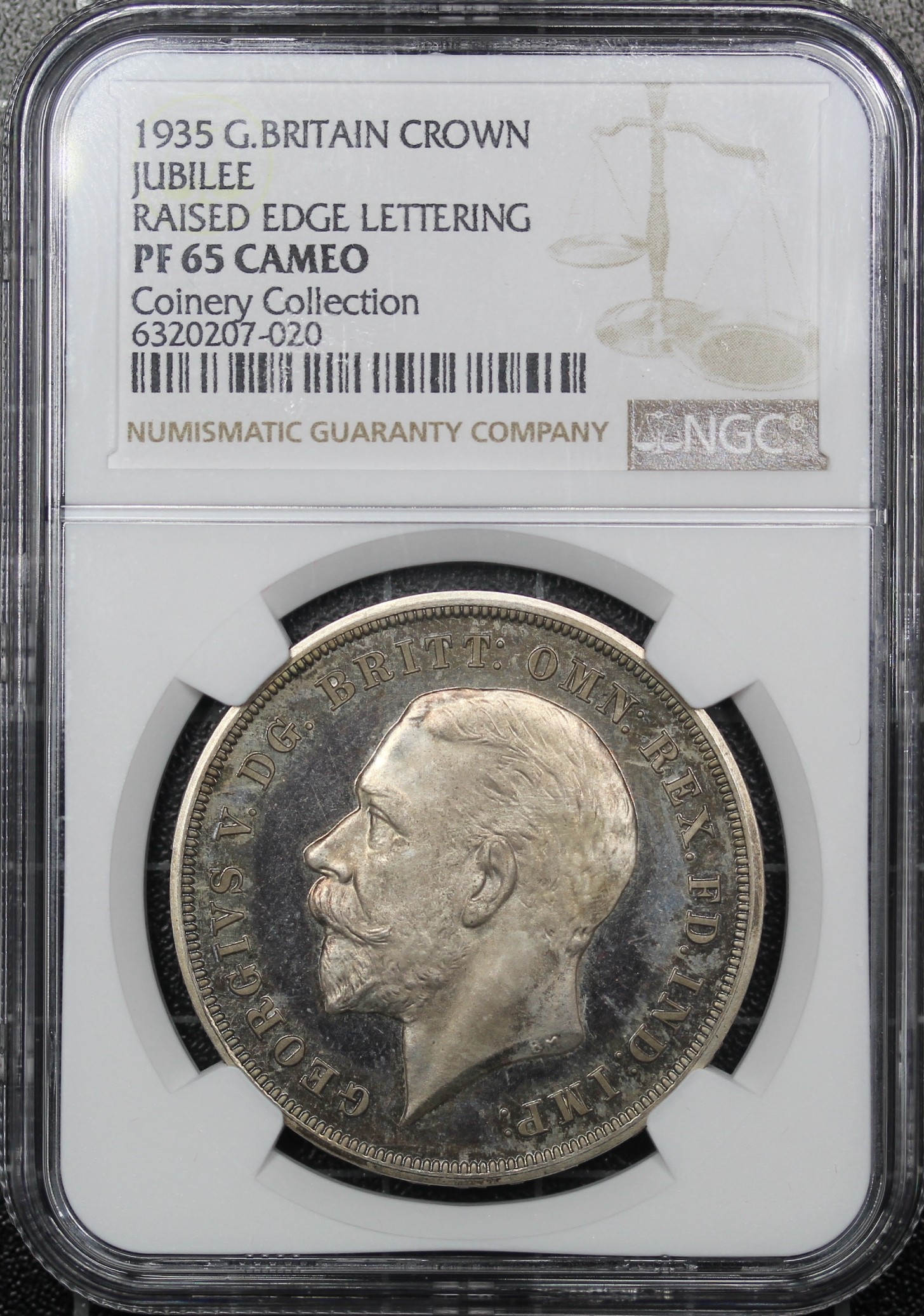 1935 Raised Edge Proof Crown, George V (ESC 378, Bull 3655, S.4048). Graded NGC PF65 Cameo and presented in a Coinery Collection holder. This example has beautifully toned fields of blues and purples and has great eye appeal that truly dazzles in the light. One of a limited mintage of just 2,500 coins.