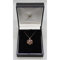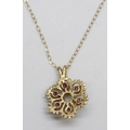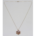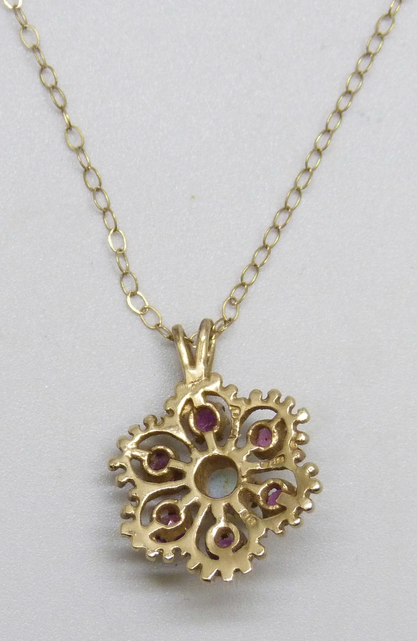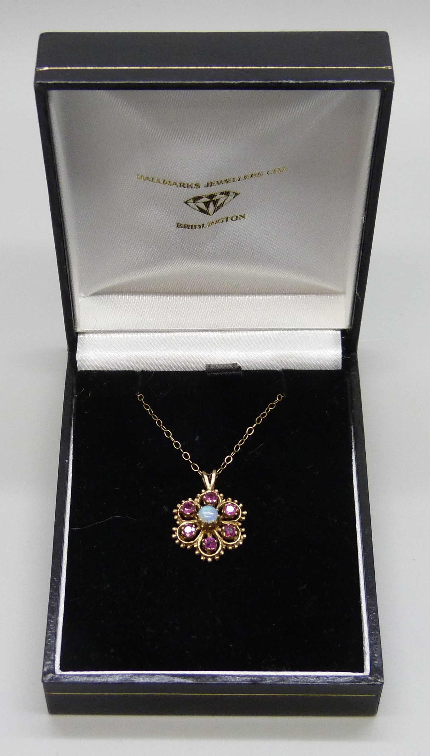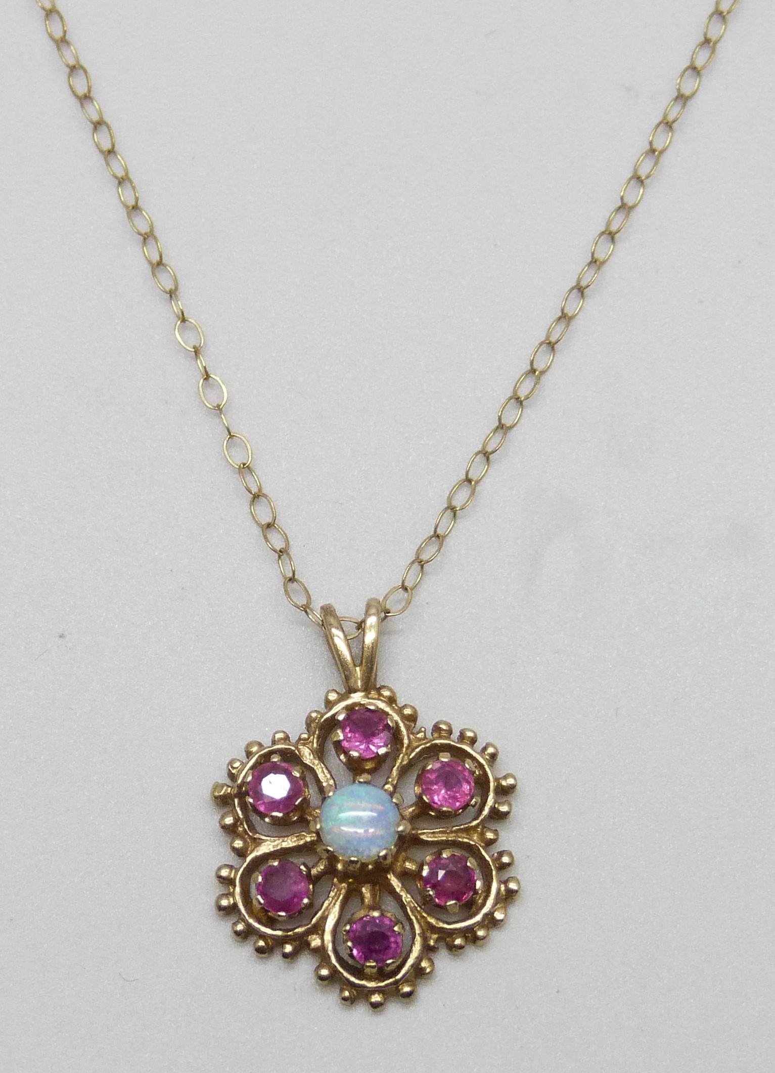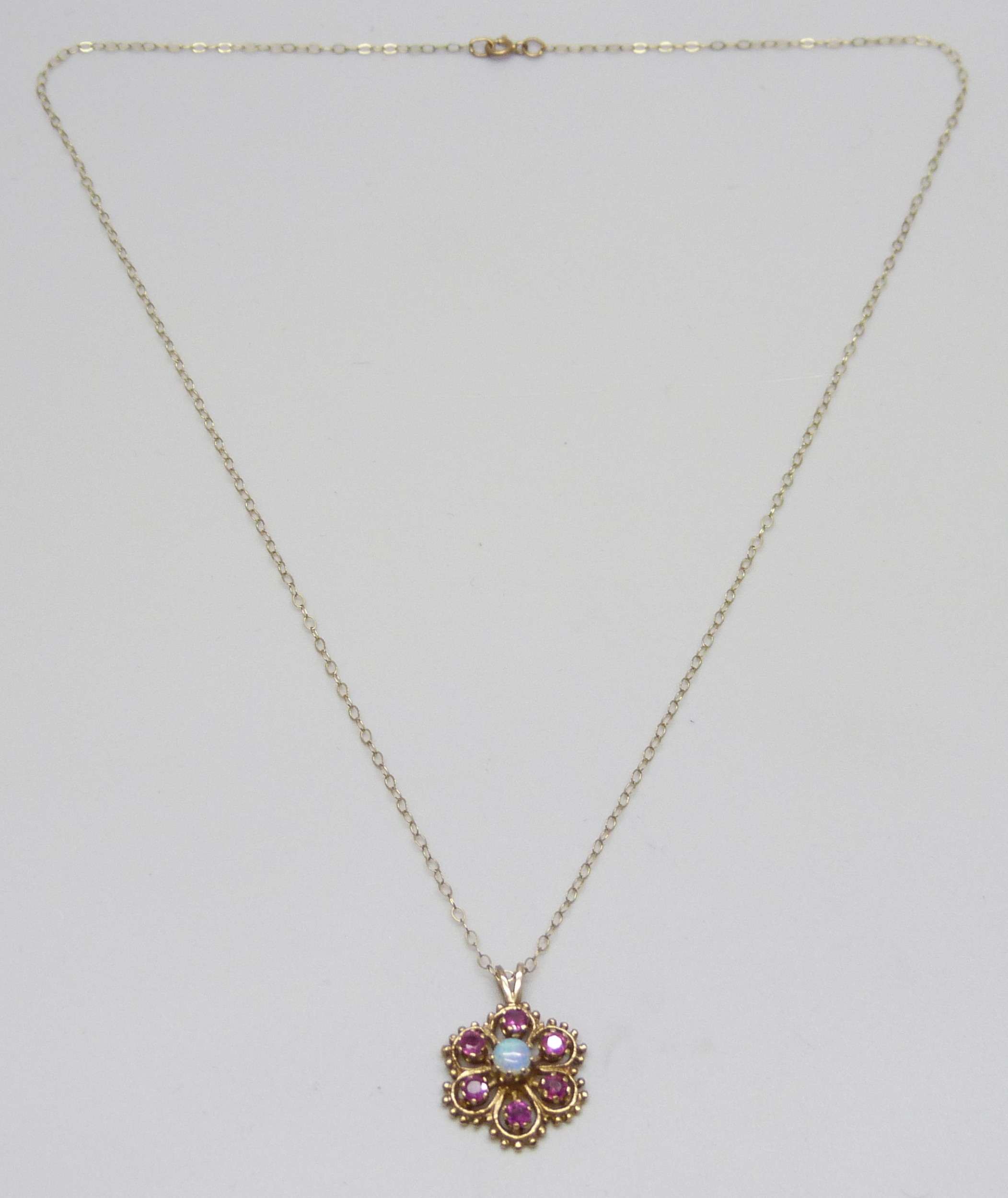 A 9ct gold, ruby an opal cluster pendant, 2cm including bail, on a 9ct gold chain, 2.2g total
