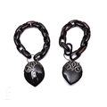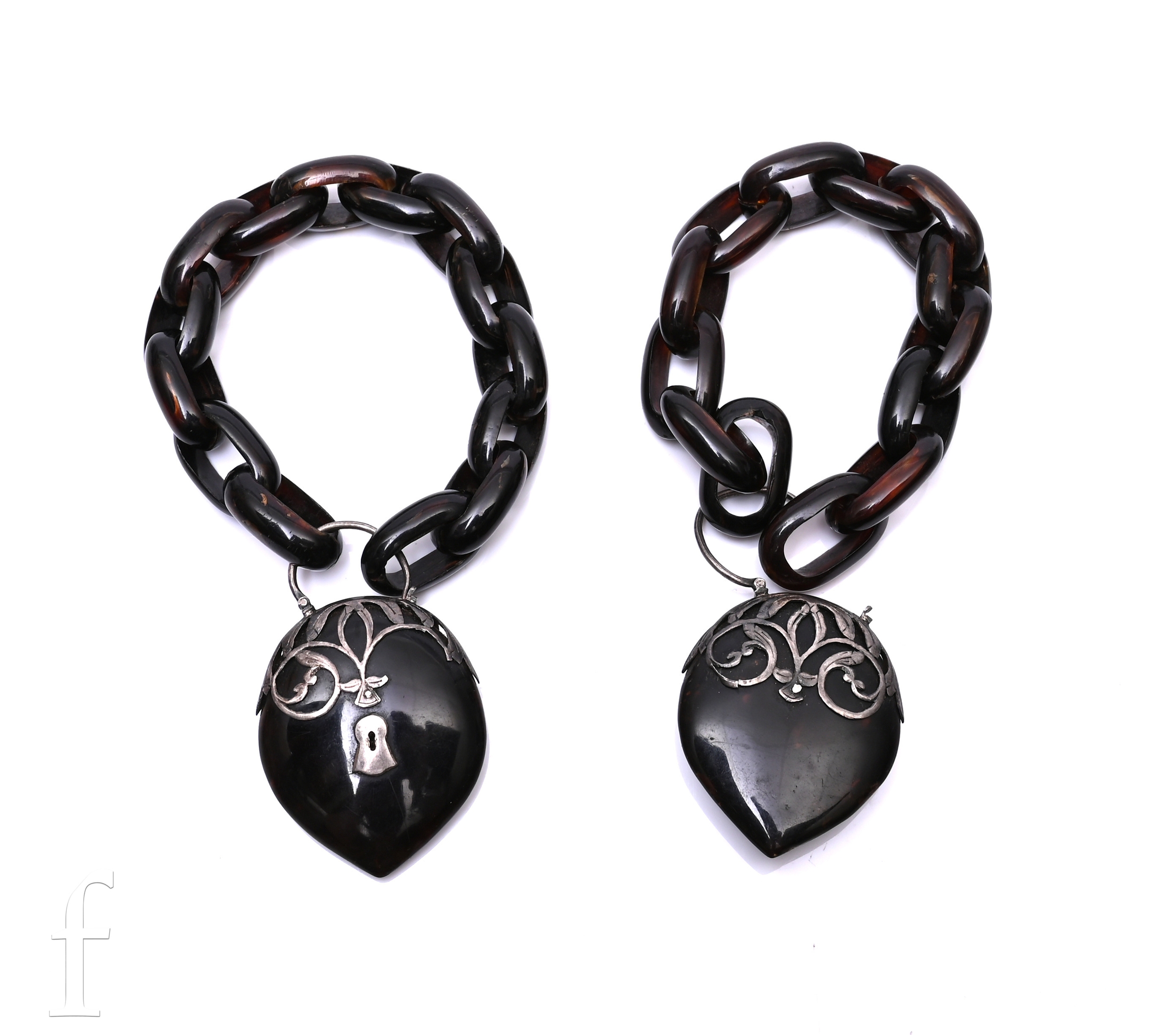 A pair of Victorian tortoiseshell and silver bracelets, circa 1880, each of oval polished links with large heart shaped tortoiseshell clasp, with silver scroll work, total weight 46.1g, each bracelet measures 18.5cm long, each heart including silver caps measures 5.5cm x 3.5cm.