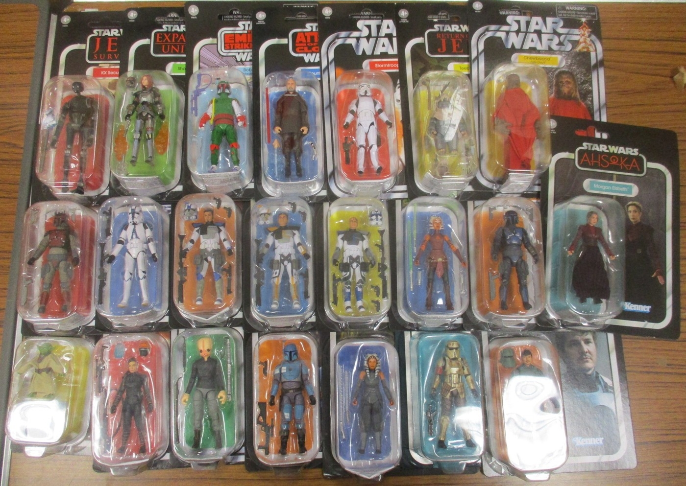 Star Wars. Hasbro. Collection of The Vintage Collection figures, generally mint in near mint bubble packs, includes ranges of The Clone Wars, The Mandalorian, Original Trilogy, etc. Qty 22 (½B)