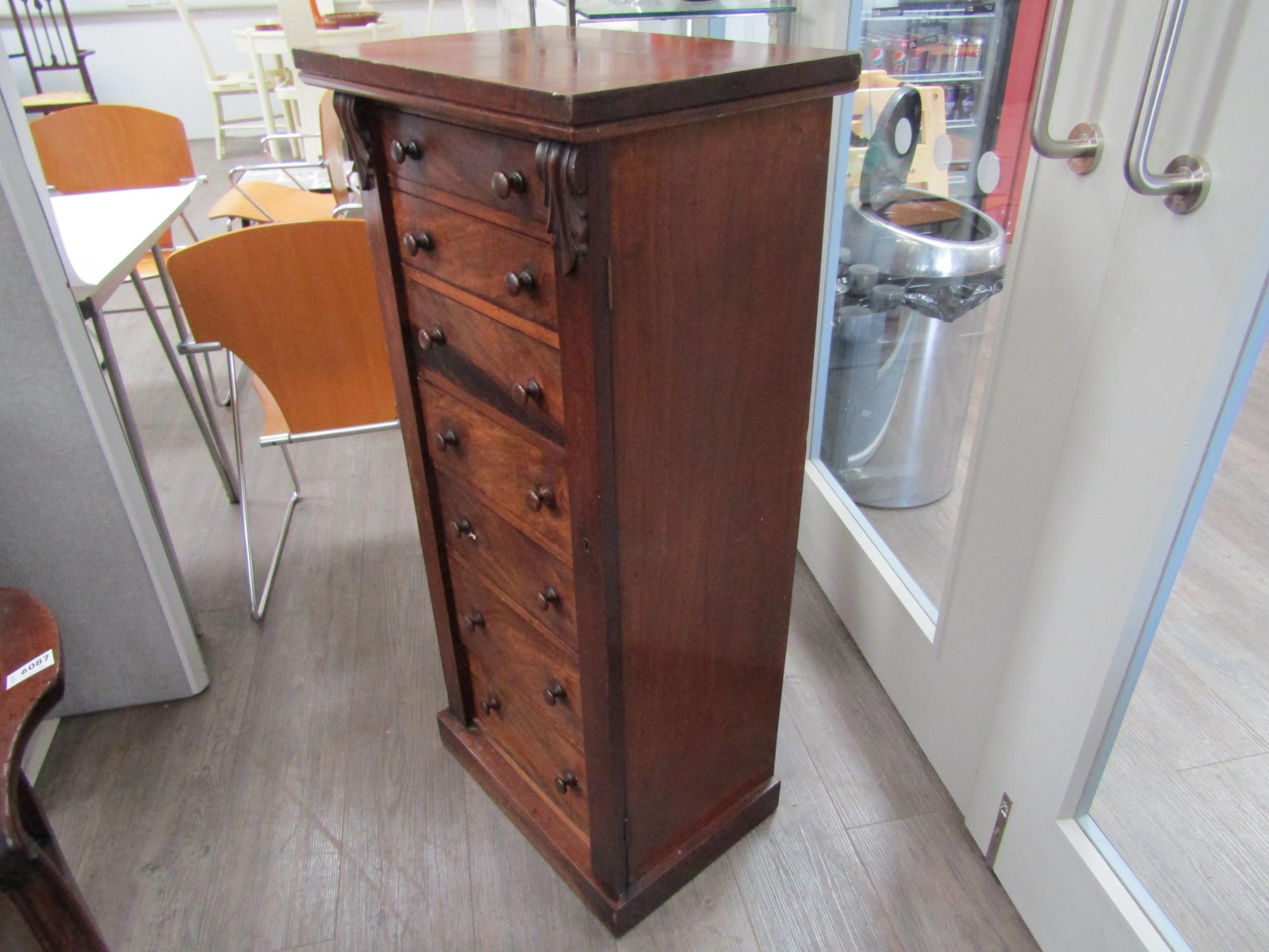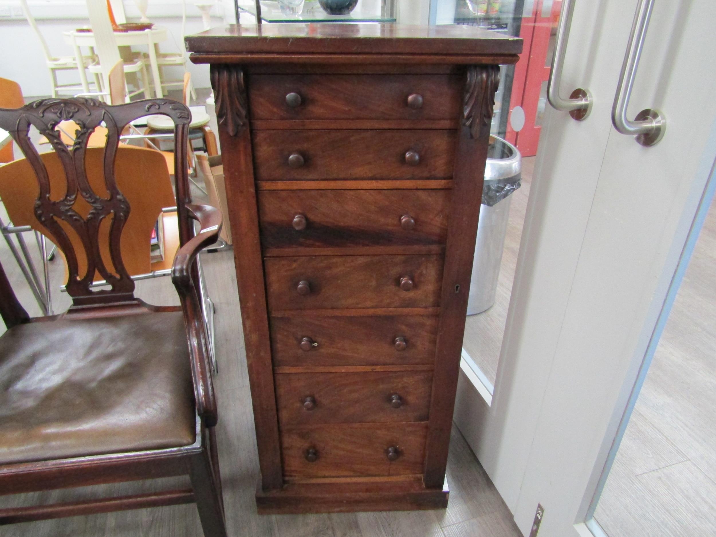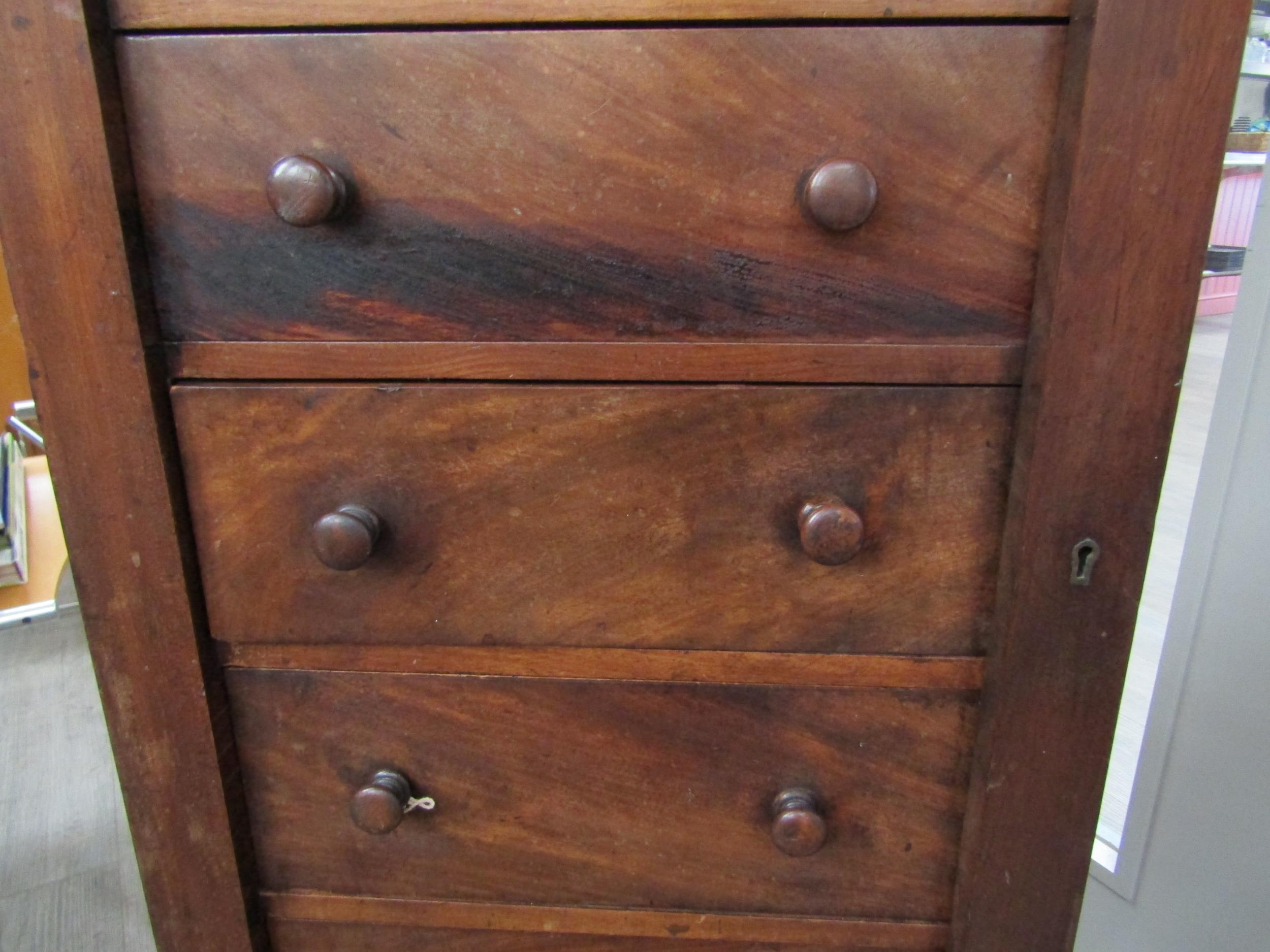 A 19th Century mahogany wellington chest of seven graduating drawers (one handle damaged), key with porter, 112cm x 51cm x 37cm