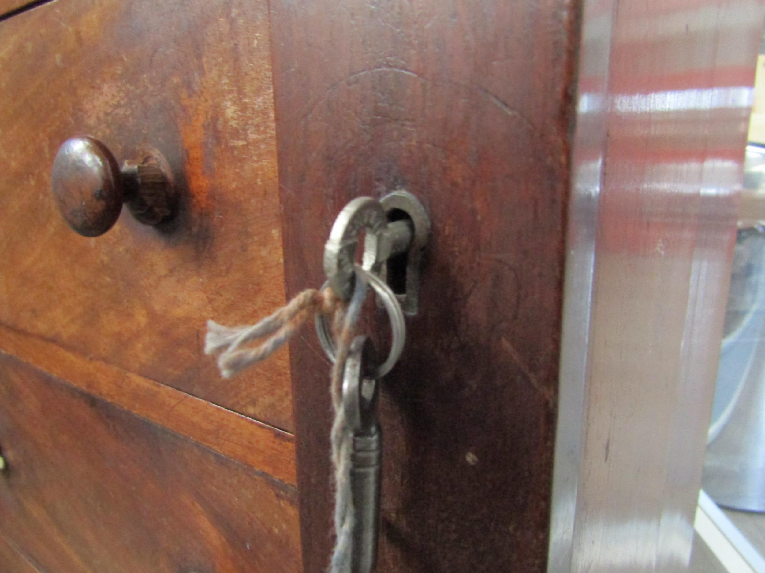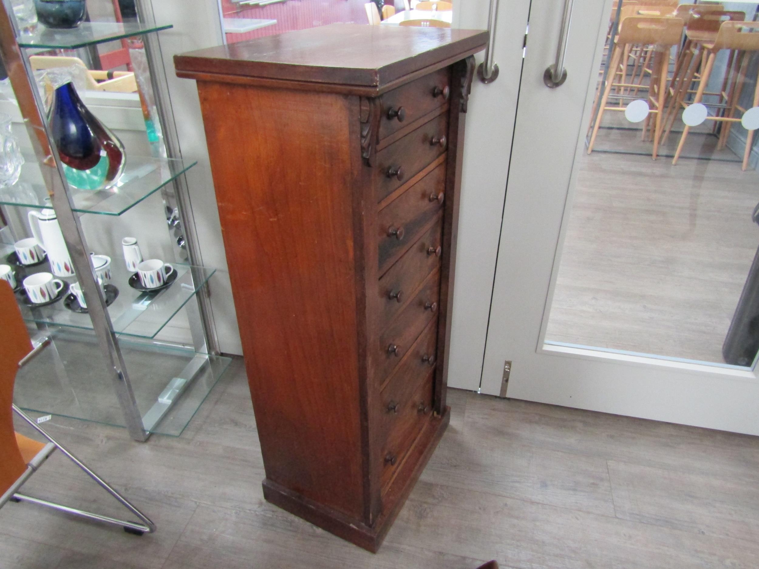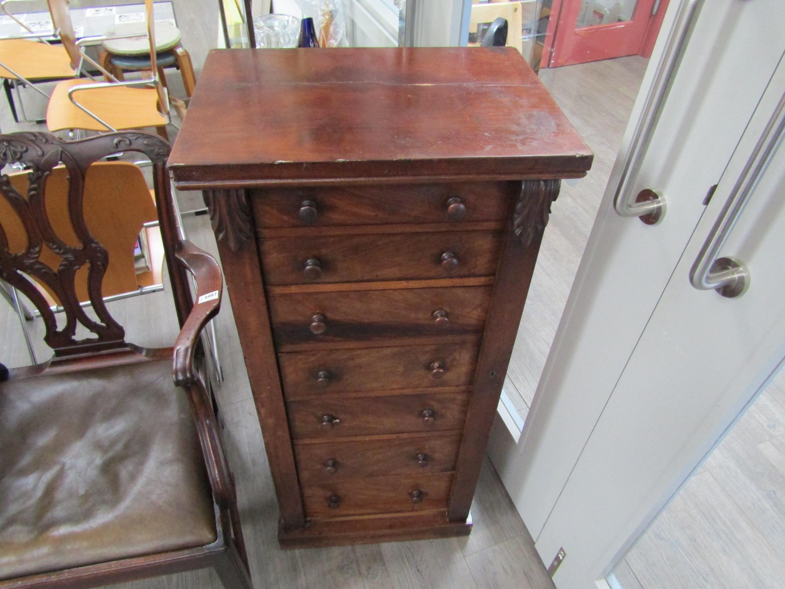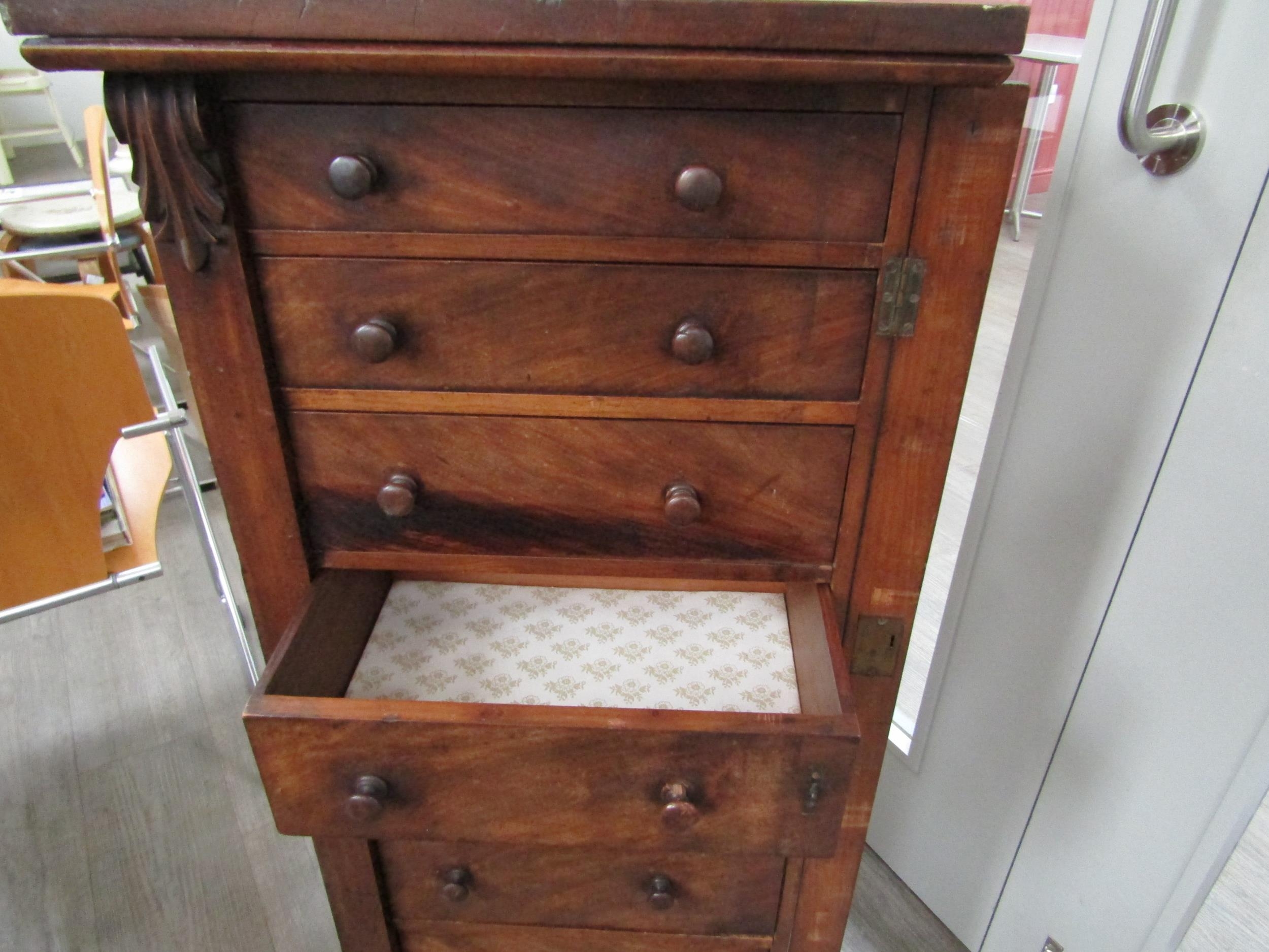 A 19th Century mahogany wellington chest of seven graduating drawers (one handle damaged), key with porter, 112cm x 51cm x 37cm