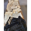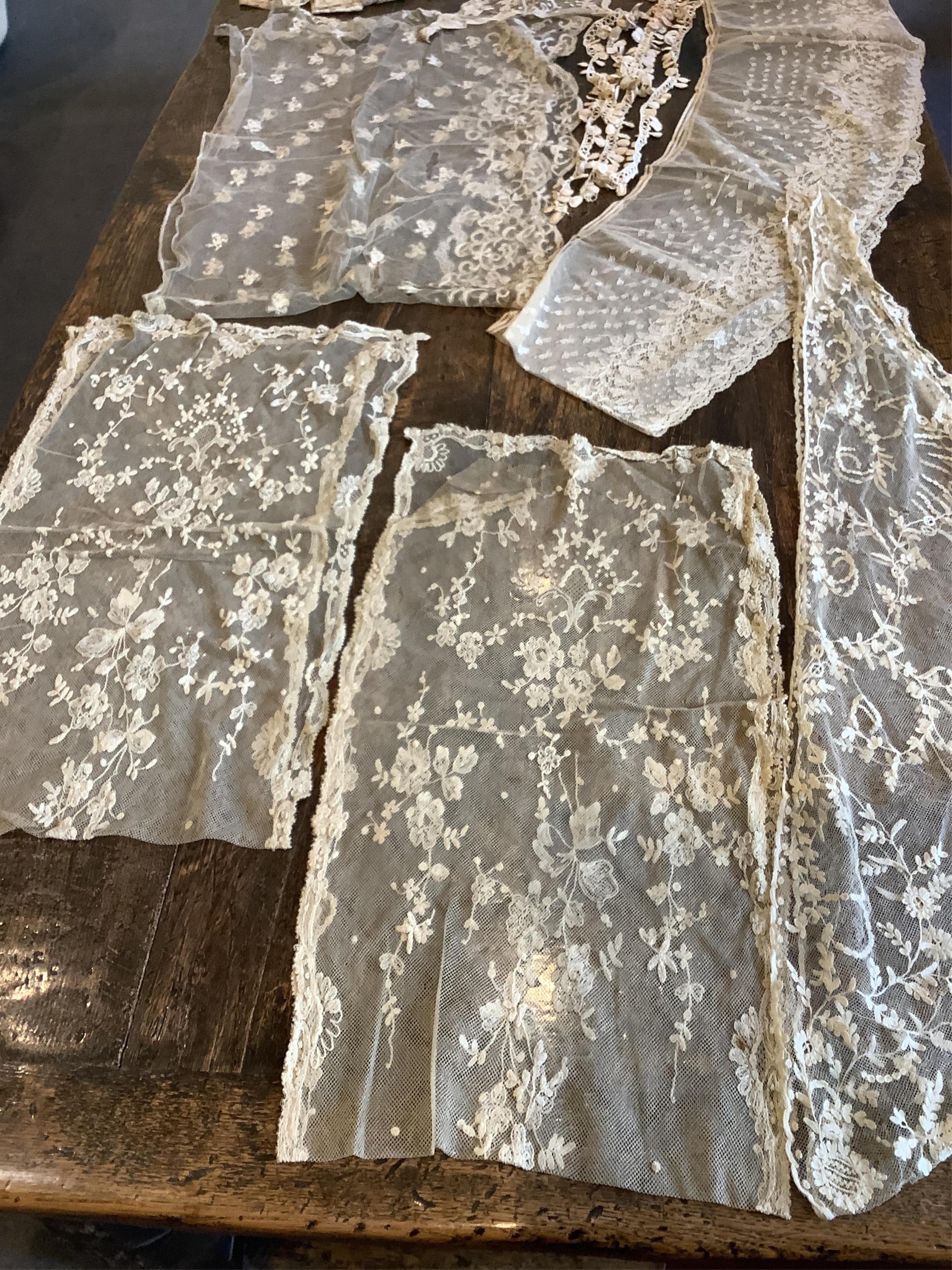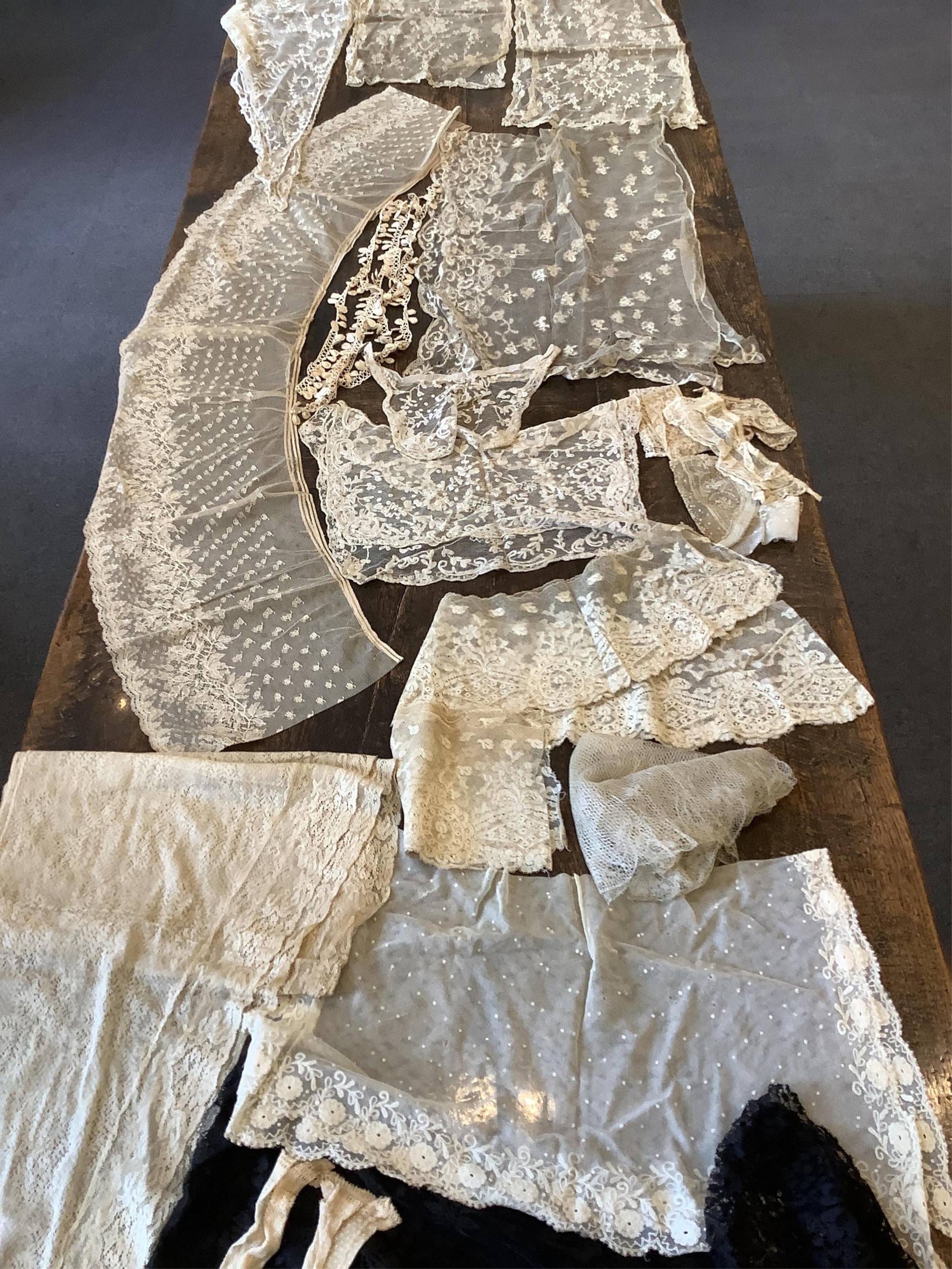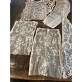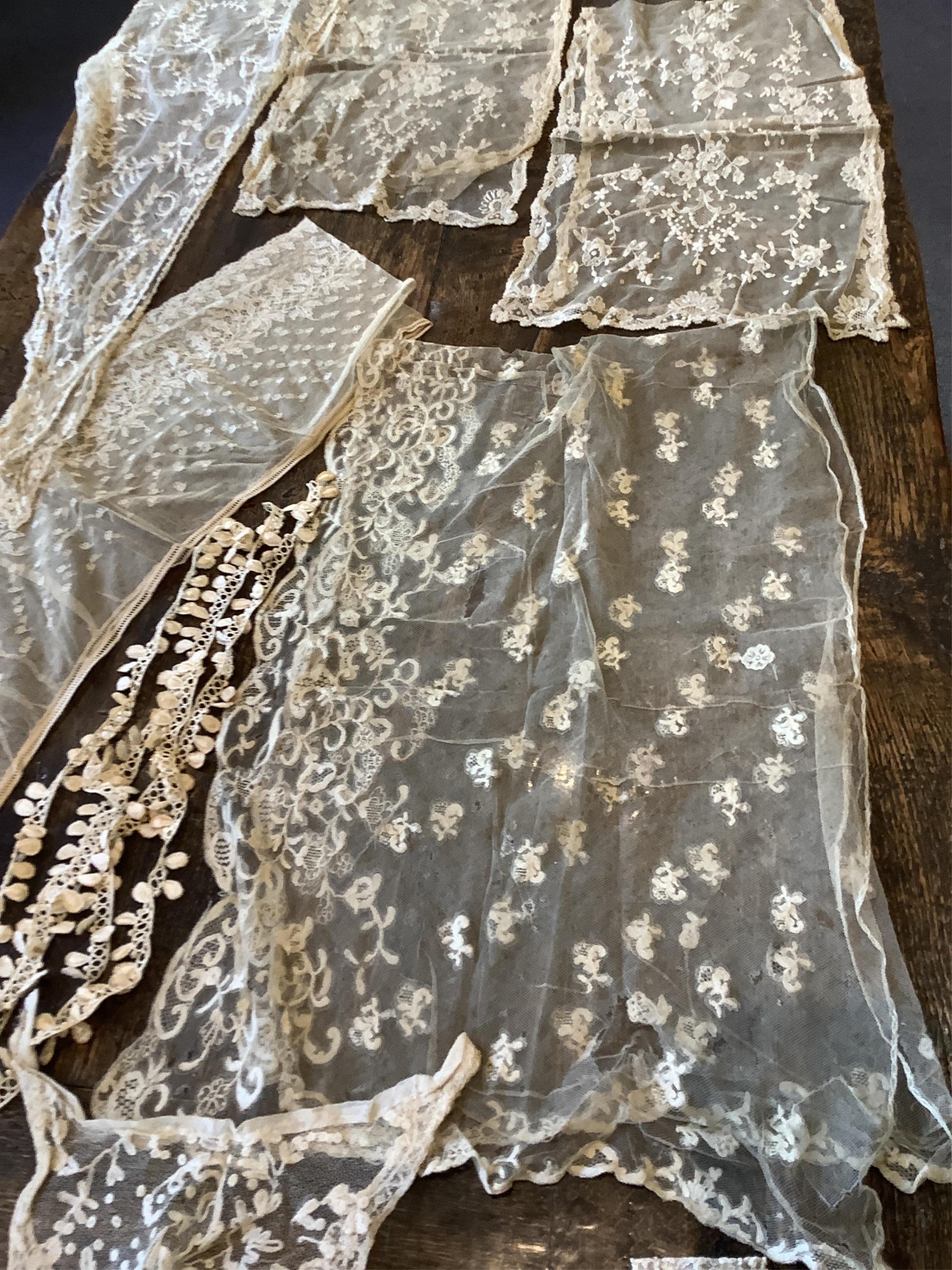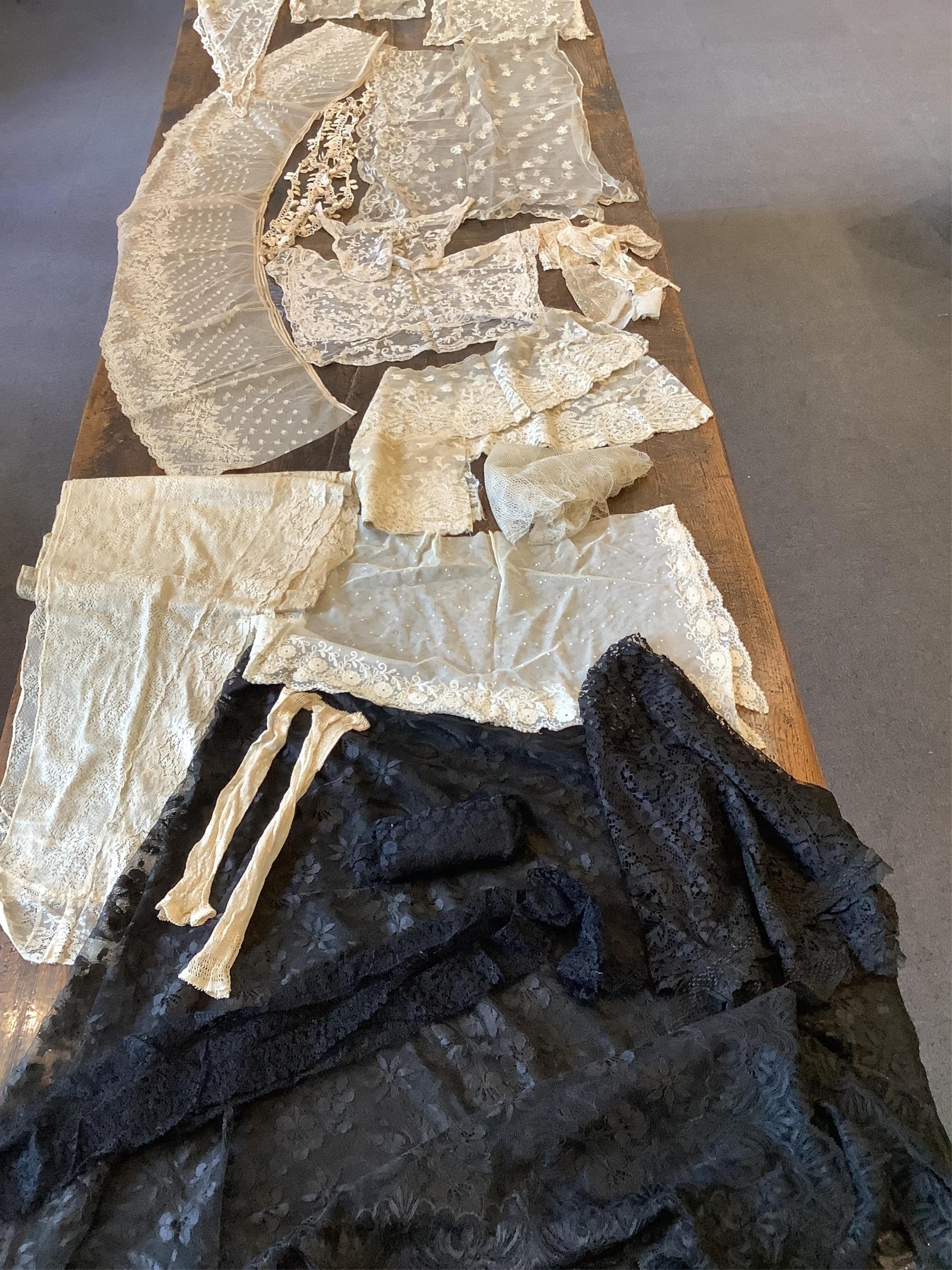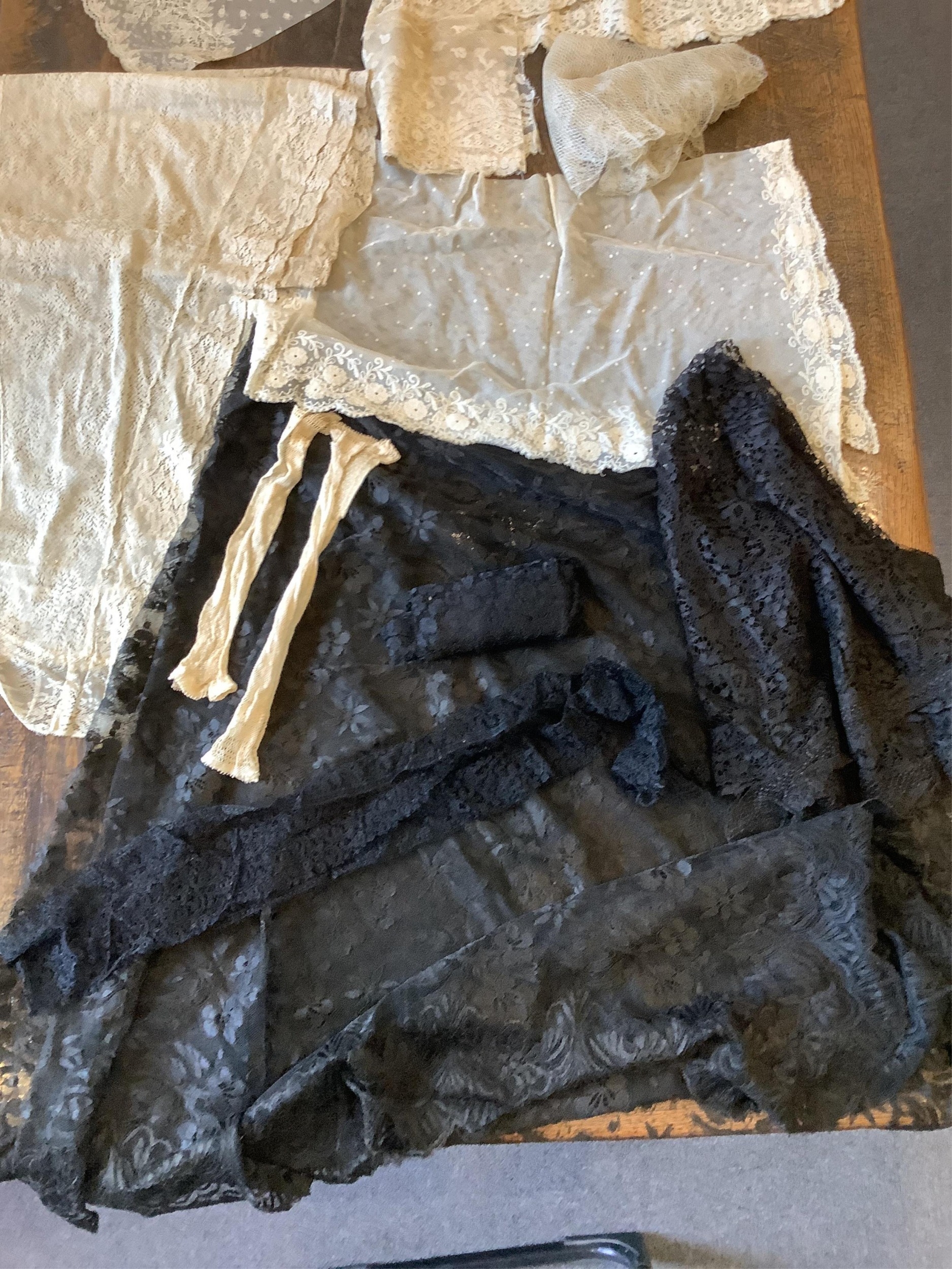 A good collection of late 19th and 20th century cream and black machine made laces, including, stoles, wide trimming, collars, silk mittens and a mantilla, 160cm x 172cm.