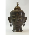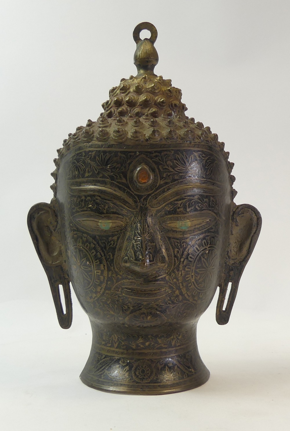 A bronze or brass Southeast Asian style Buddha head with etched designs. (H: 35cm)