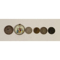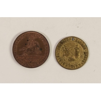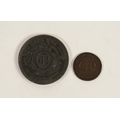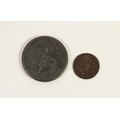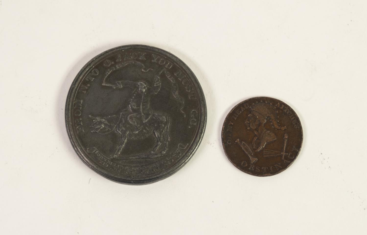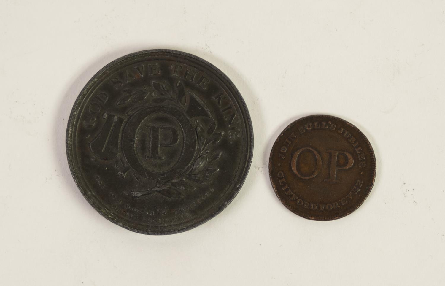 LARGE, EARLY 19th CENTURY BRONZE MEDALLION REGARDING THE COVENT GARDEN OLD PRICE RIOTS 1809, the reverse featuring probably John Bull seated on a cow with a human head and waving two penants declaring Old Price to one and Open Boxes to the other, the words from 'N-to-O Jack you must go' above, smaller satirical/poetical text below, obverse with musical trophy and P within an O (Old Prices), 'God save the King' above a smaller text below, 1 11/16in (4.3cm) diameter (EF) and a SMALLER RELATED COPPER MEDALLION, obverse centred with OP and text around 'John Bulls Jubilee - Clifford forever', reverse with bust of a jester, trumpet and rattle and text around 'On my head aitches - obstinacy', 1in (2.5cm) diameter (VF) (2)
