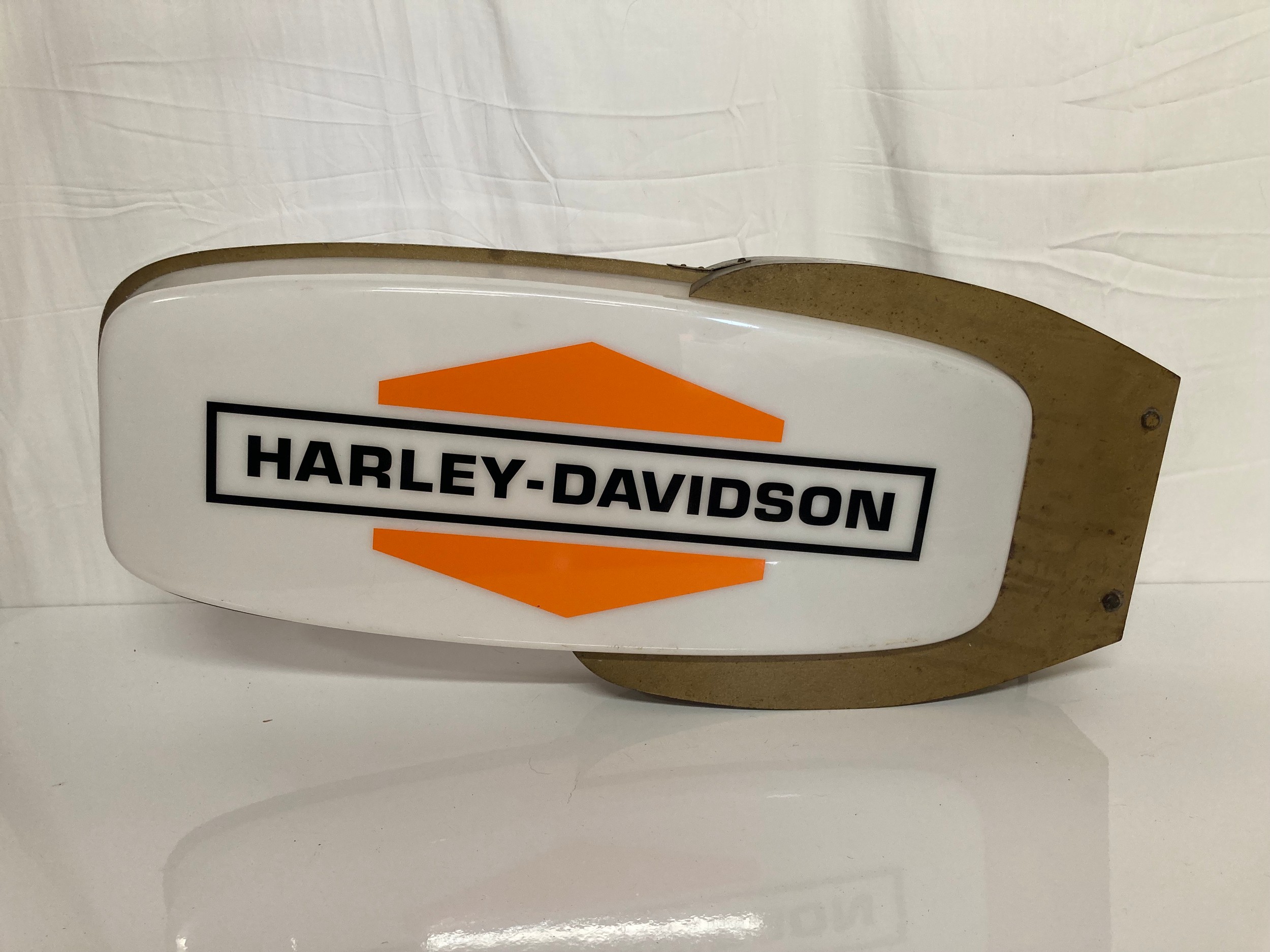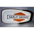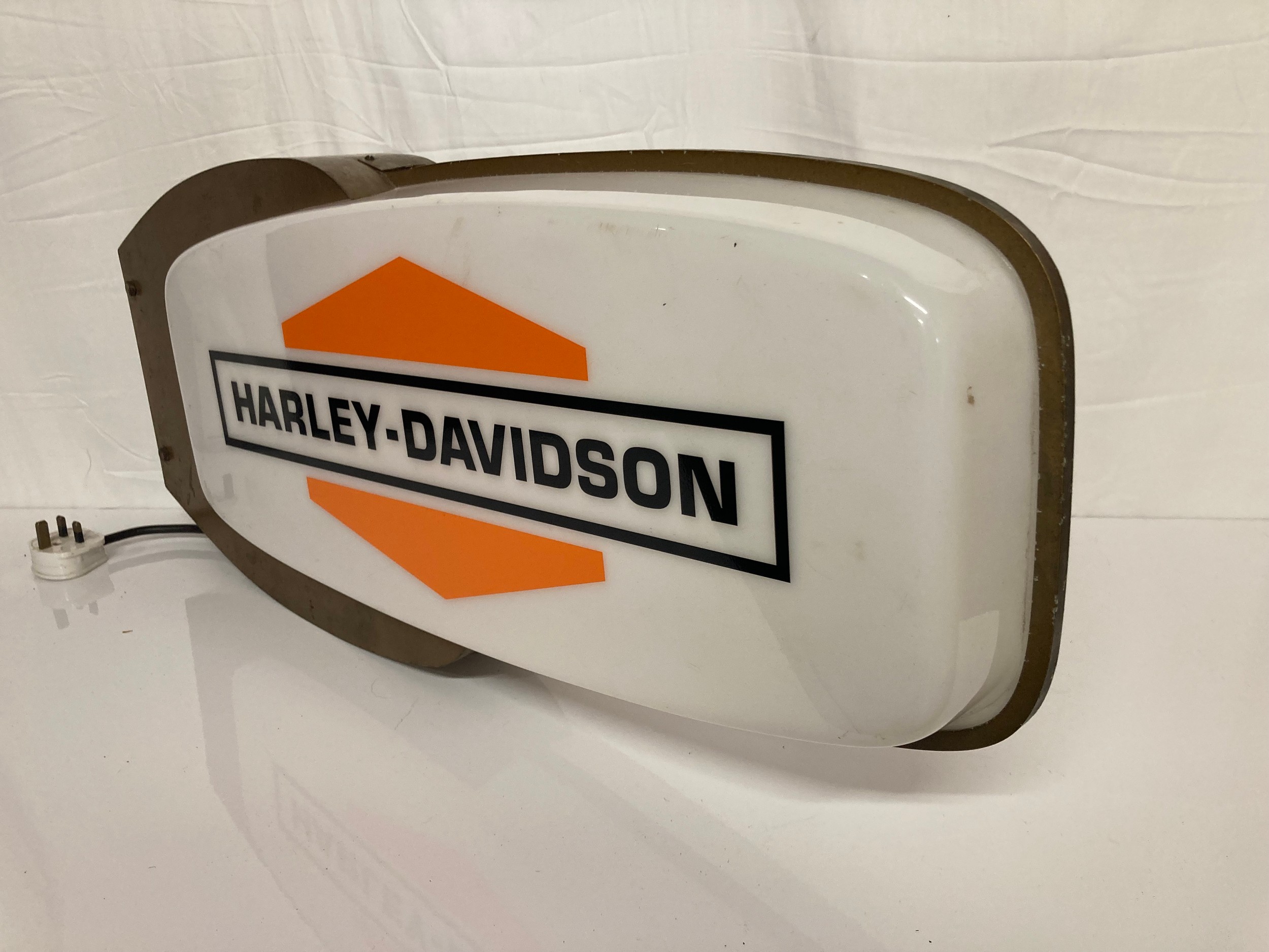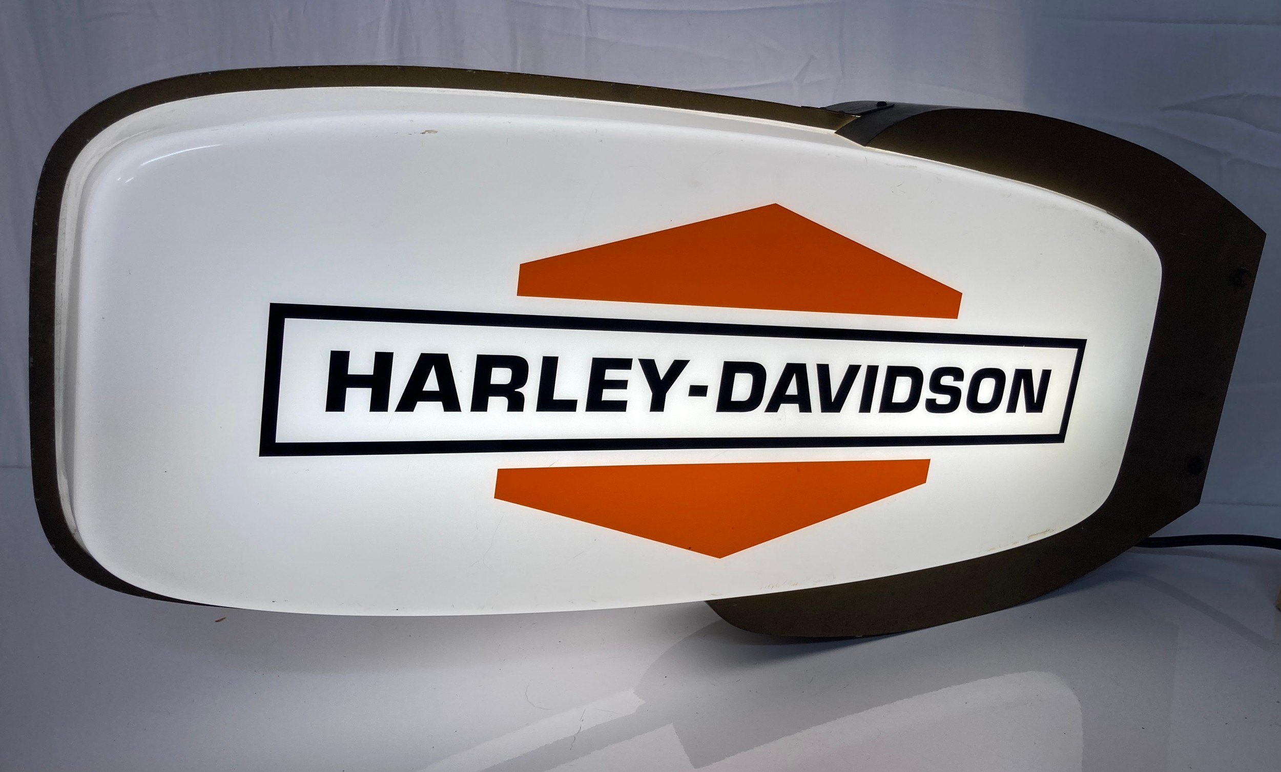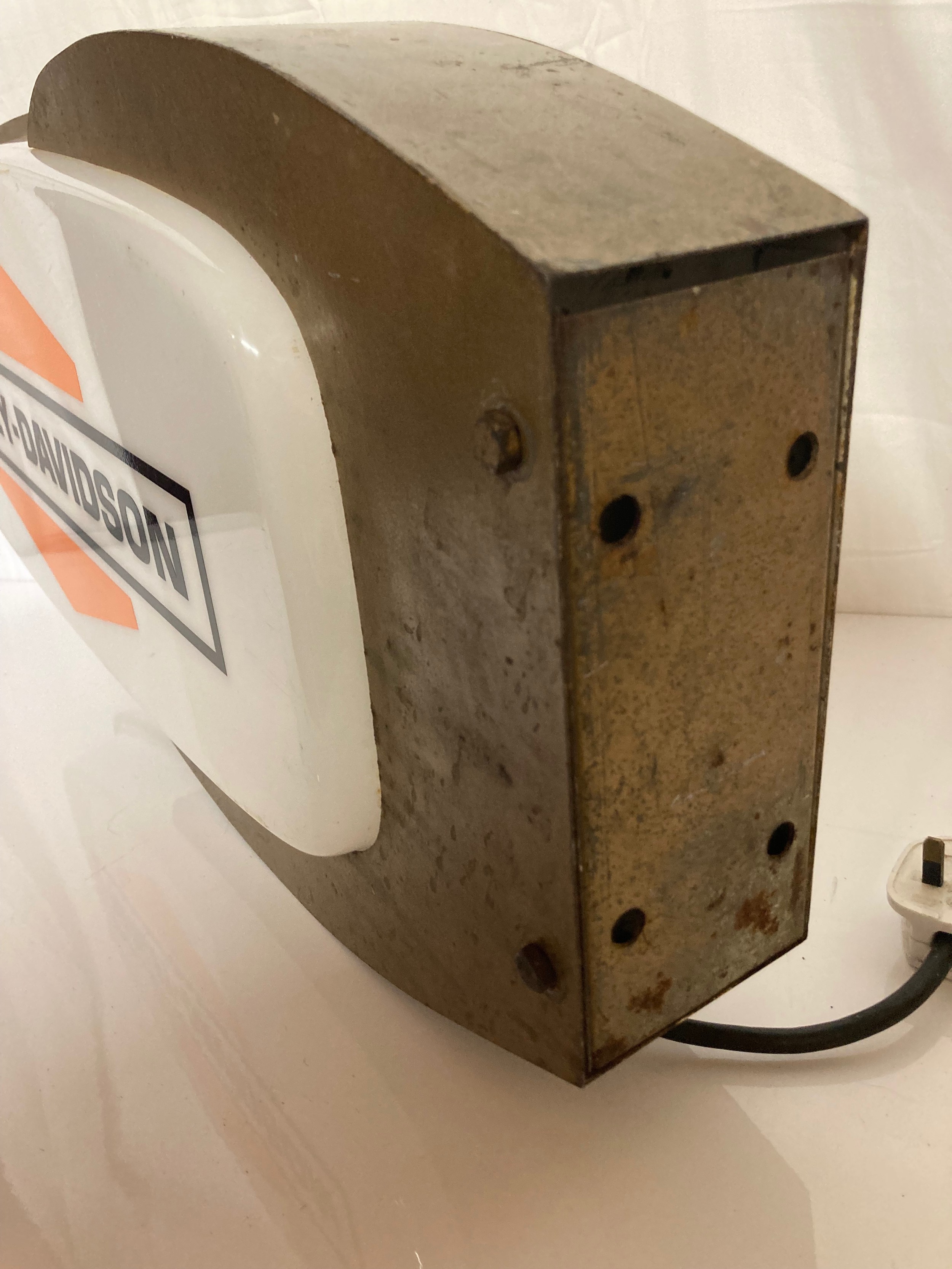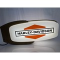 Automobilia, motorcycle garage, an illuminated Wall mounting double sided Harley Davidson sign, 30 inches x 13 inches 5 inches wide.