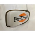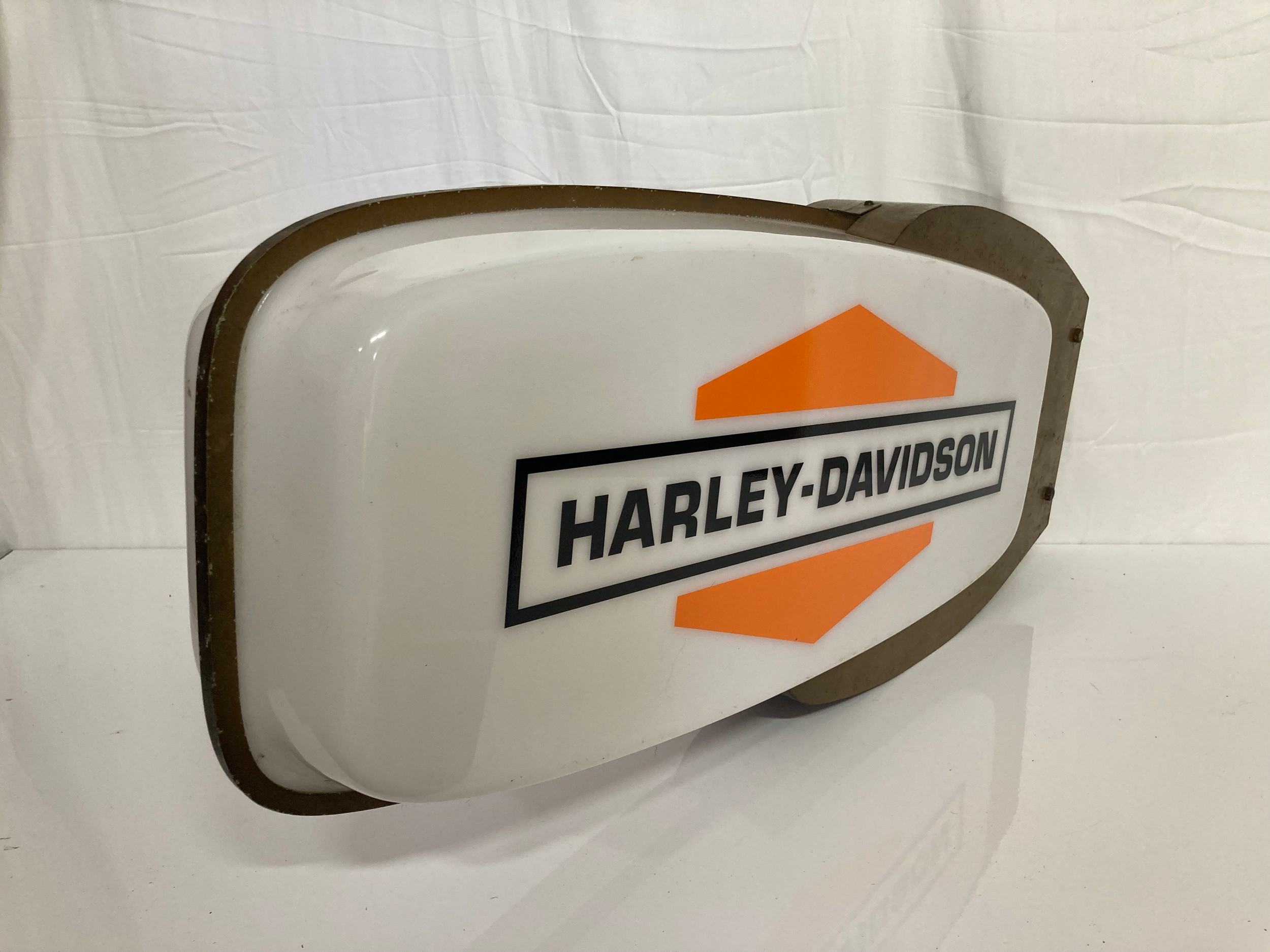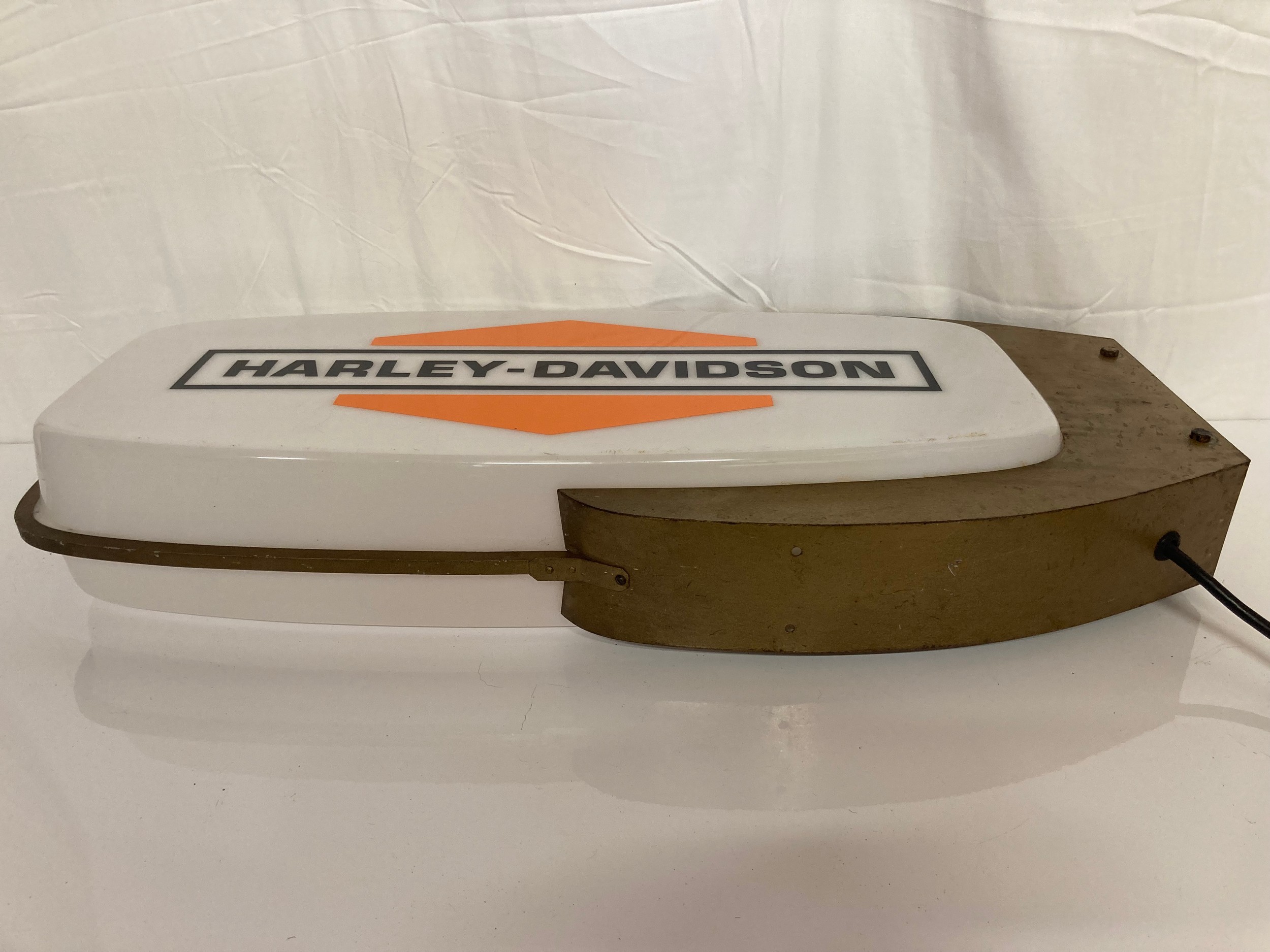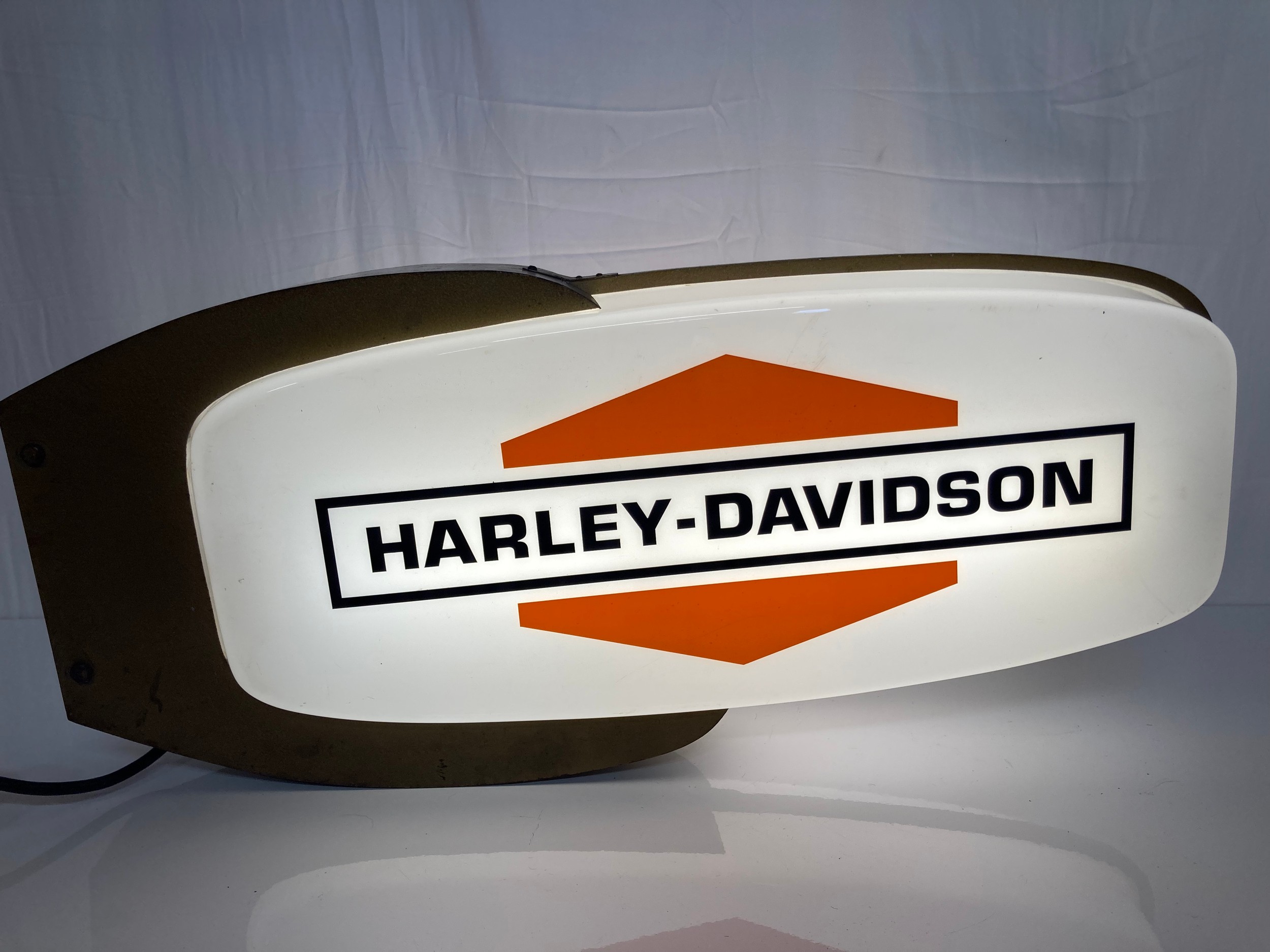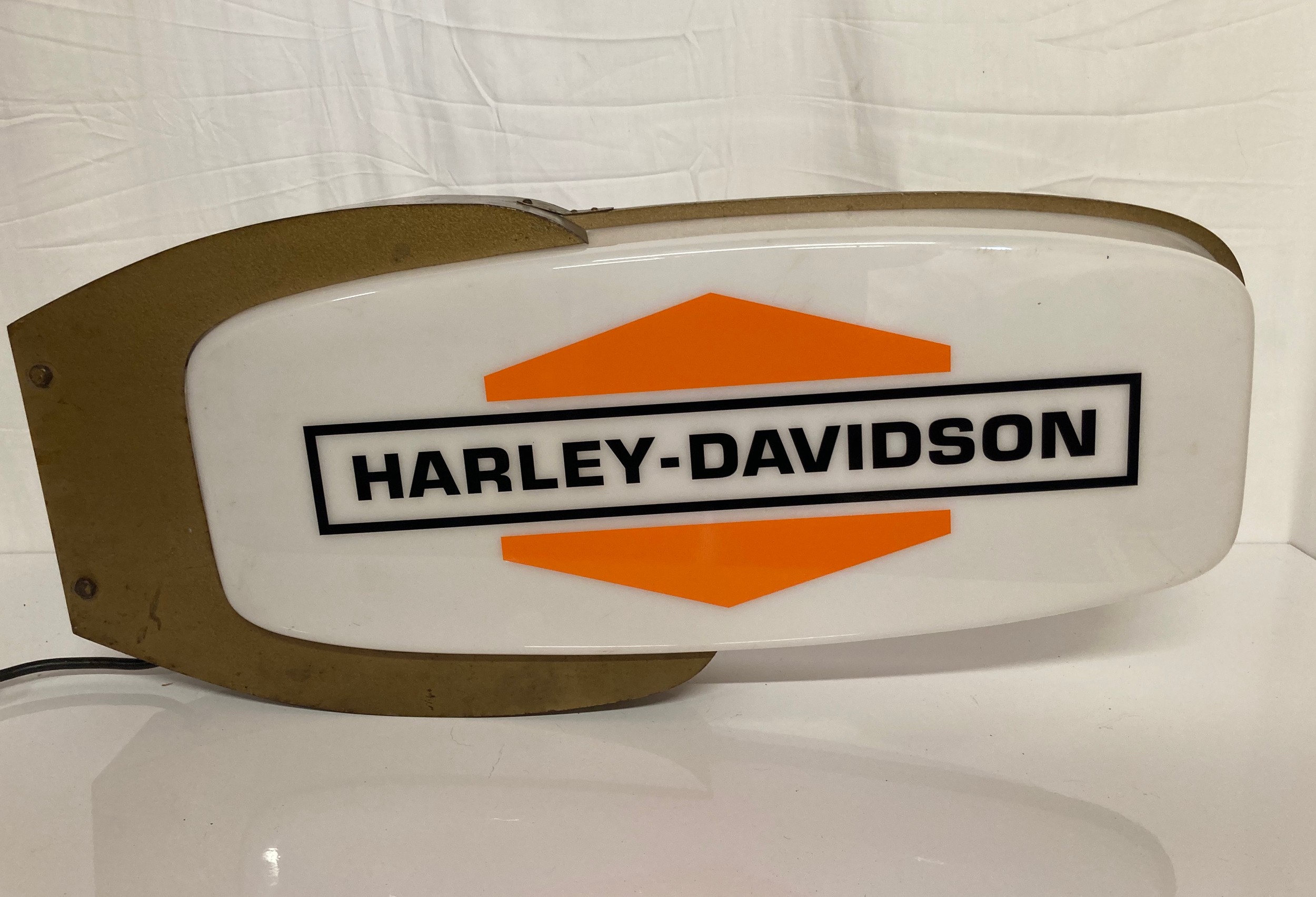 Automobilia, motorcycle garage, an illuminated Wall mounting double sided Harley Davidson sign, 30 inches x 13 inches 5 inches wide.
