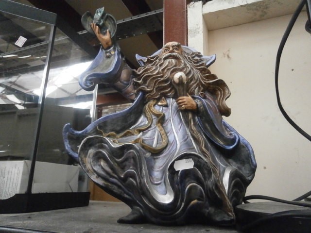 Lot inc floor standing lamp, Wizard figurine, glass vase