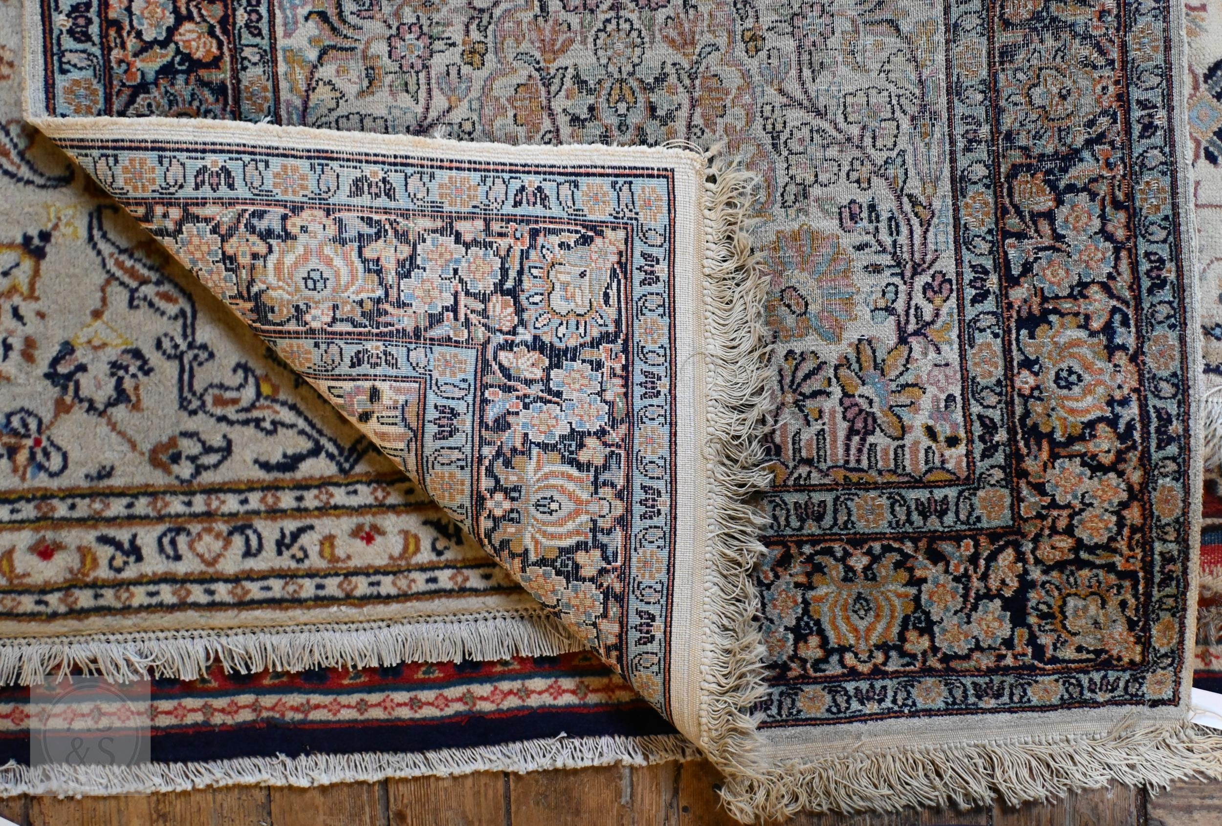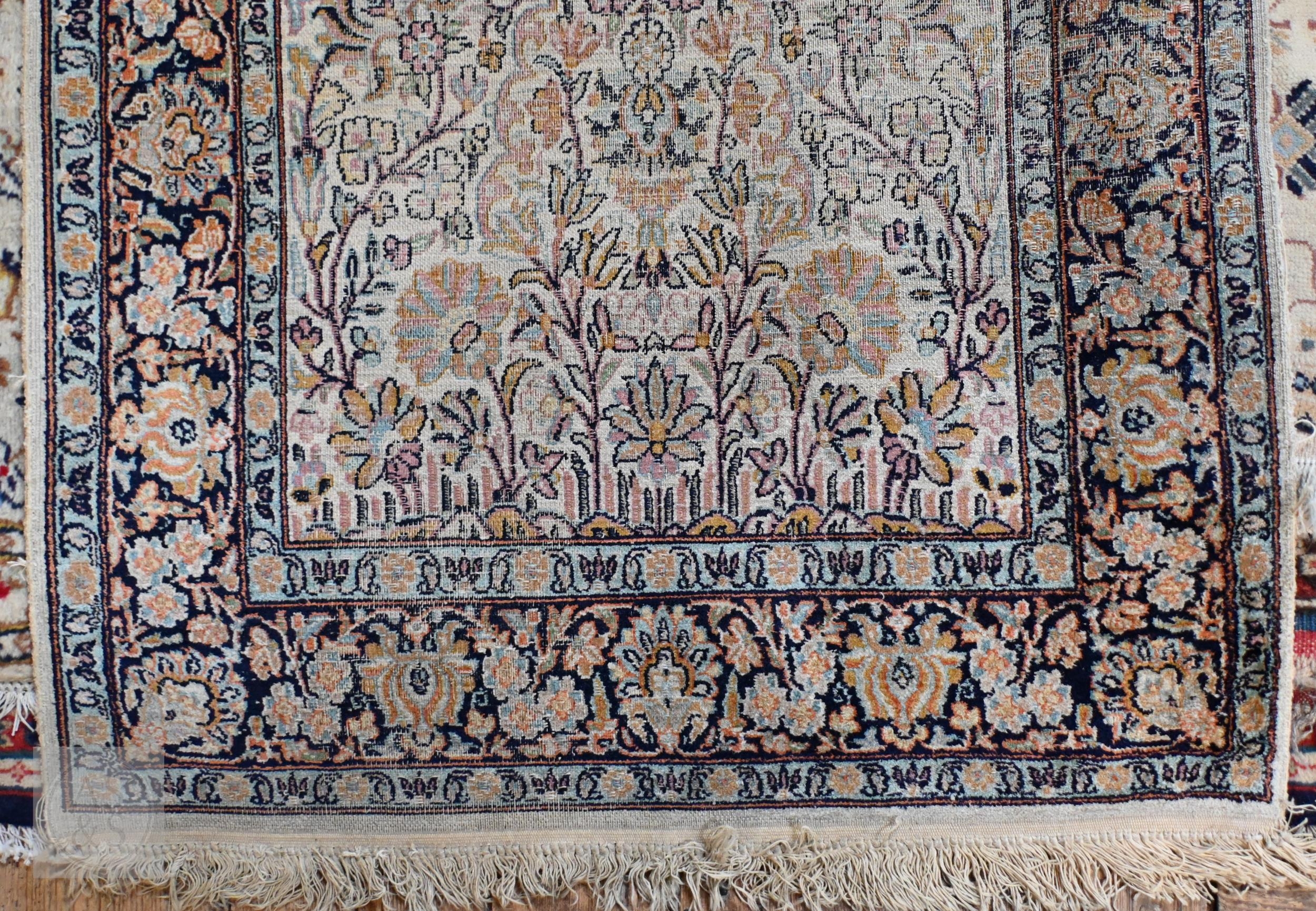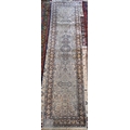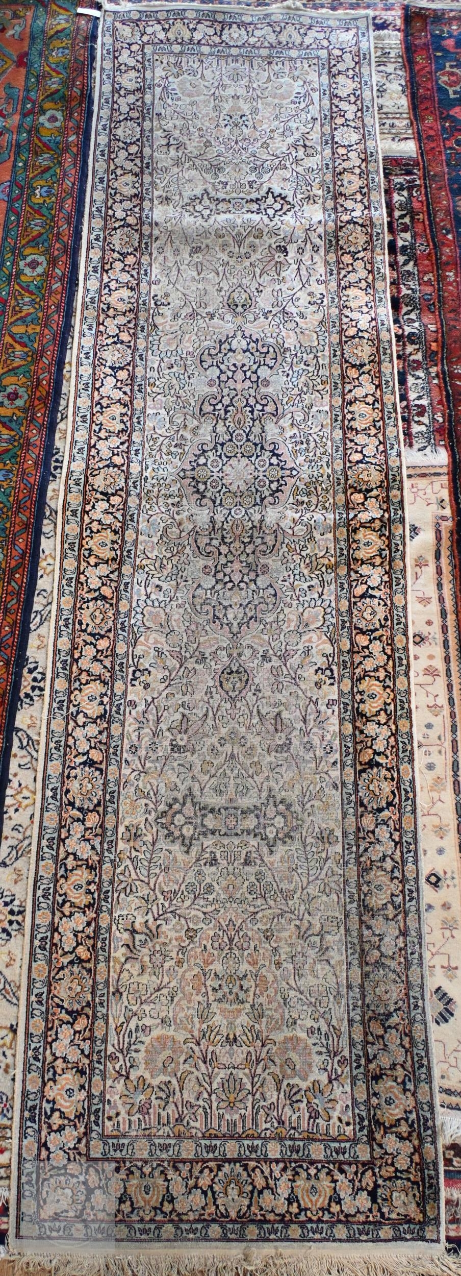 An old silk handmade Kahan runner, the floral garden design on worn camel ground, 314 cm x 77 cm