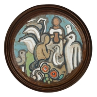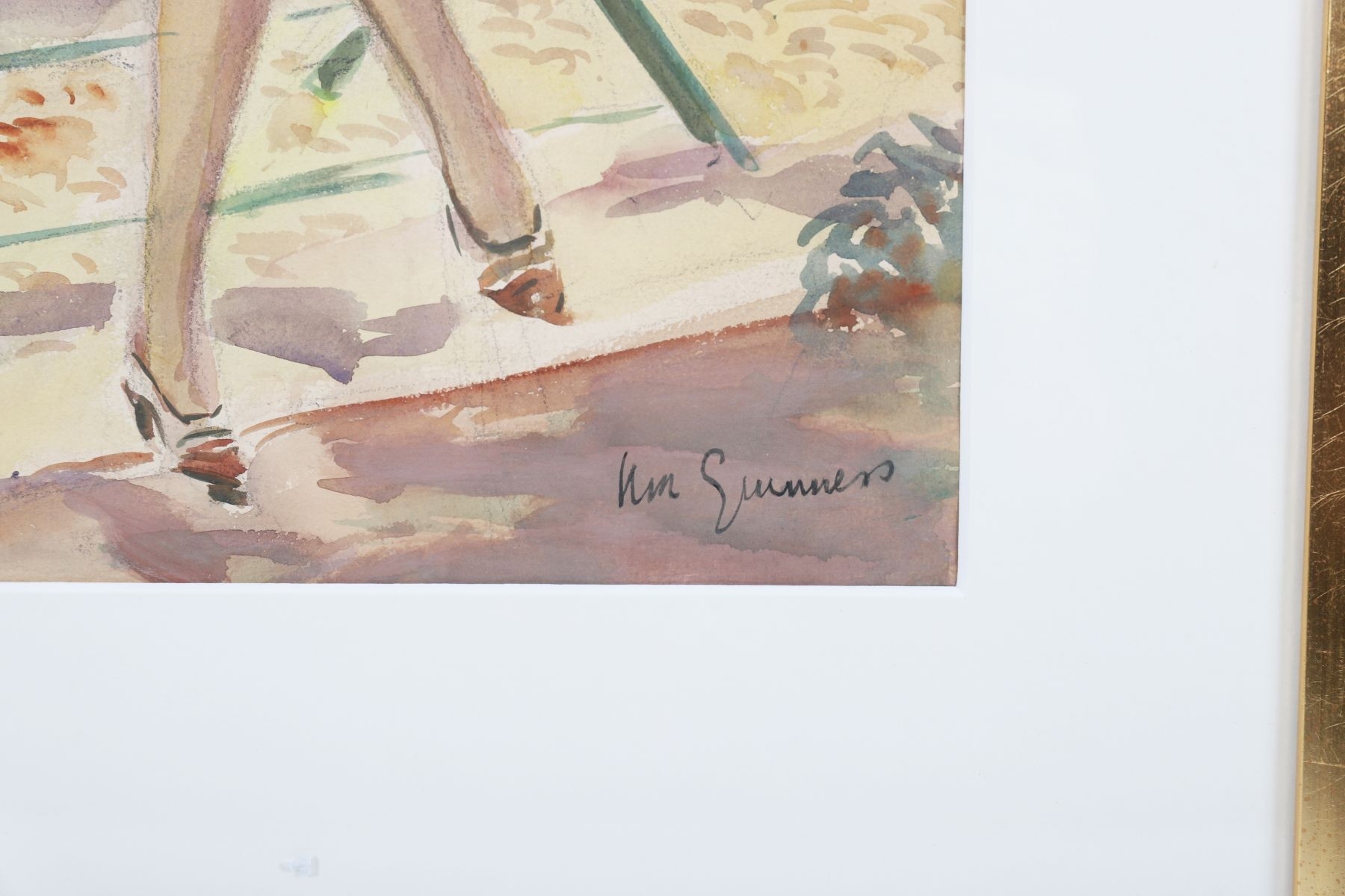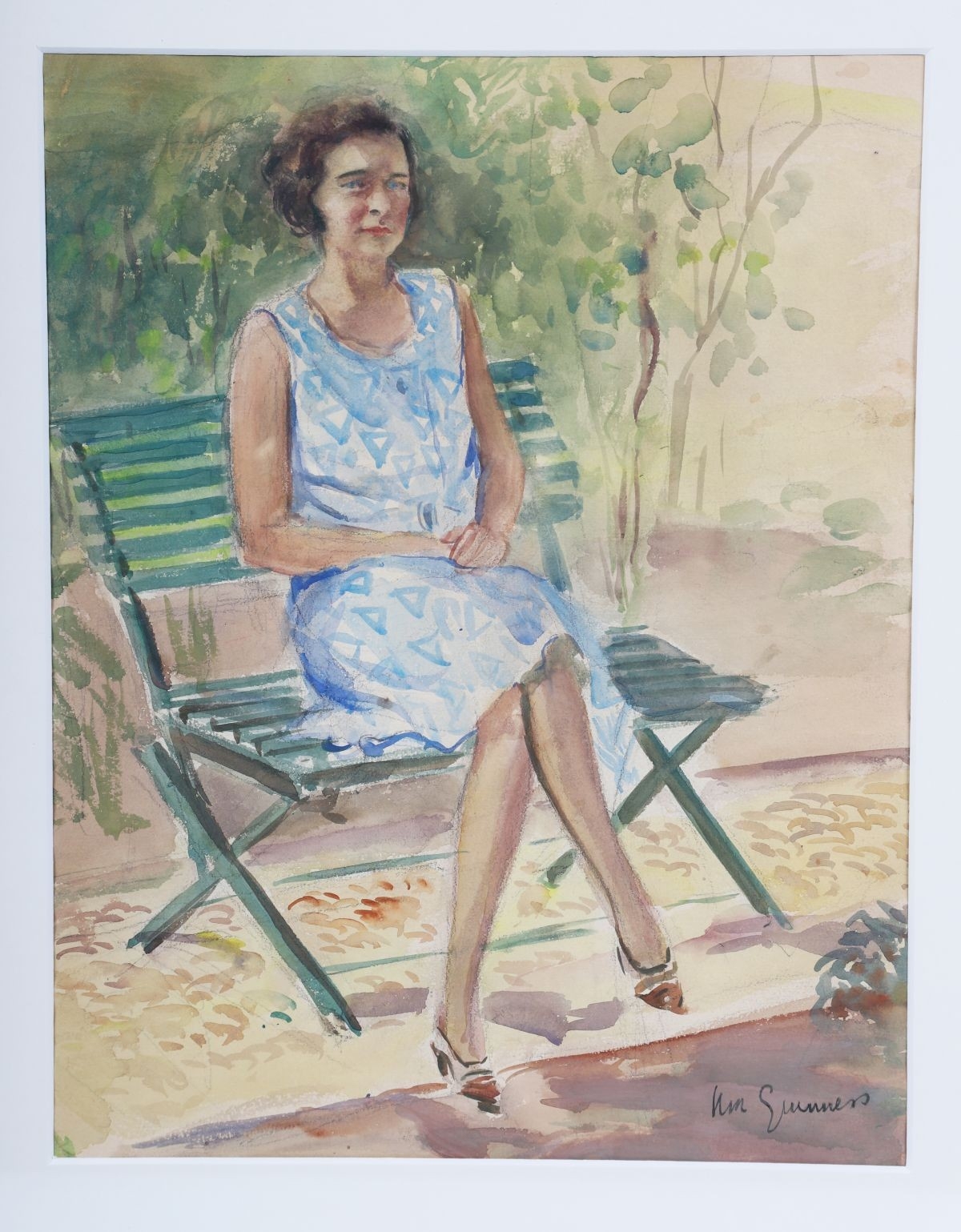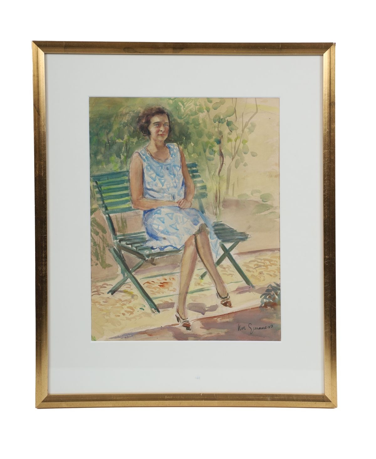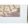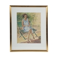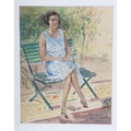 A refined and expressive watercolour portrait in which McGuinness captures a seated woman in a light summer dress, positioned in a sunlit garden setting. The artist’s modernist sensibility is evident in the confident linear treatment, rhythmic composition, and harmonious interplay of warm and cool tones. The work exudes poise and quiet elegance, reflecting McGuinness’s mastery in combining figurative clarity with her distinctive decorative style. Image: 33 x 26 cm. Framed: 51 x 42 cm. PICTURES AND PRINTS Thursday 11th December 2025 18:31:44