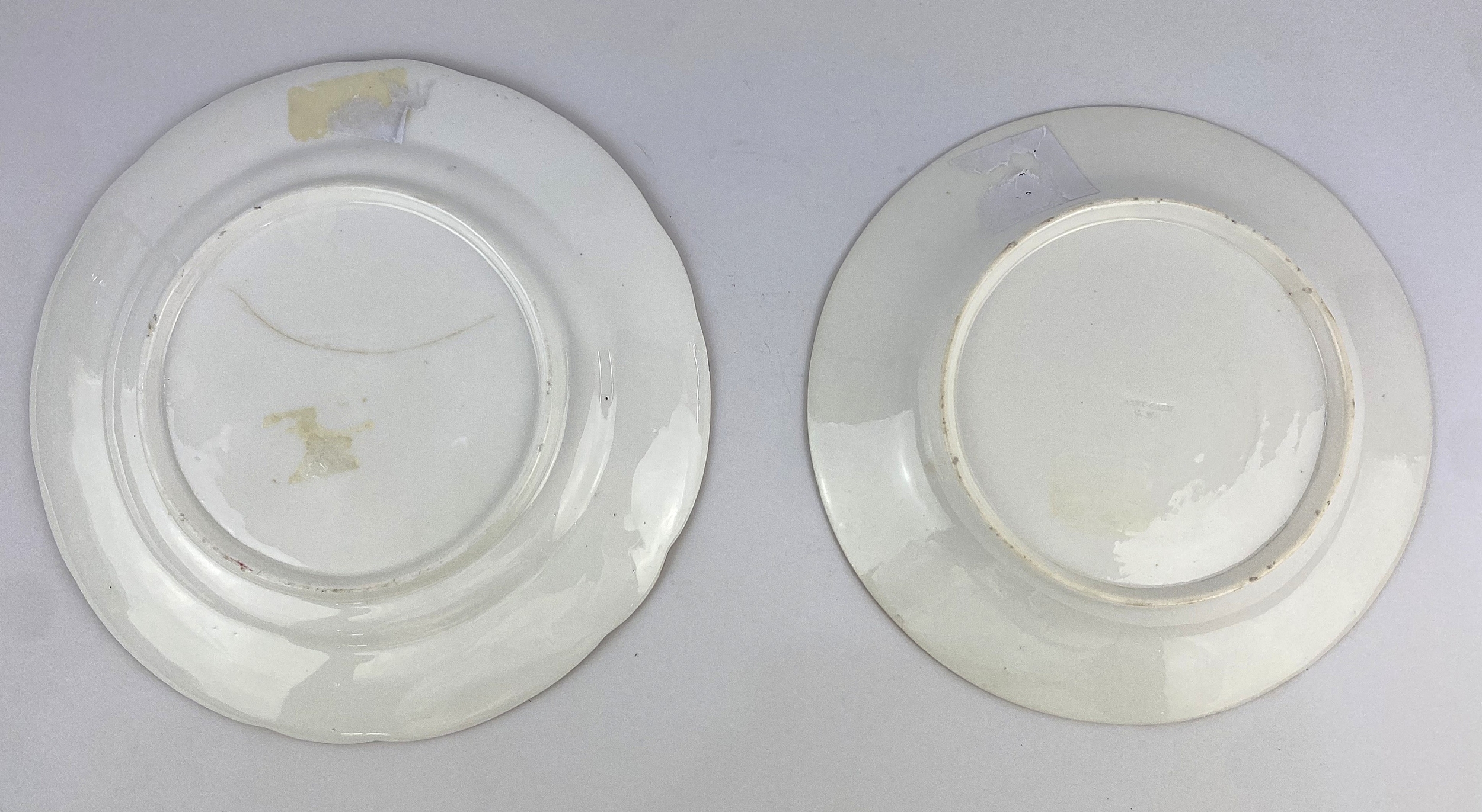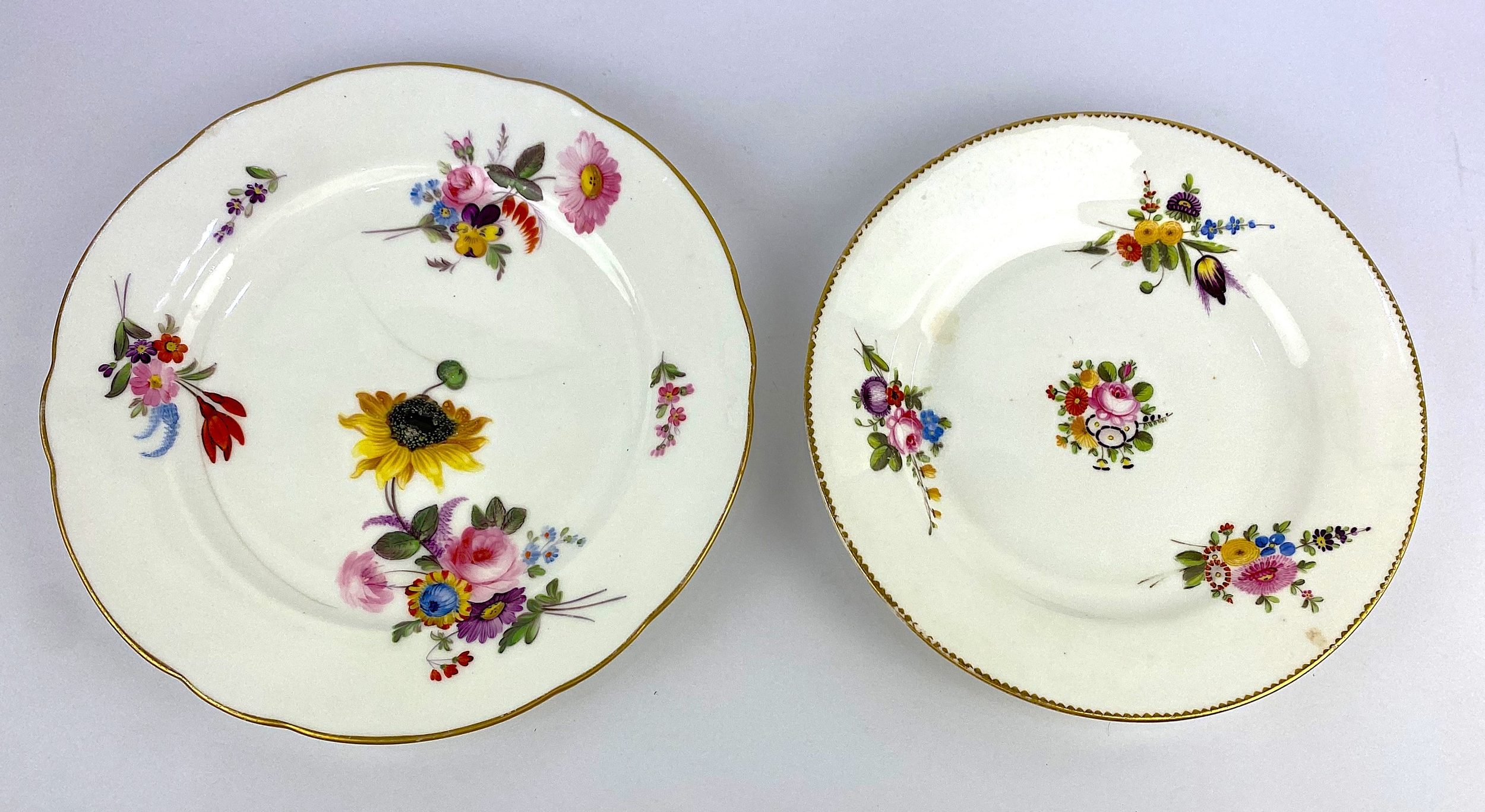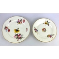 Two early 19th century Nantgarw porcelain plates with handpainted floral decoration and gilt rims, impressed marks to base, largest 24cm diameter (a/f)