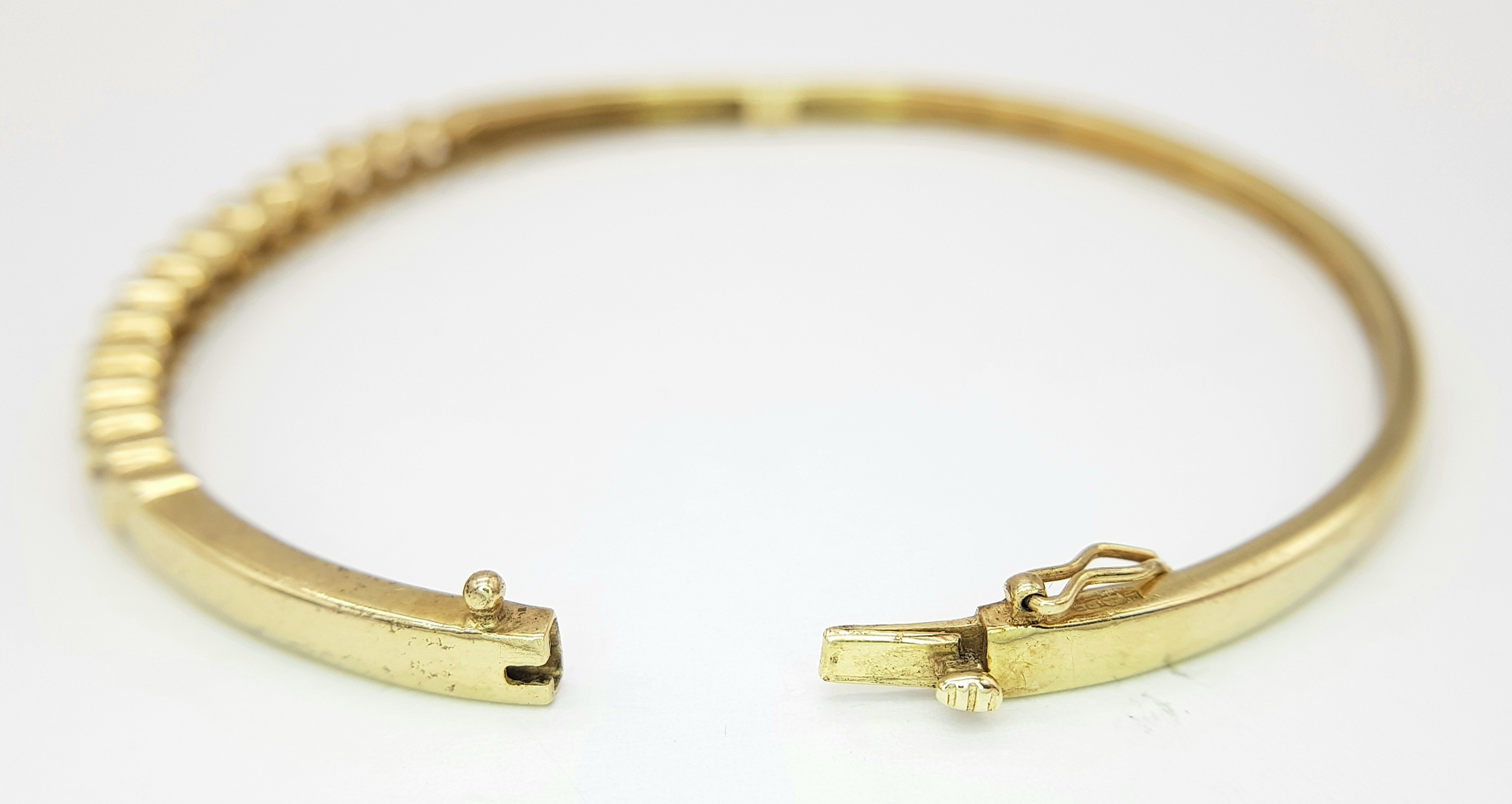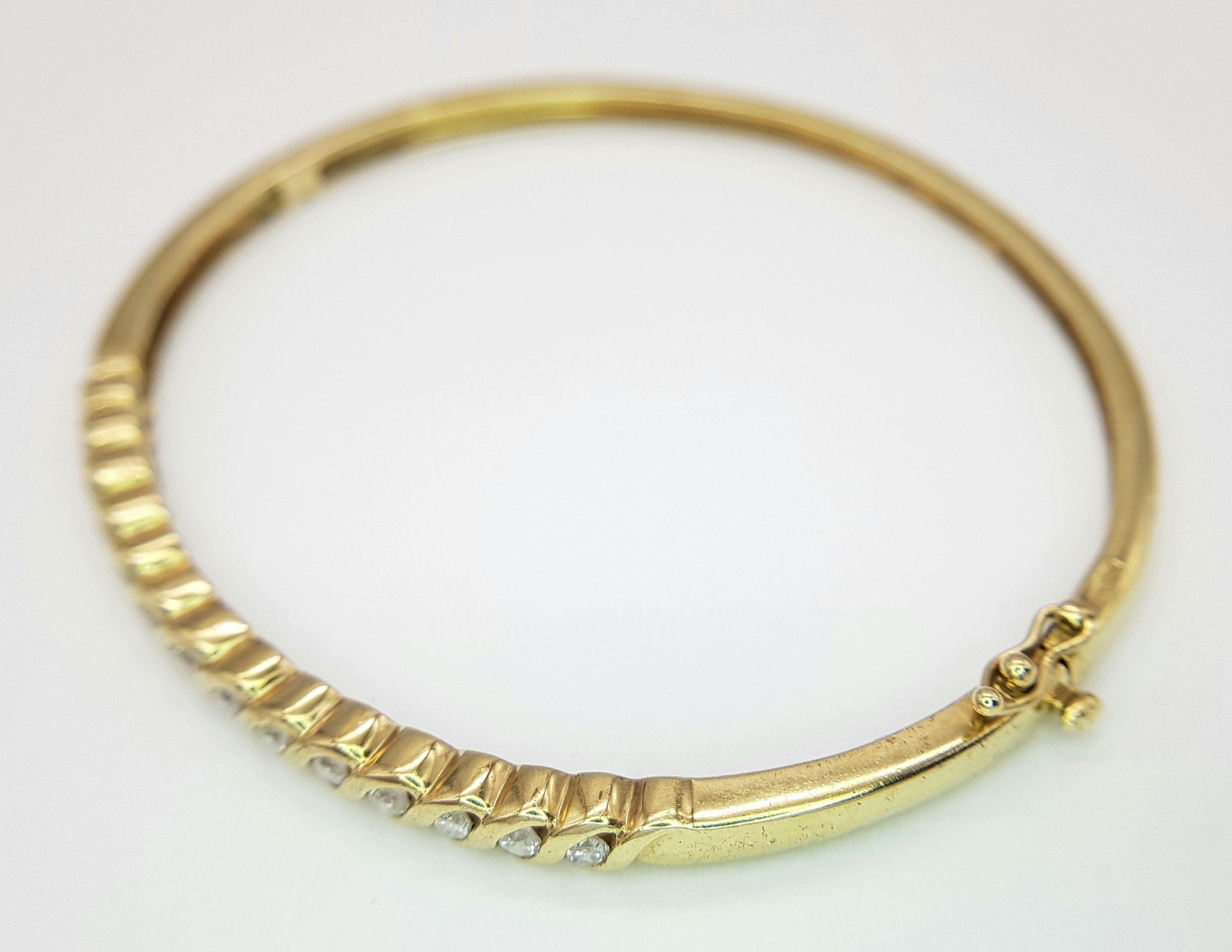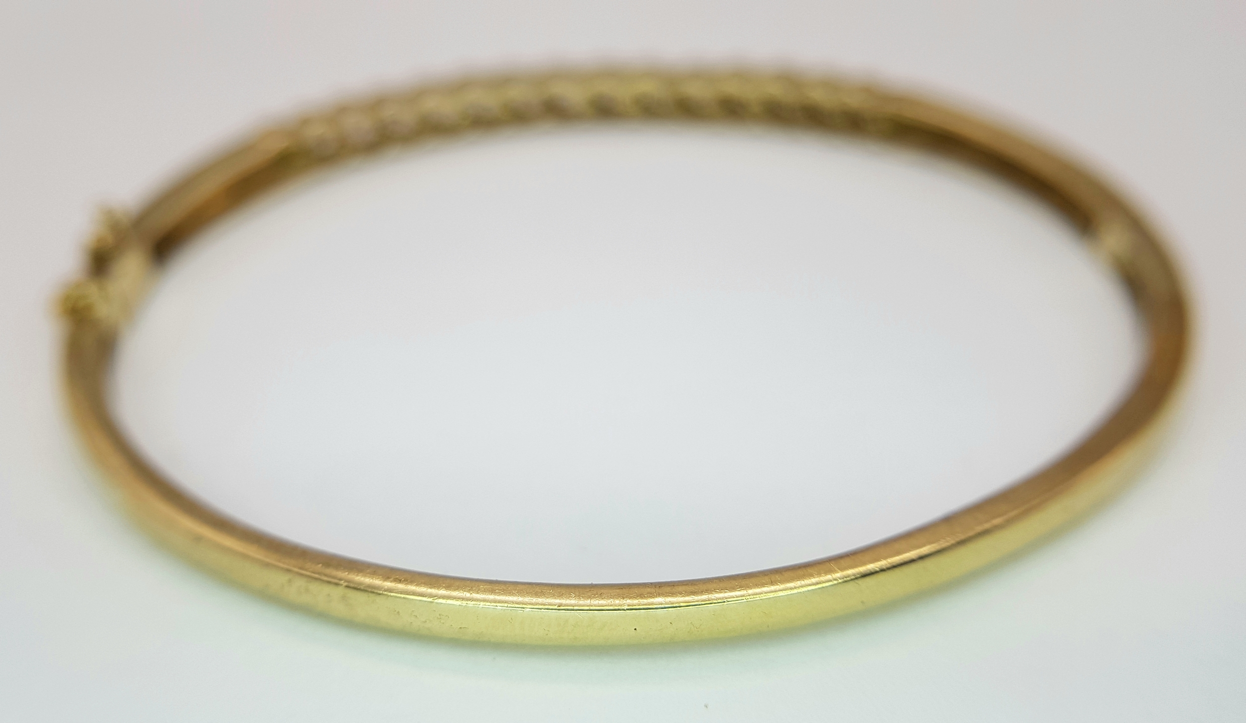 A 9K YELLOW GOLD DIAMOND SET BANGLE 9.1G TOTAL WEIGHT, 0.45CT, 5CM x 6CM. REF: JB 3003