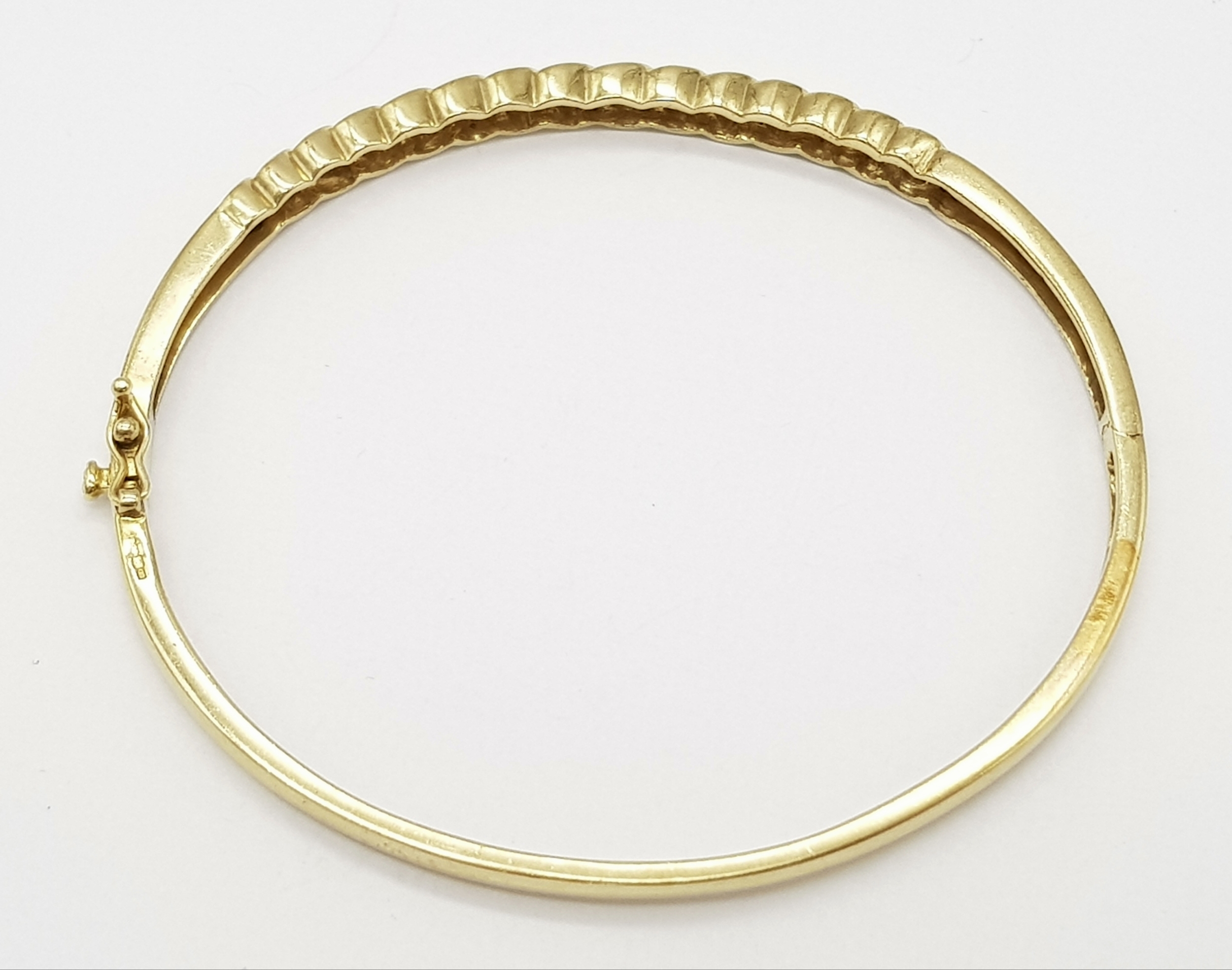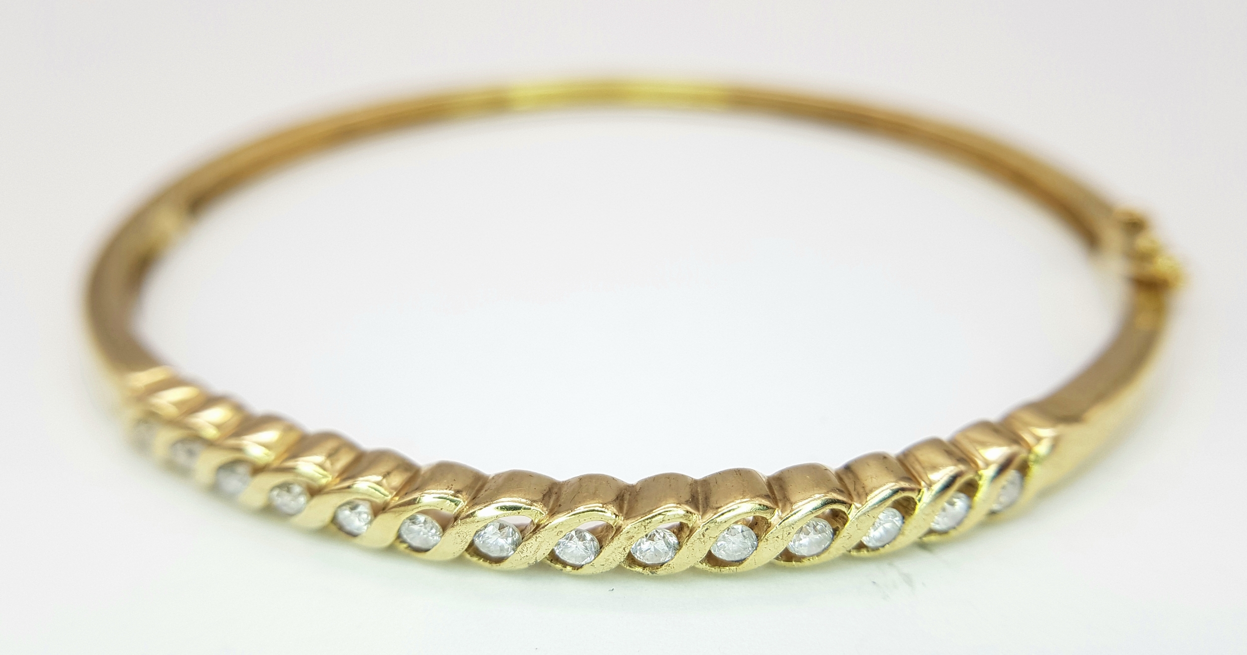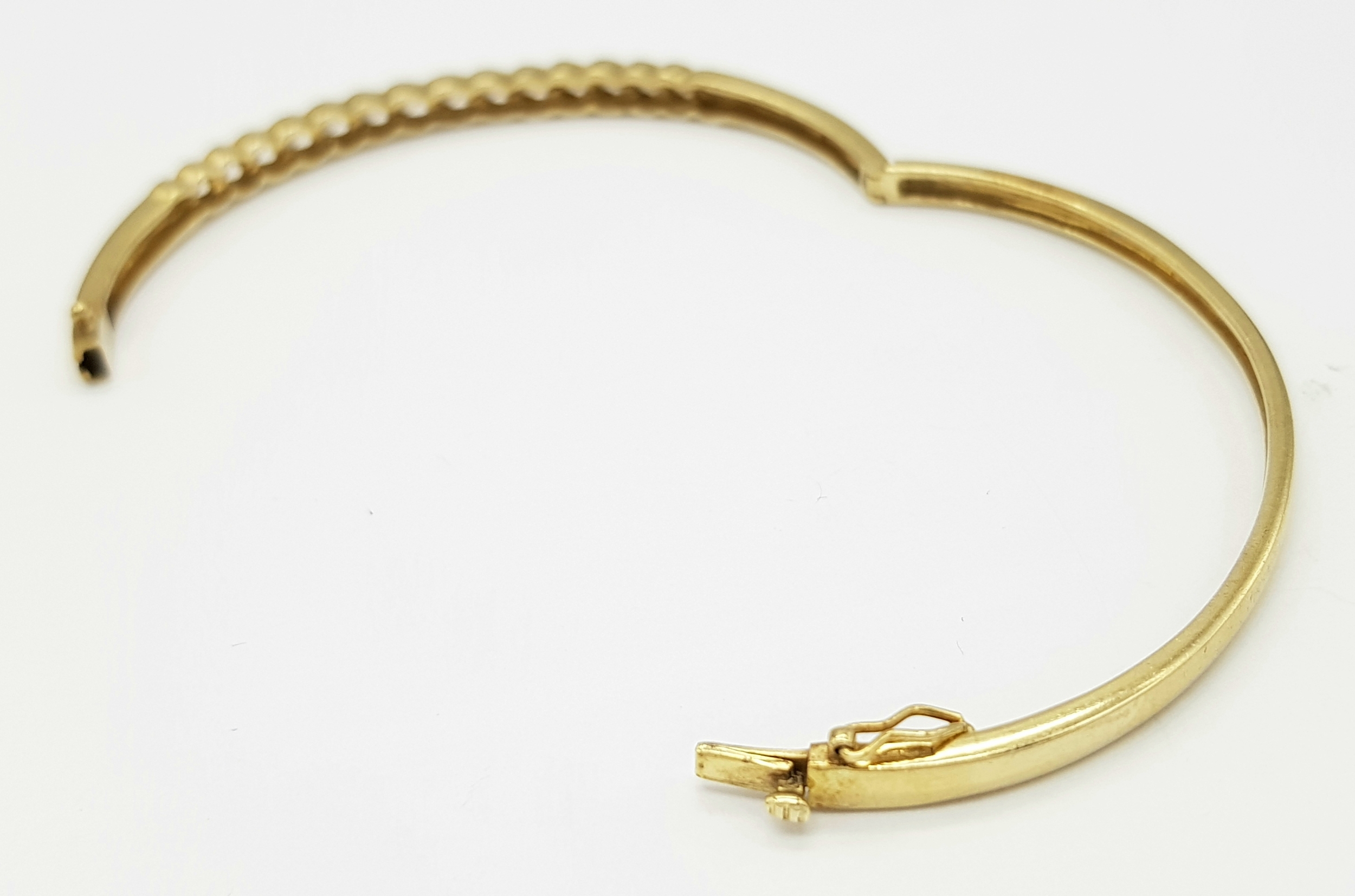 A 9K YELLOW GOLD DIAMOND SET BANGLE 9.1G TOTAL WEIGHT, 0.45CT, 5CM x 6CM. REF: JB 3003