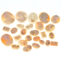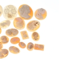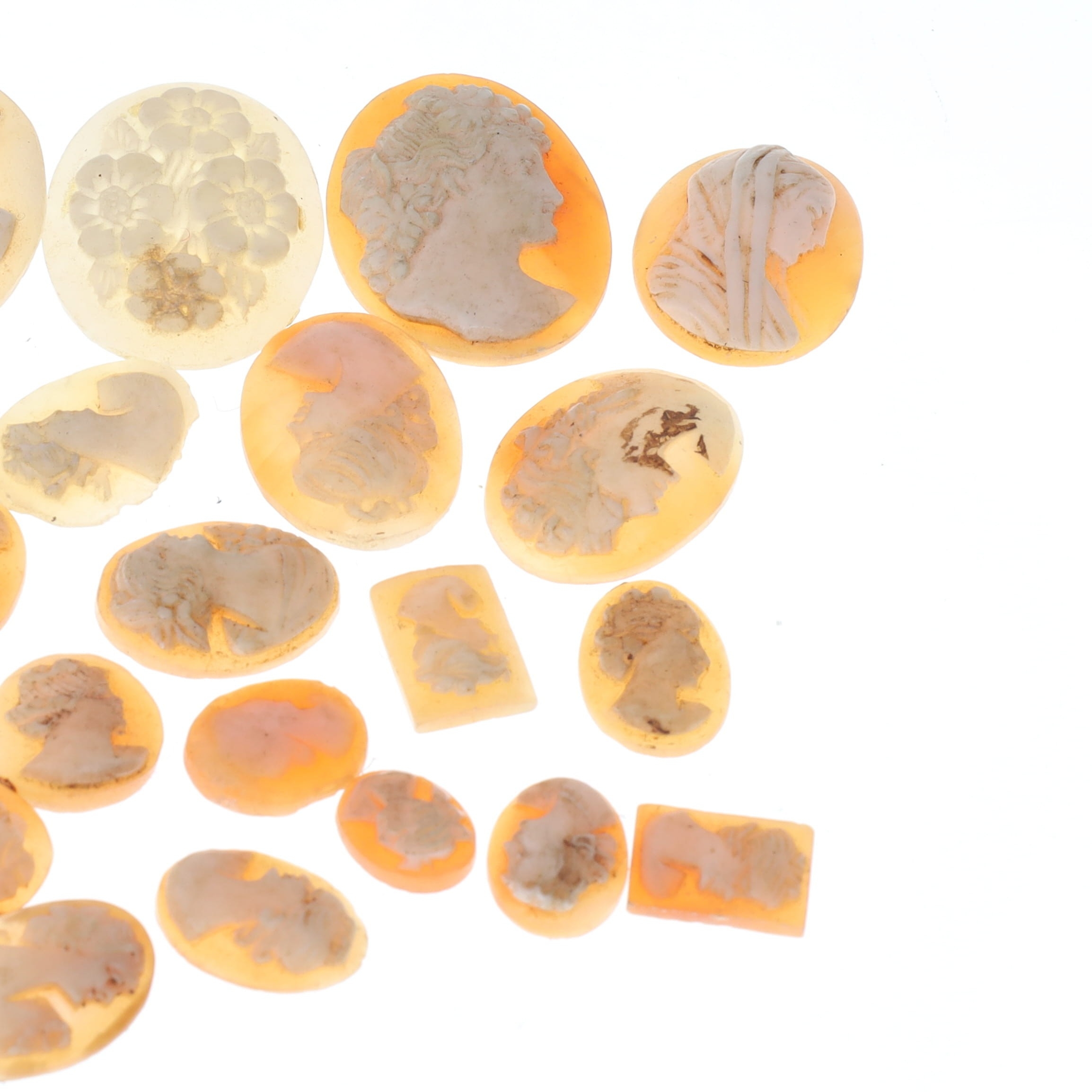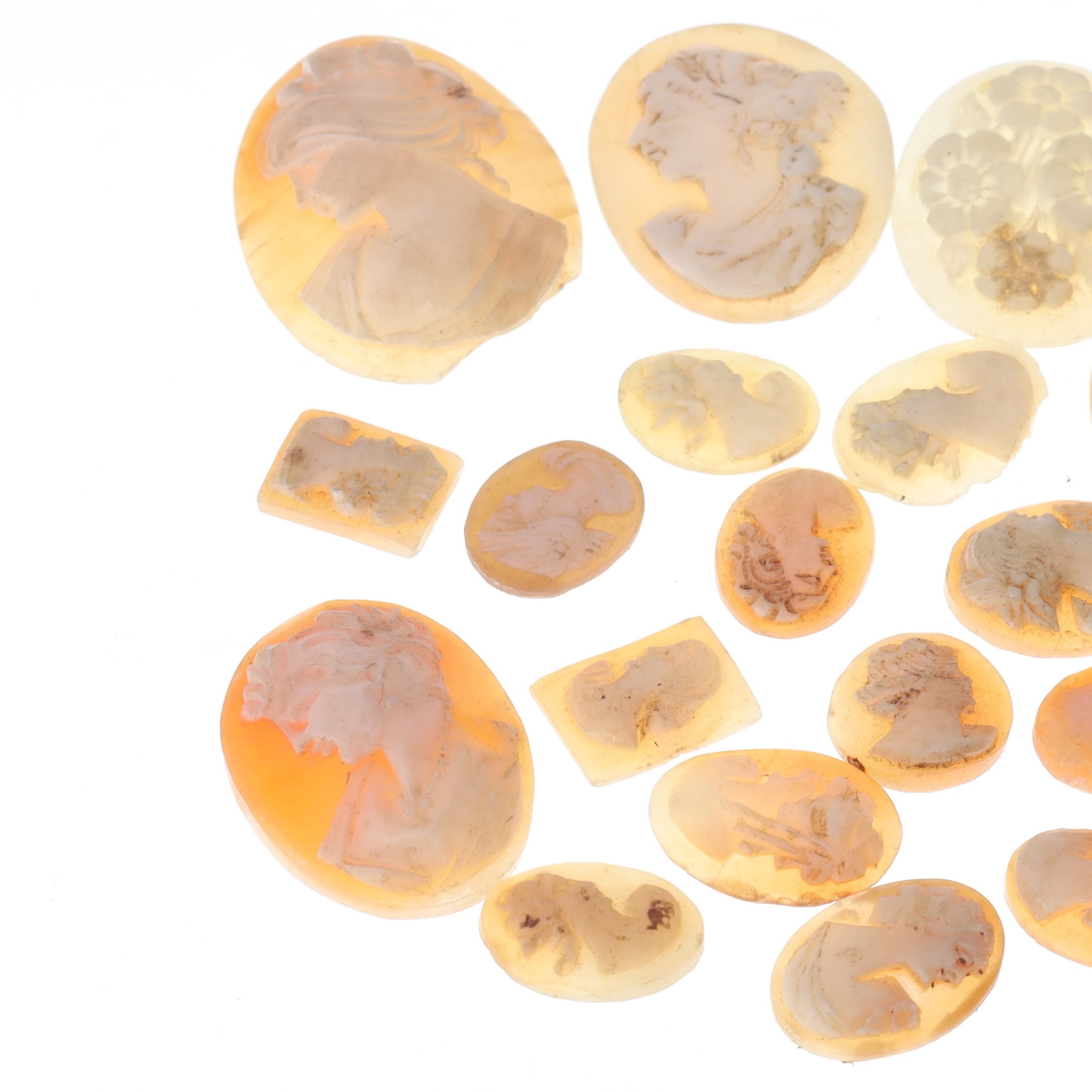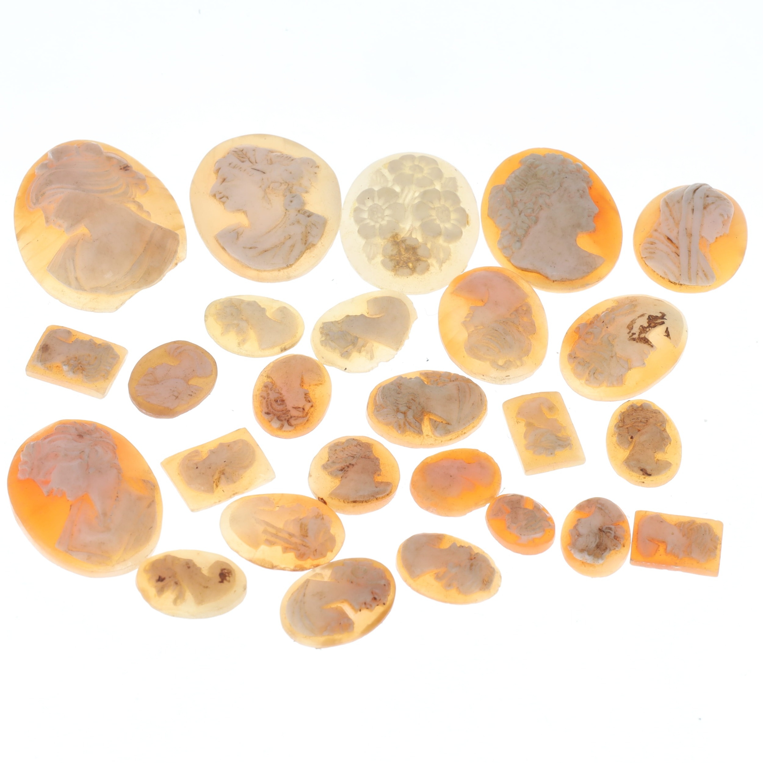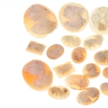Antique Hand Carved Shell Cameo Collection. A collection of antique hand carved shell cameos. Subjects include classical style portraits and flowers. These cameos vary in shape and size, including oval and rectangular, as well as varying shell hues of orange and off-white. Signs of age and wear, including marks and scuffs.