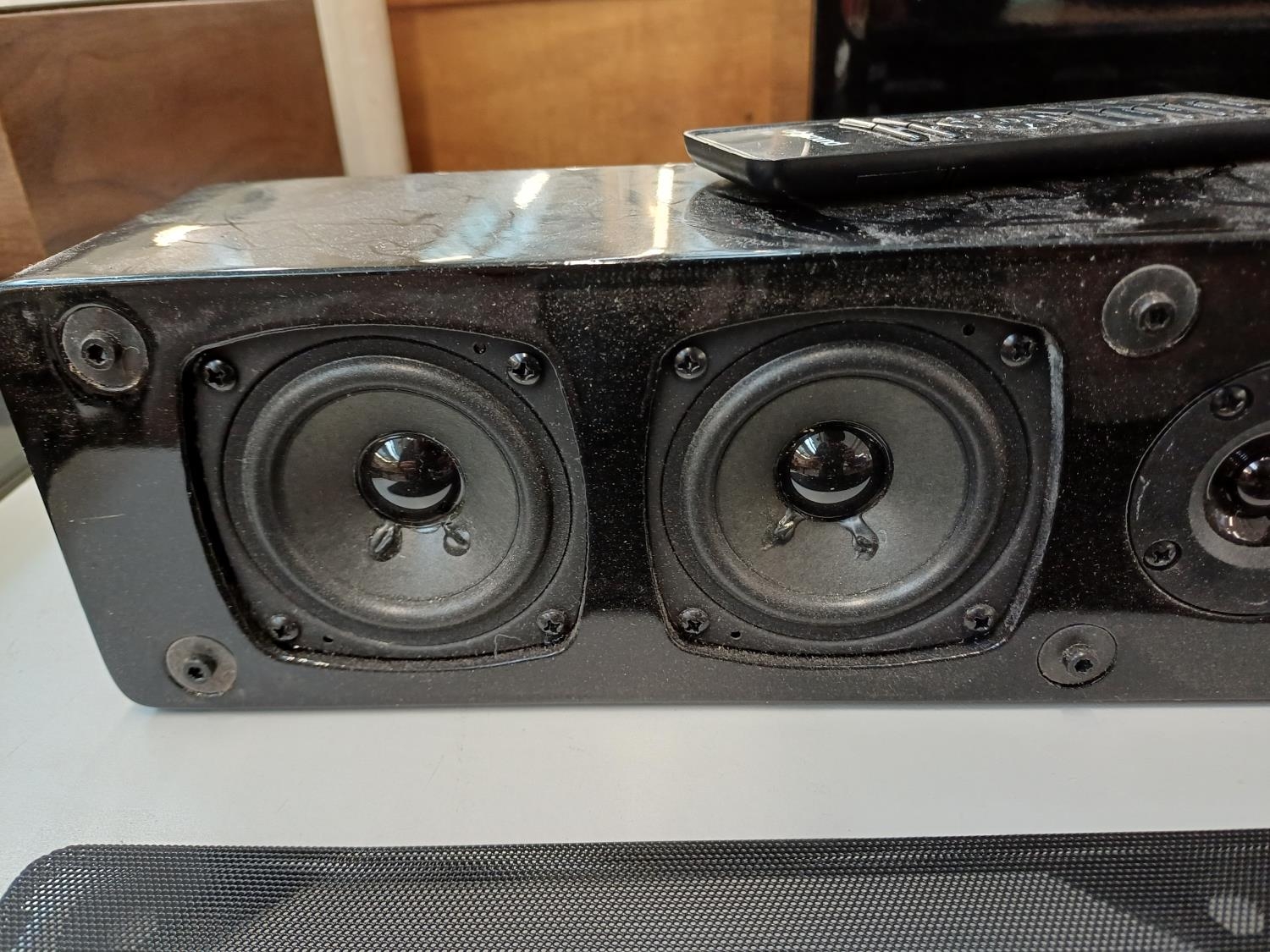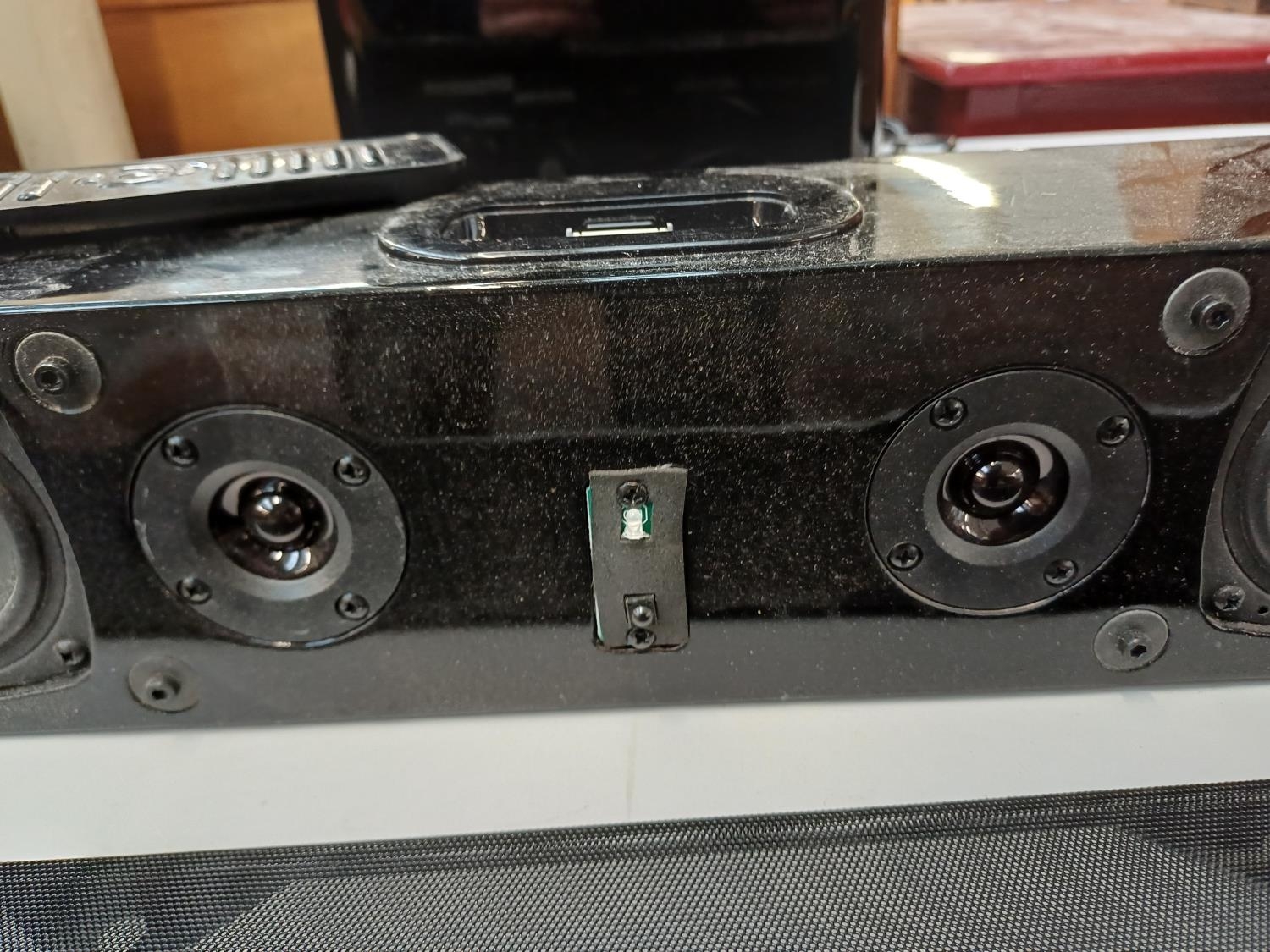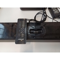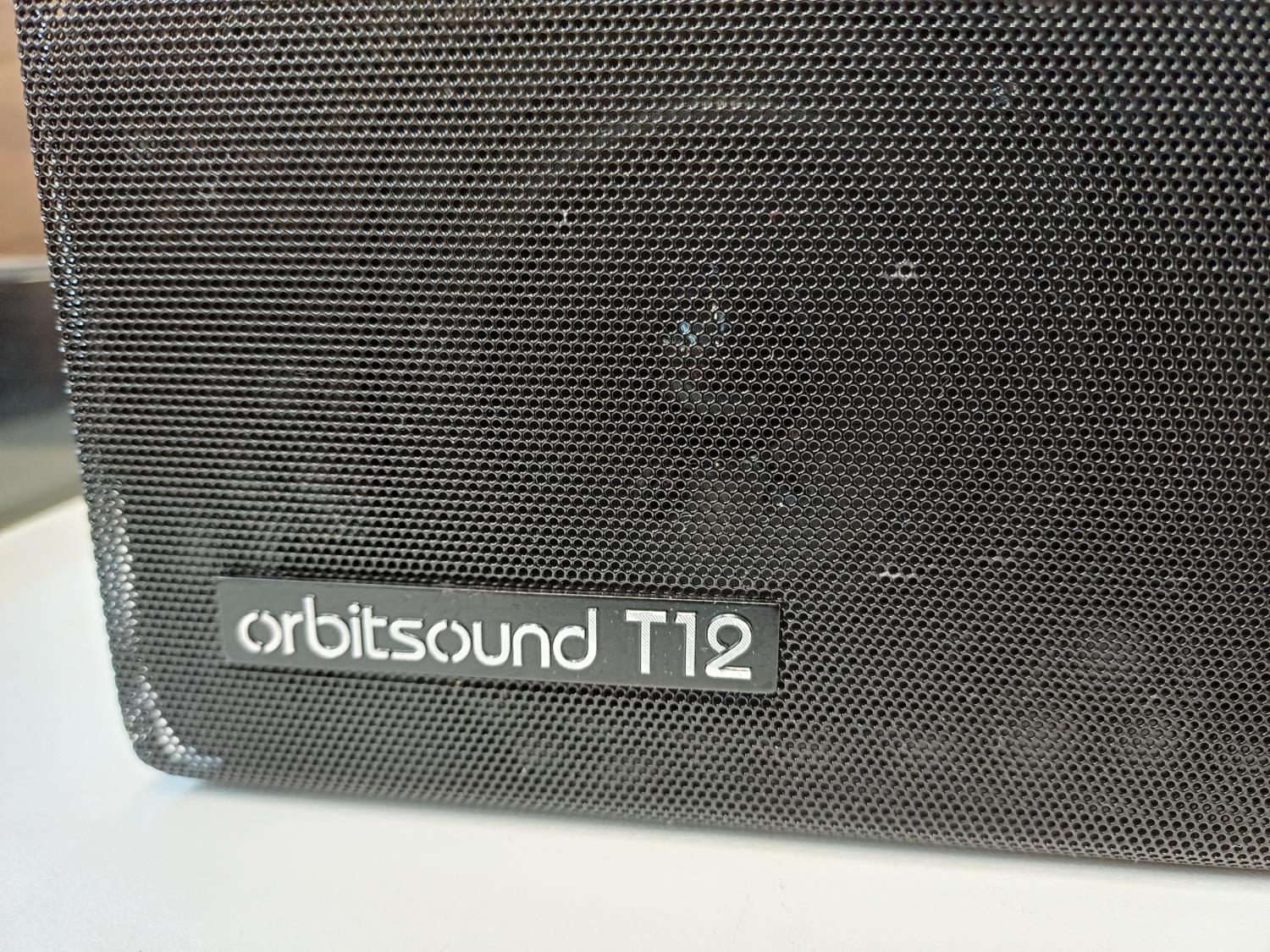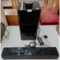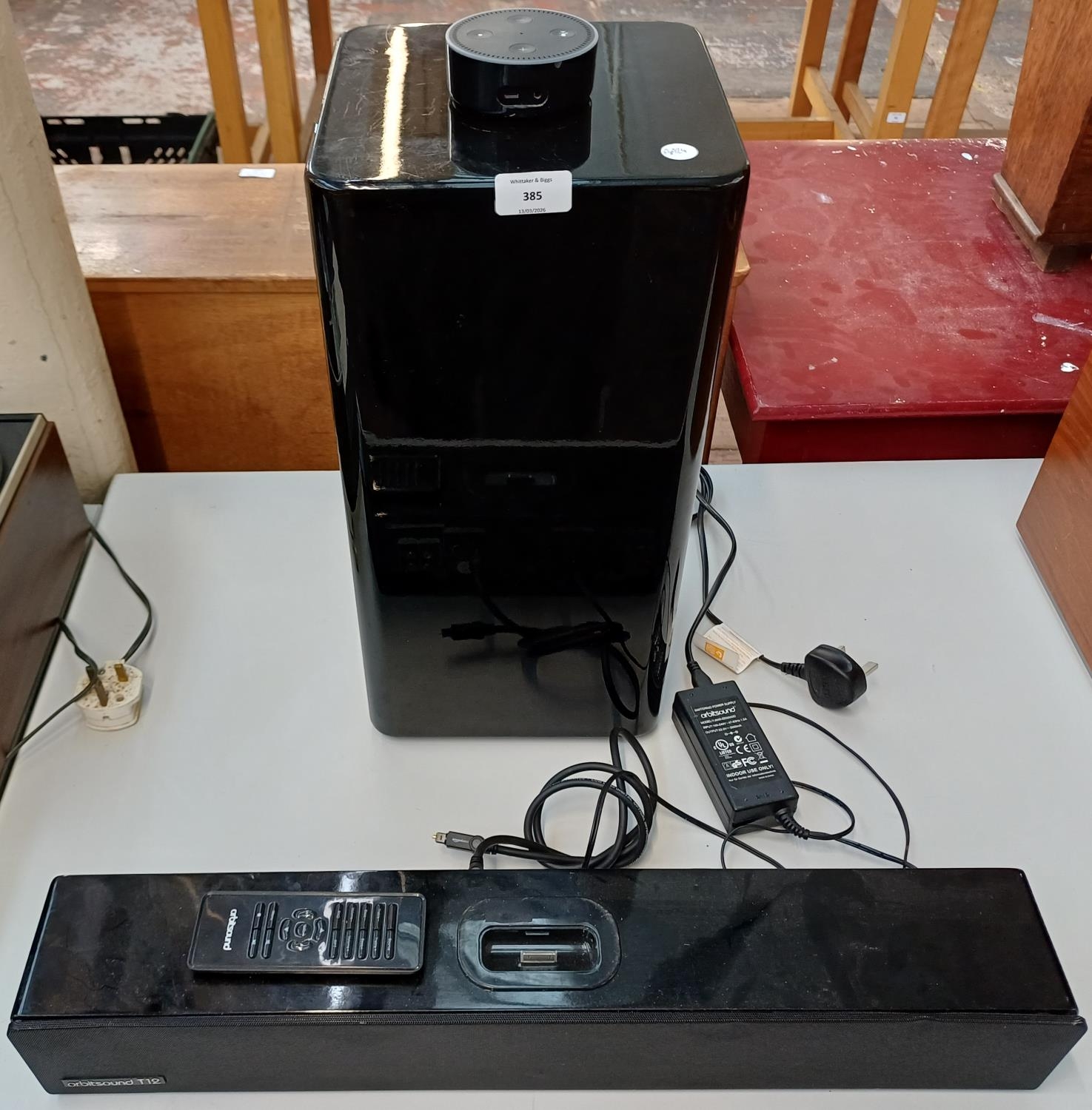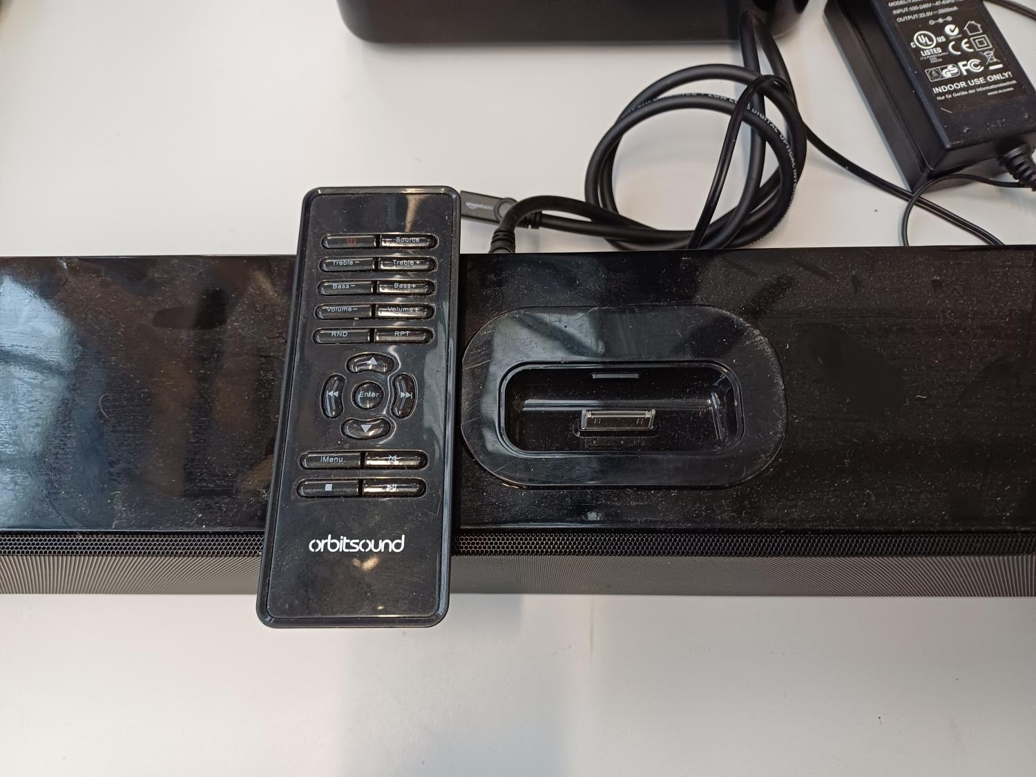Two items, one Orbitsound T12 speaker system comprising subwoofer and soundbar with built-in iPod dock with power adapter and remote control and one Amazon Echo Dot speaker