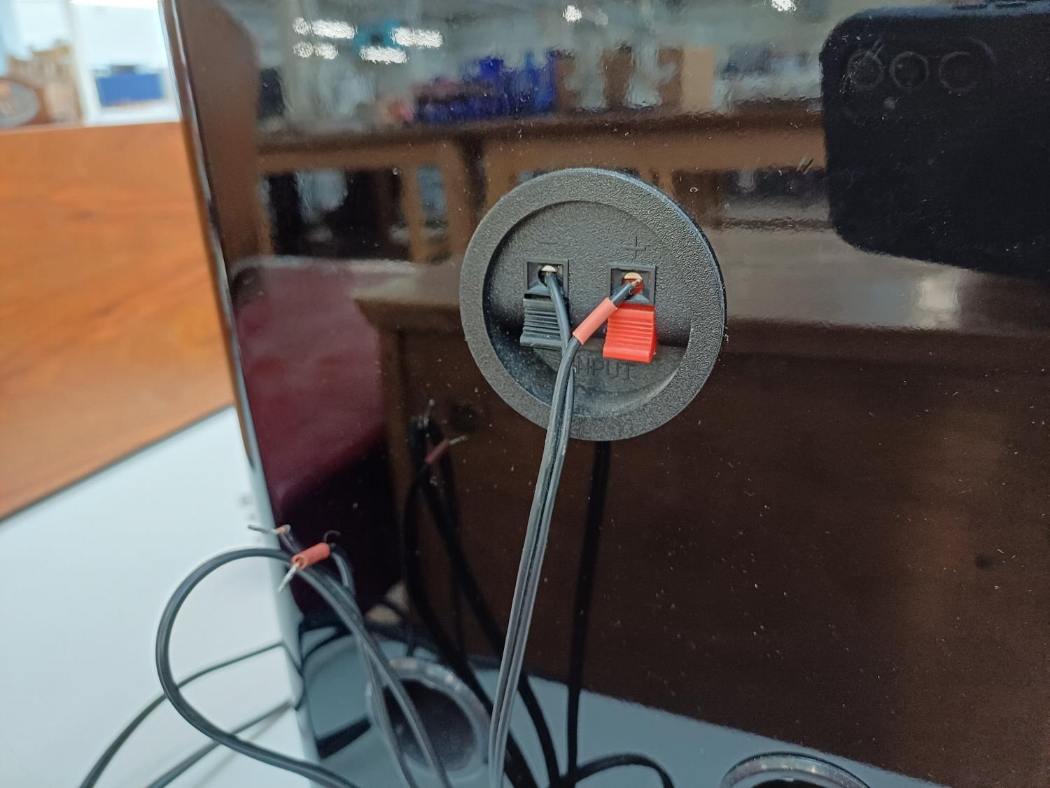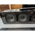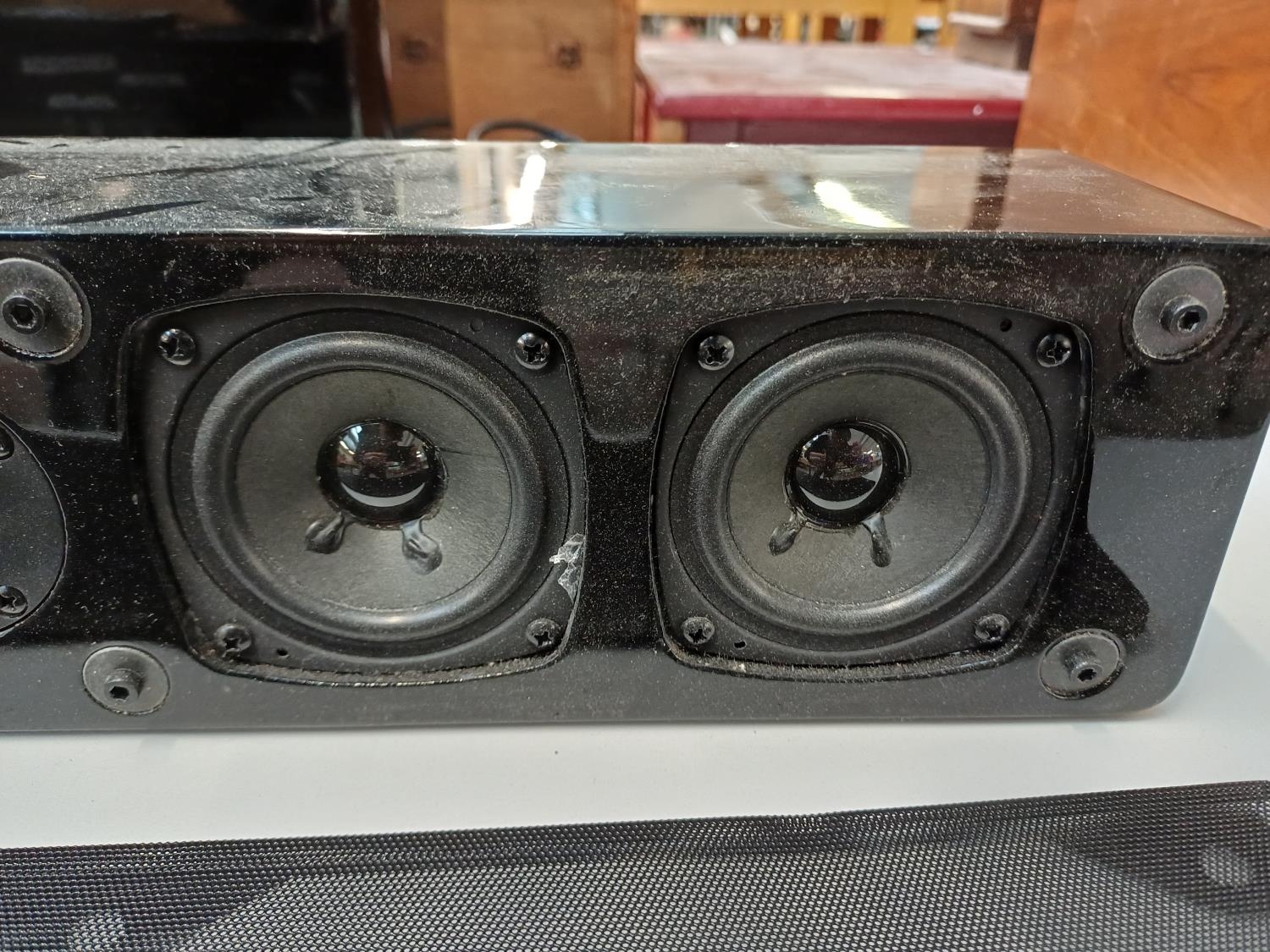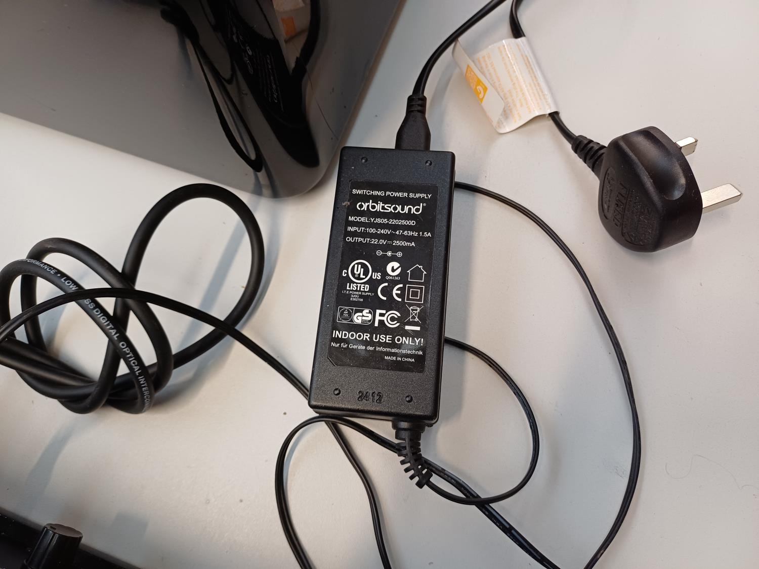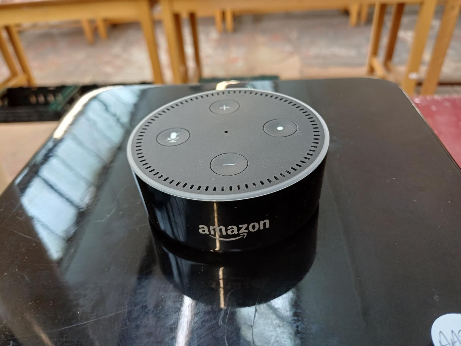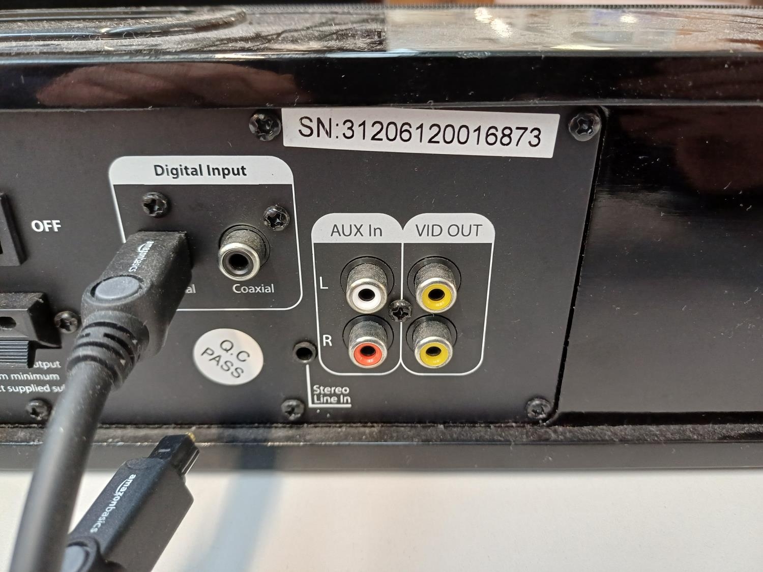 Two items, one Orbitsound T12 speaker system comprising subwoofer and soundbar with built-in iPod dock with power adapter and remote control and one Amazon Echo Dot speaker