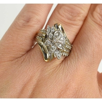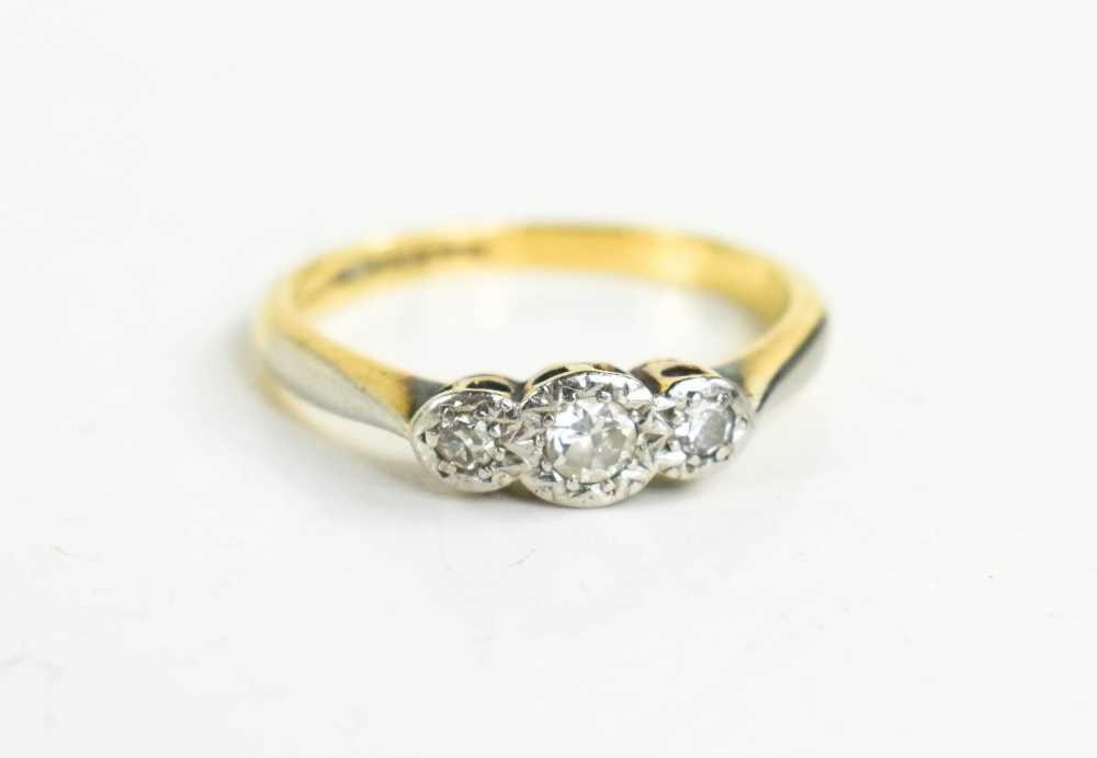 An 18ct gold, platinum and diamond three stone ring, size O, 3.42g.