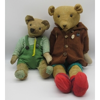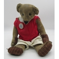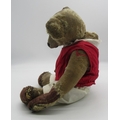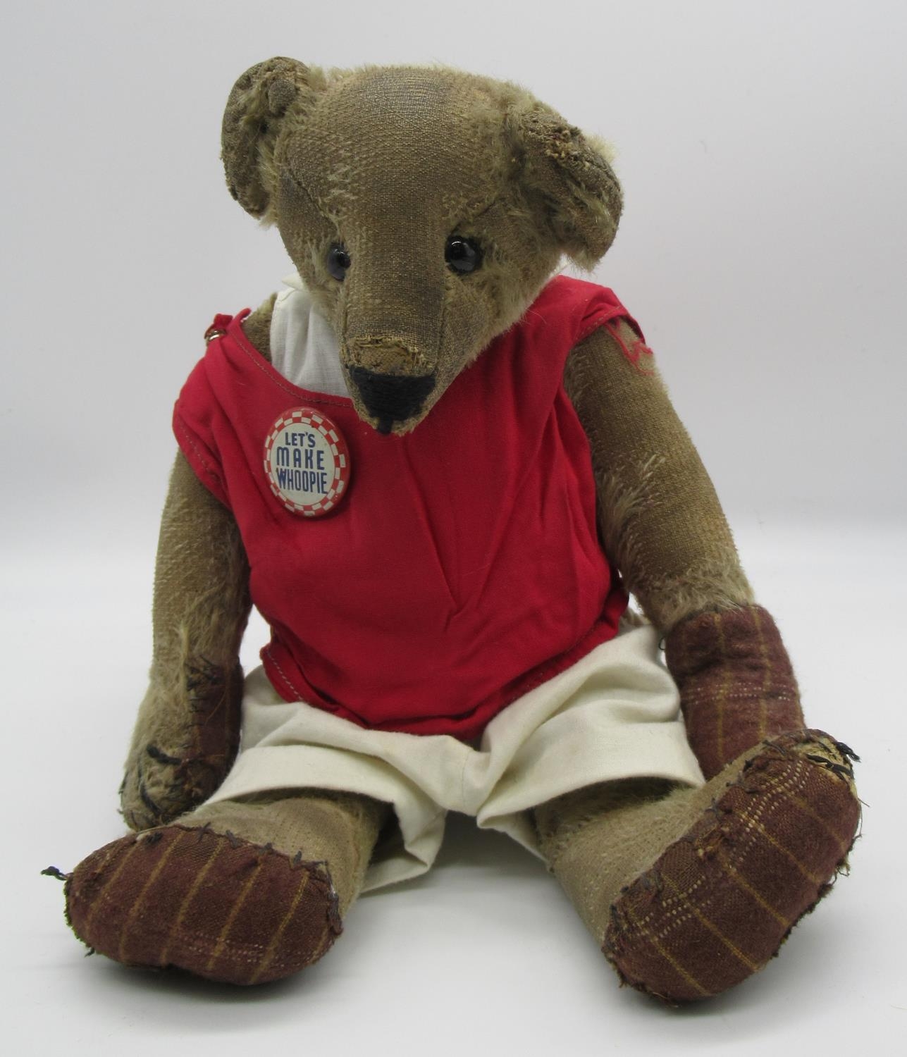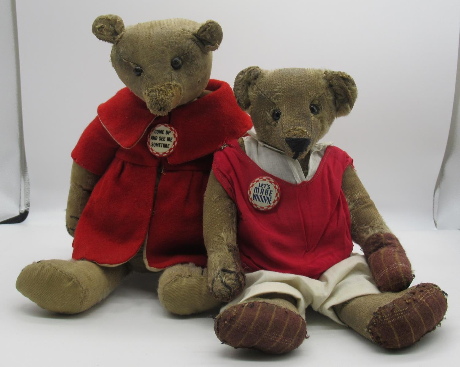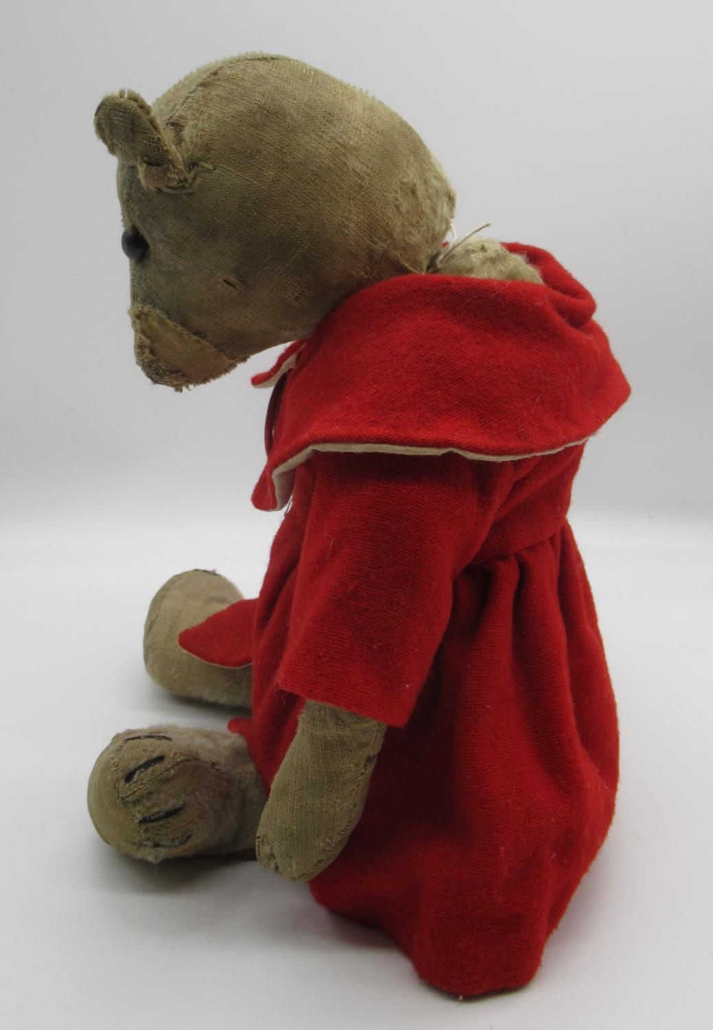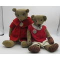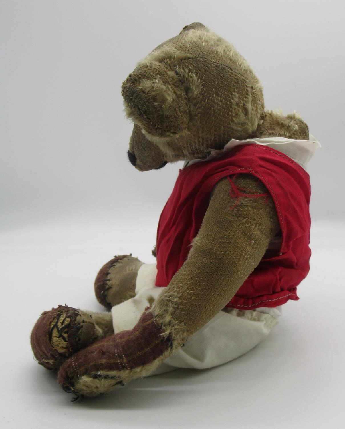 C20th American bear with boot button eyes stitch nose and mouth and hump wearing a pair of white trousers and a red top H30.5cm another C20th teddy bear with boot button eyes with hump possibly American wearing a red coat (2)