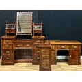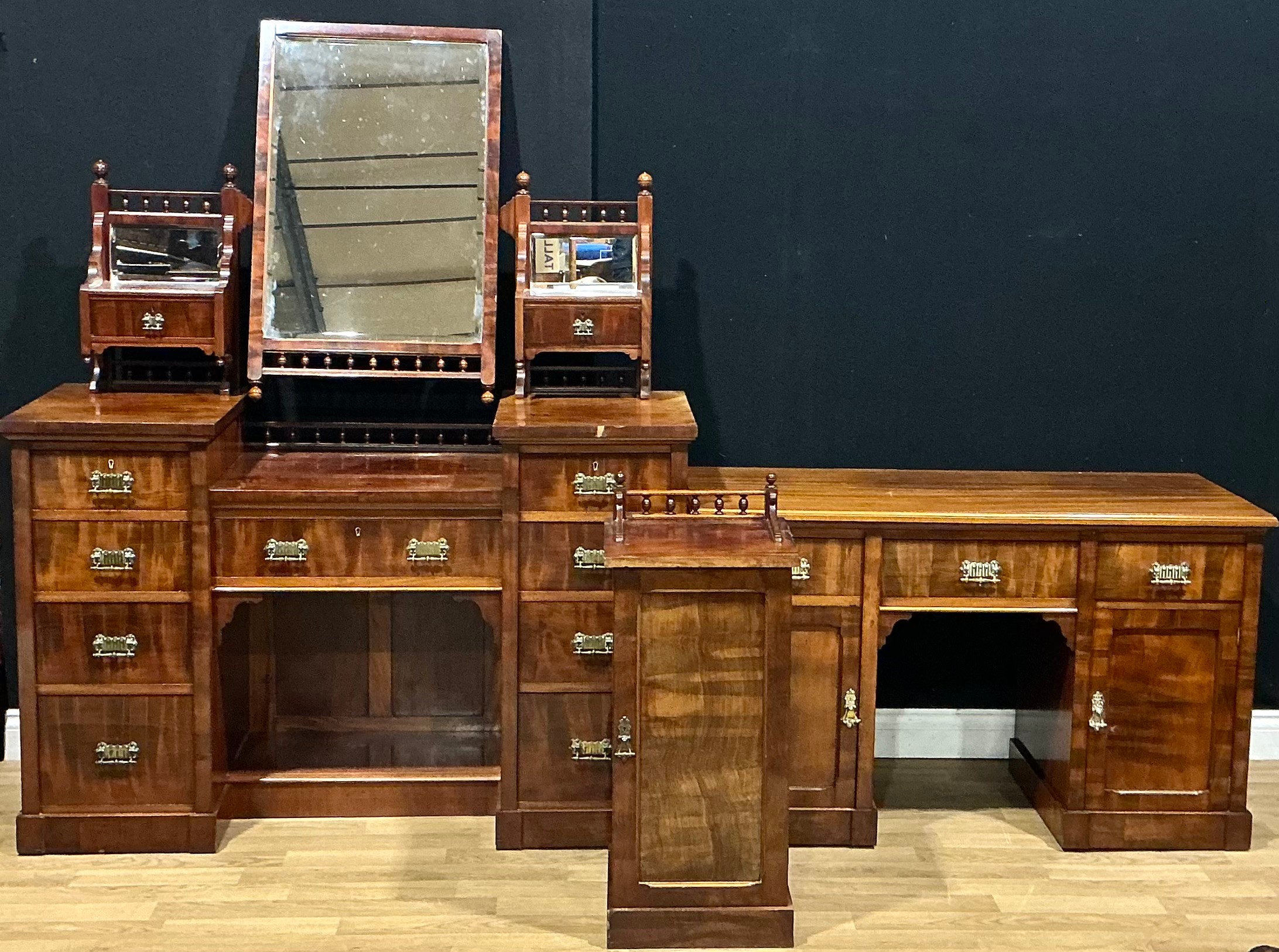 A late Victorian mahogany three-piece bedroom suite, comprising dressing table, kneehole chamber table and bedside cabinet, the dressing table 175cm high, 140cm wide, 53cm deep (3)