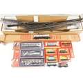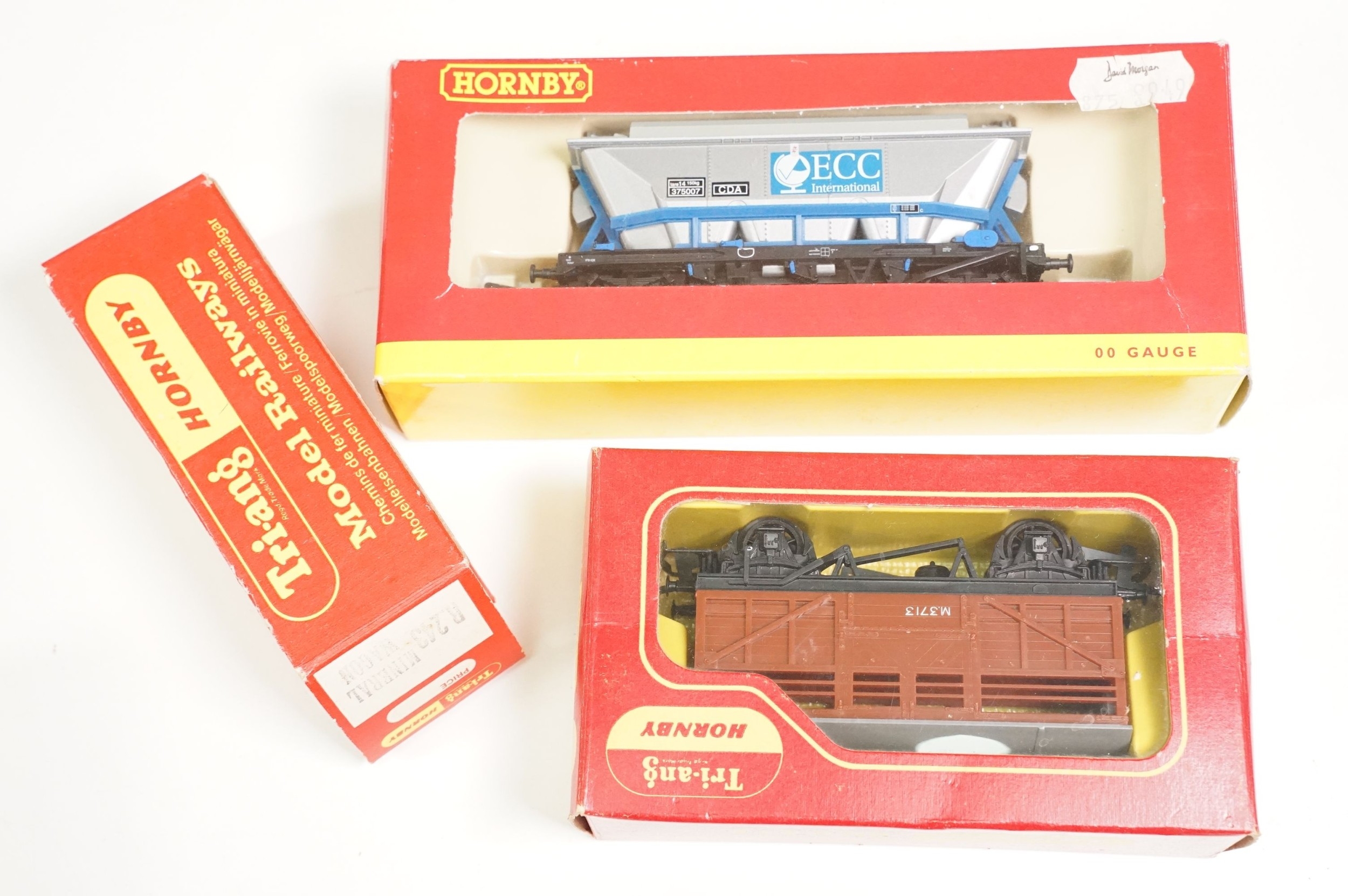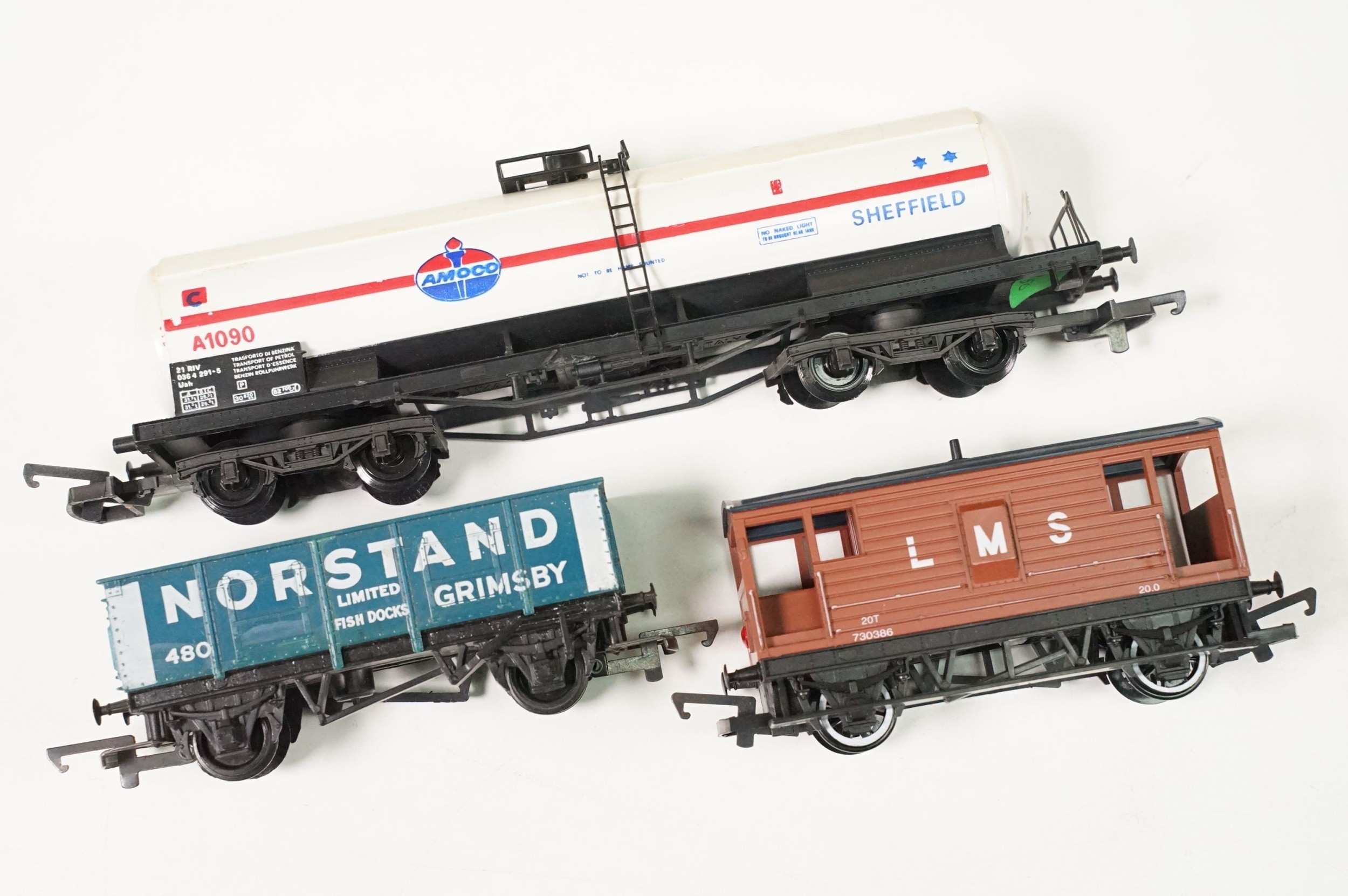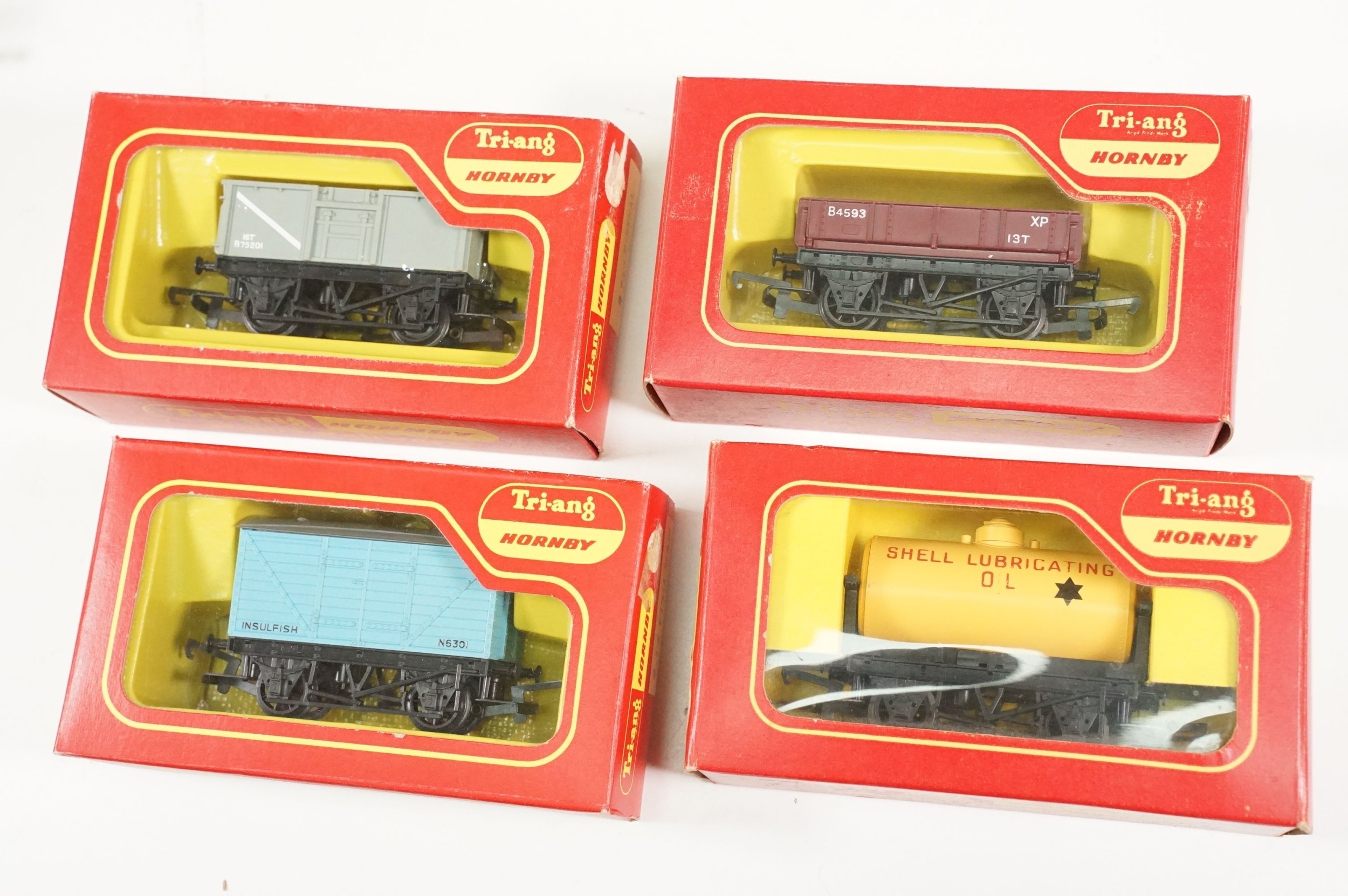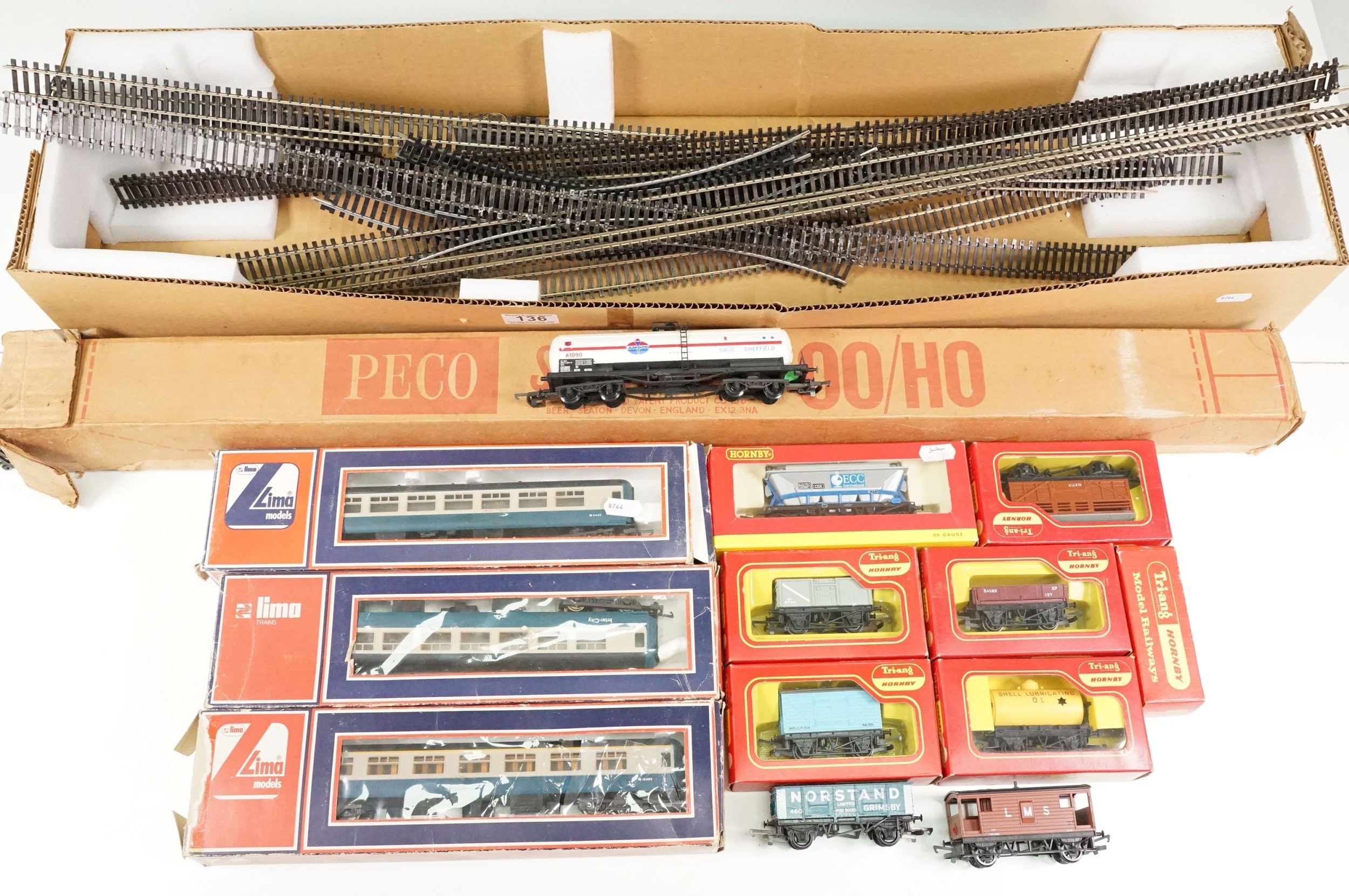 10 Boxed OO gauge items of rolling stock to include 7 x Hornby / Triang and 4 x Lima featuring coaches, wagons and tanker, plus 4 x unboxed items of rolling stock and a quantity of track including boxed Peco Streamline