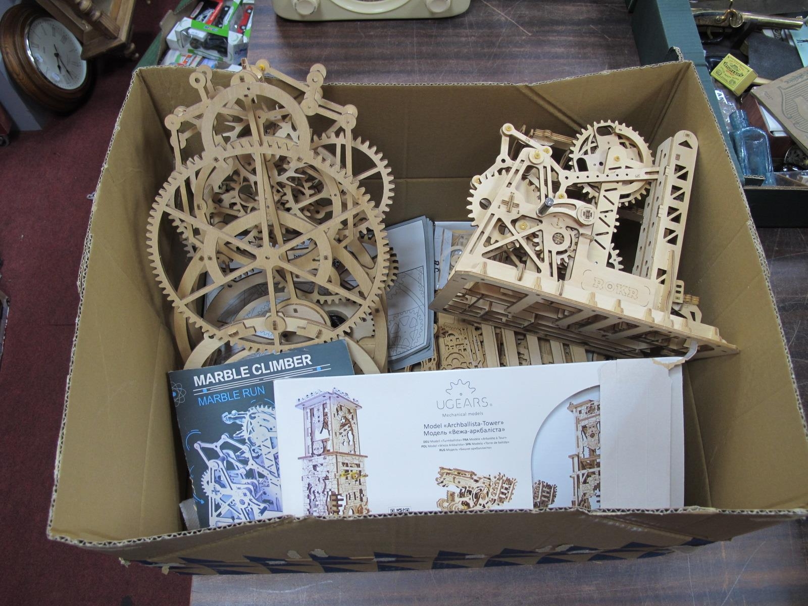 Rokr Marble Climber 3D wooden Puzzle, 33cm high, another smaller and another unassembled (completeness unknown).