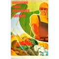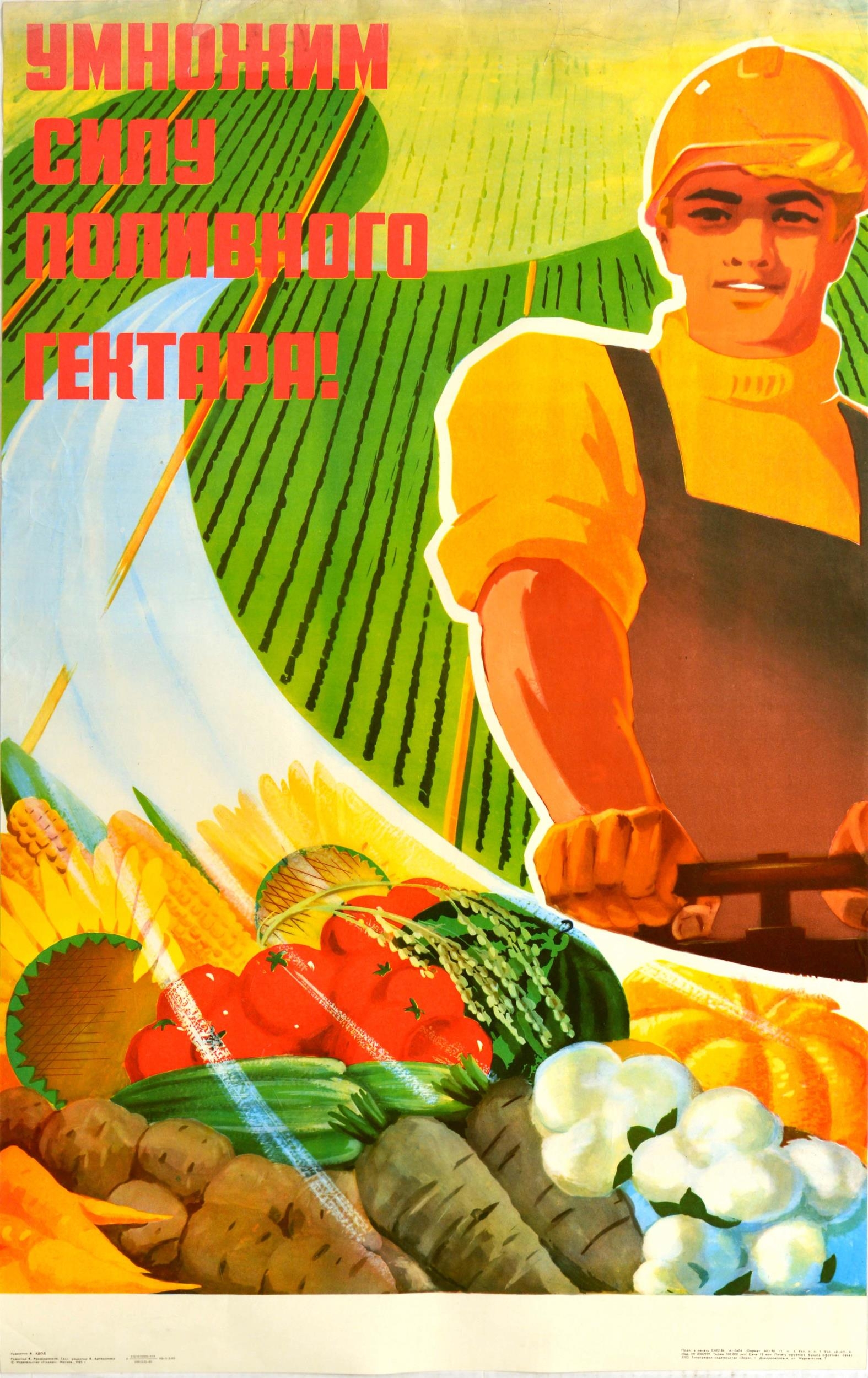 Propaganda Poster Agriculture Crop Yield USSR Farming. Original vintage Soviet propaganda poster - Multiply the Strength of the Irrigated Hectare! - featuring a colourful image of a farmer working on a field with a stream of water showing the fresh food produce of different fruit and vegetables including tomatoes, a watermelon, potatoes, turnips, carrots and corn. Good condition, creasing, repaired tears. Country of issue: Russia, designer: V. Odod, size (cm): 87x55, year of printing: 1985.