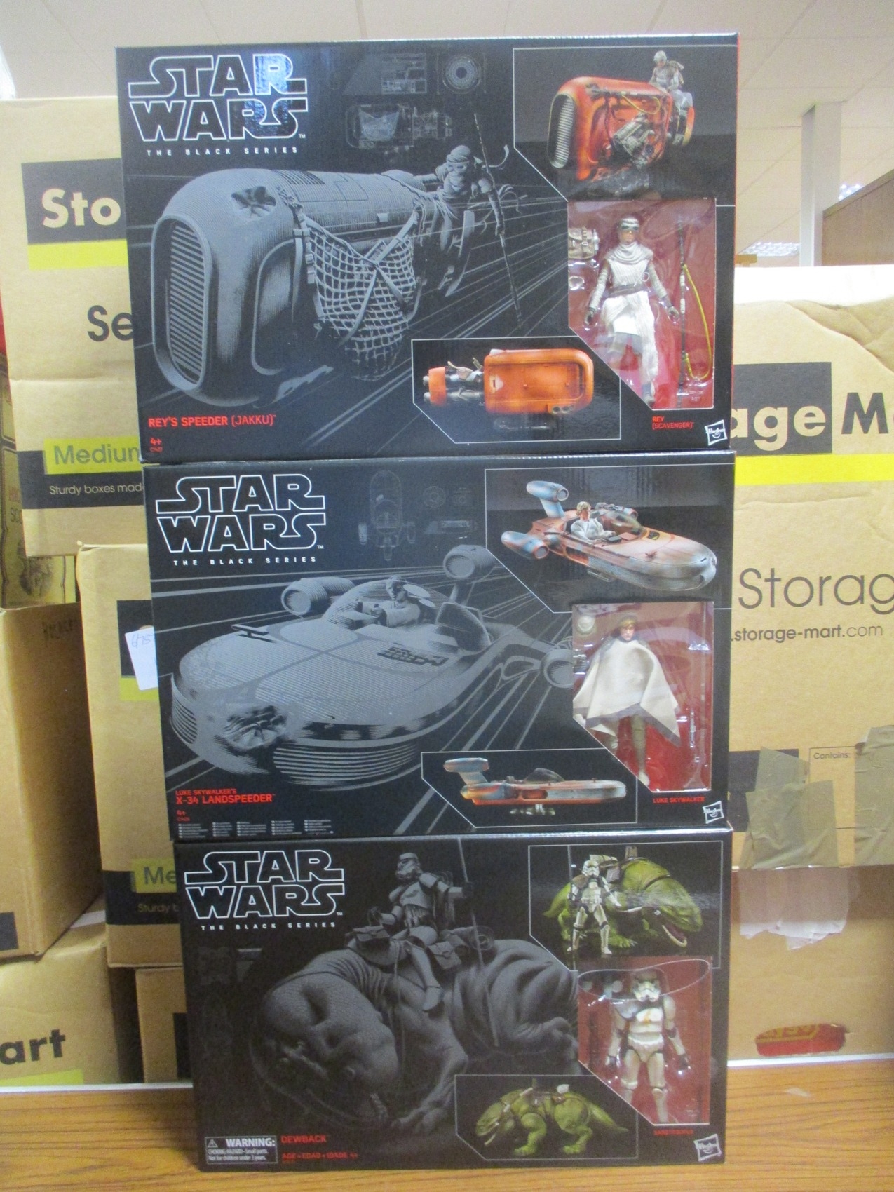 Star Wars. Hasbro. The Black Series range, generally mint in near mint boxes, with Dewback, Luke Skywalker's X-34 Landspeeder and Rey's Speeder (Jakku). Qty 3 (B)