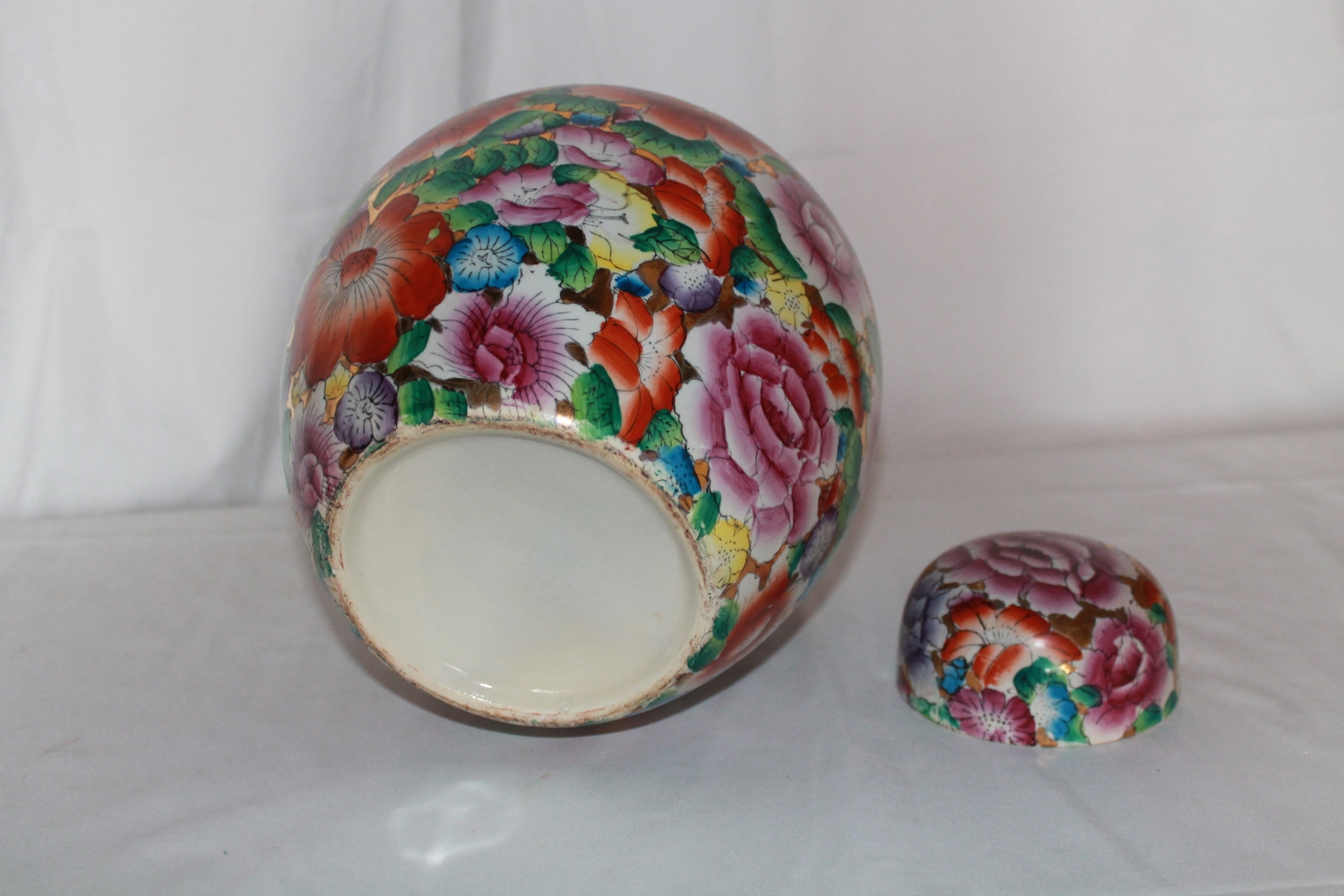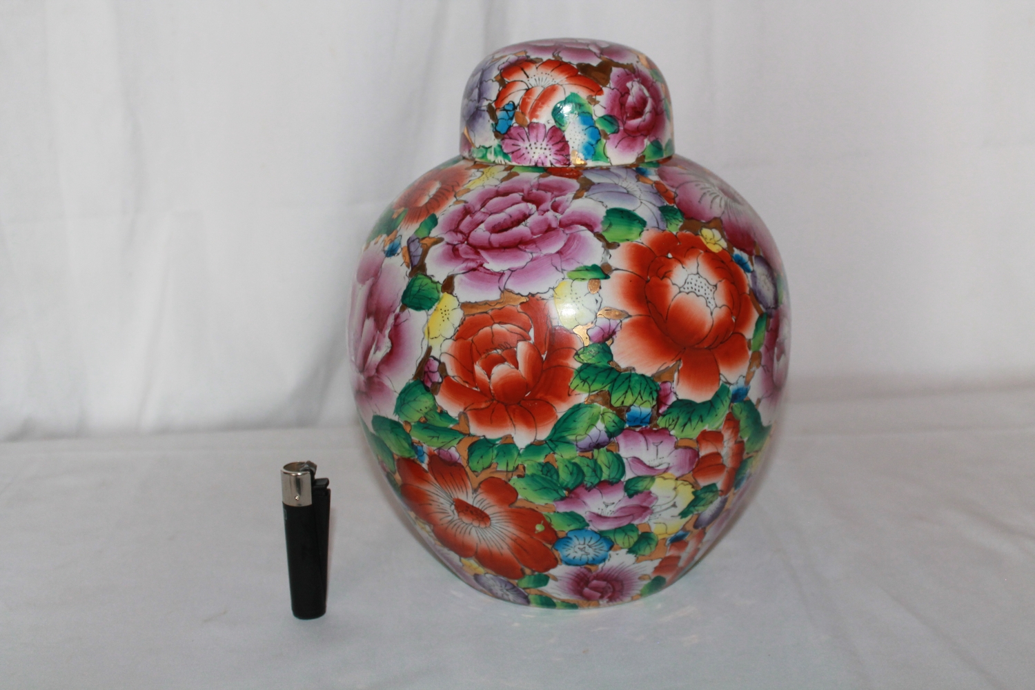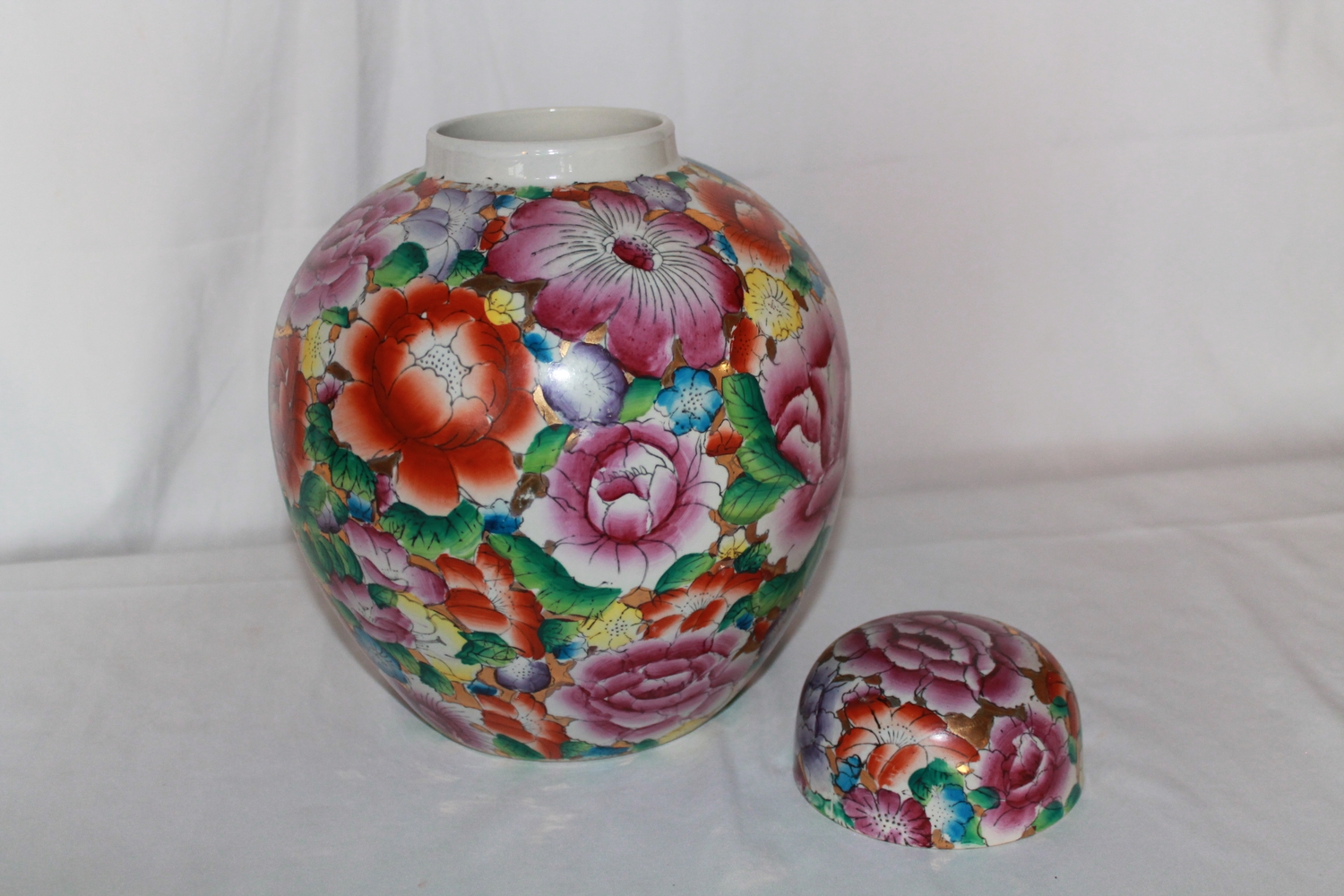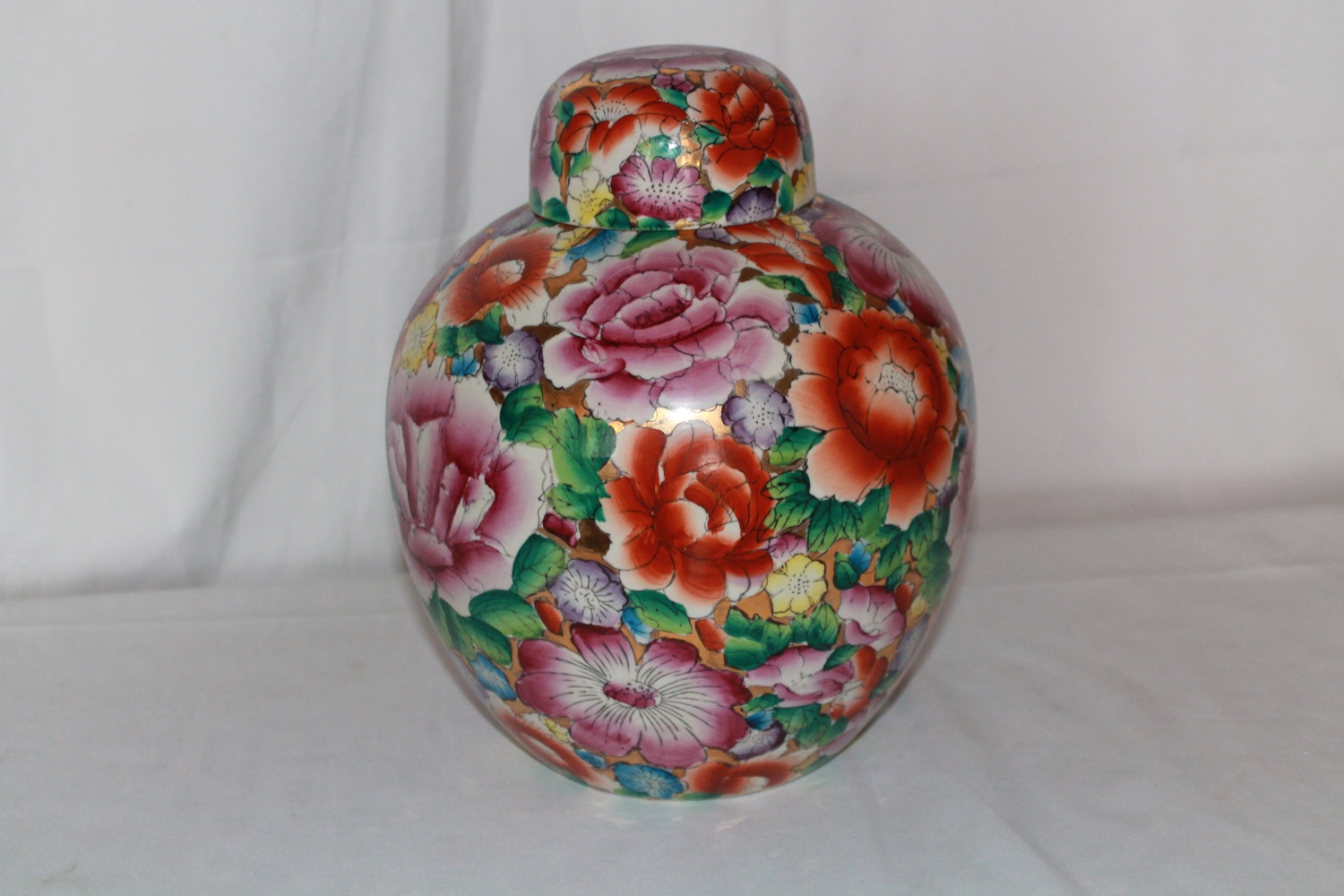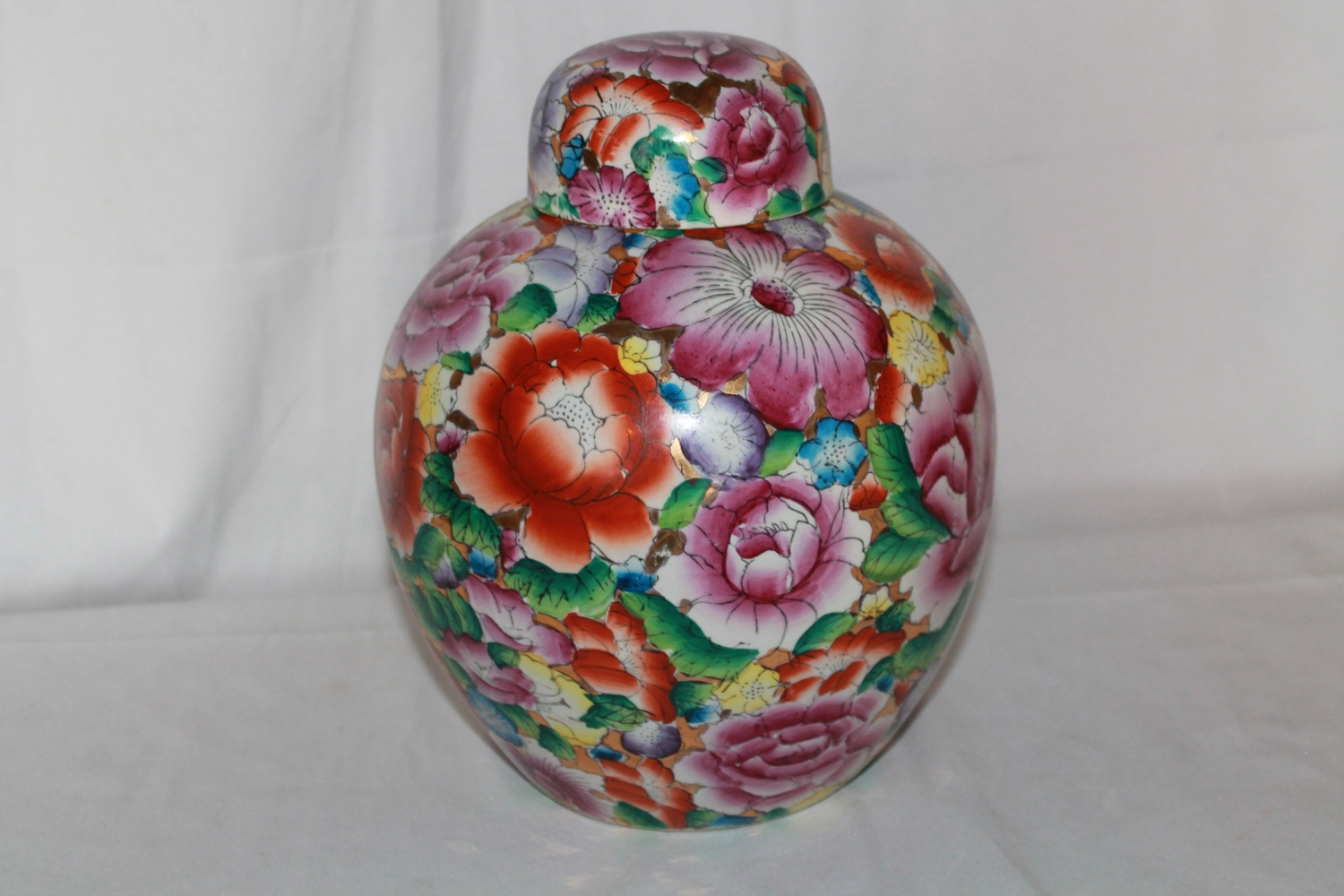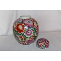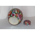 An extremely large mille fleur ginger jar circa 1980. The flowers beautifully executed against a gilt background.