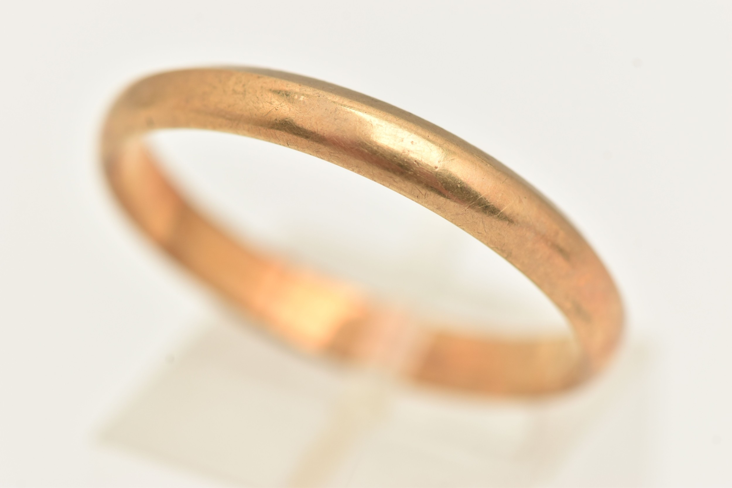 A 14CT YELLOW GOLD BAND RING, approximate width 3mm, hallmarked 14ct London import, ring size V 1/2, approximate gross weight 3.4 grams, (condition report: heavy wear to one side profile of the ring)
